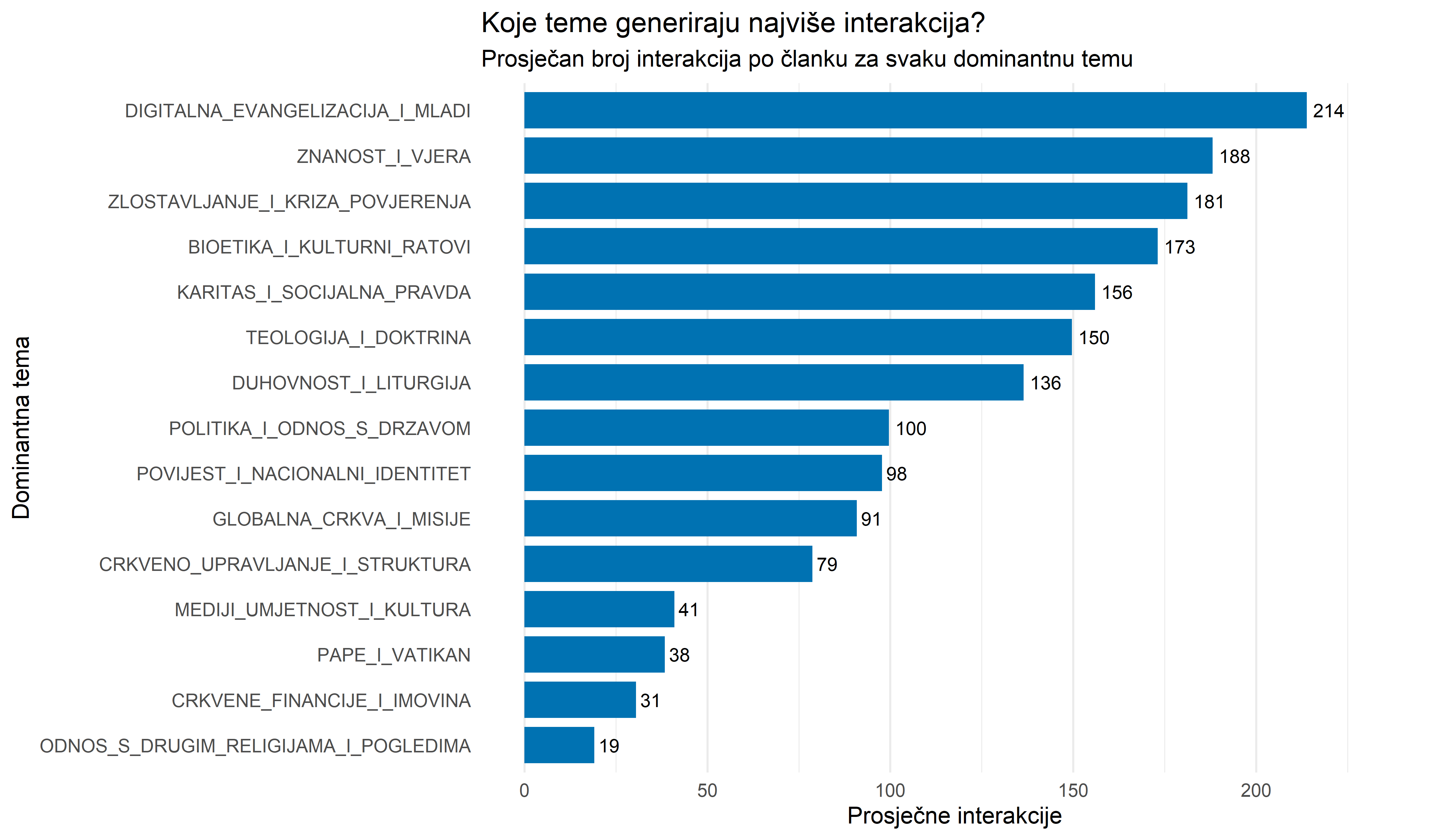 Analiza prosječnog broja interakcija po članku otkriva da teme koje se tiču unutarcrkvenih prijepora, bioetike i skandala generiraju značajno veći angažman od tema vezanih za duhovnost ili institucionalno funkcioniranje. Ovo ukazuje da konflikt i kontroverza služe kao ključni pokretači interakcija u digitalnom prostoru.
