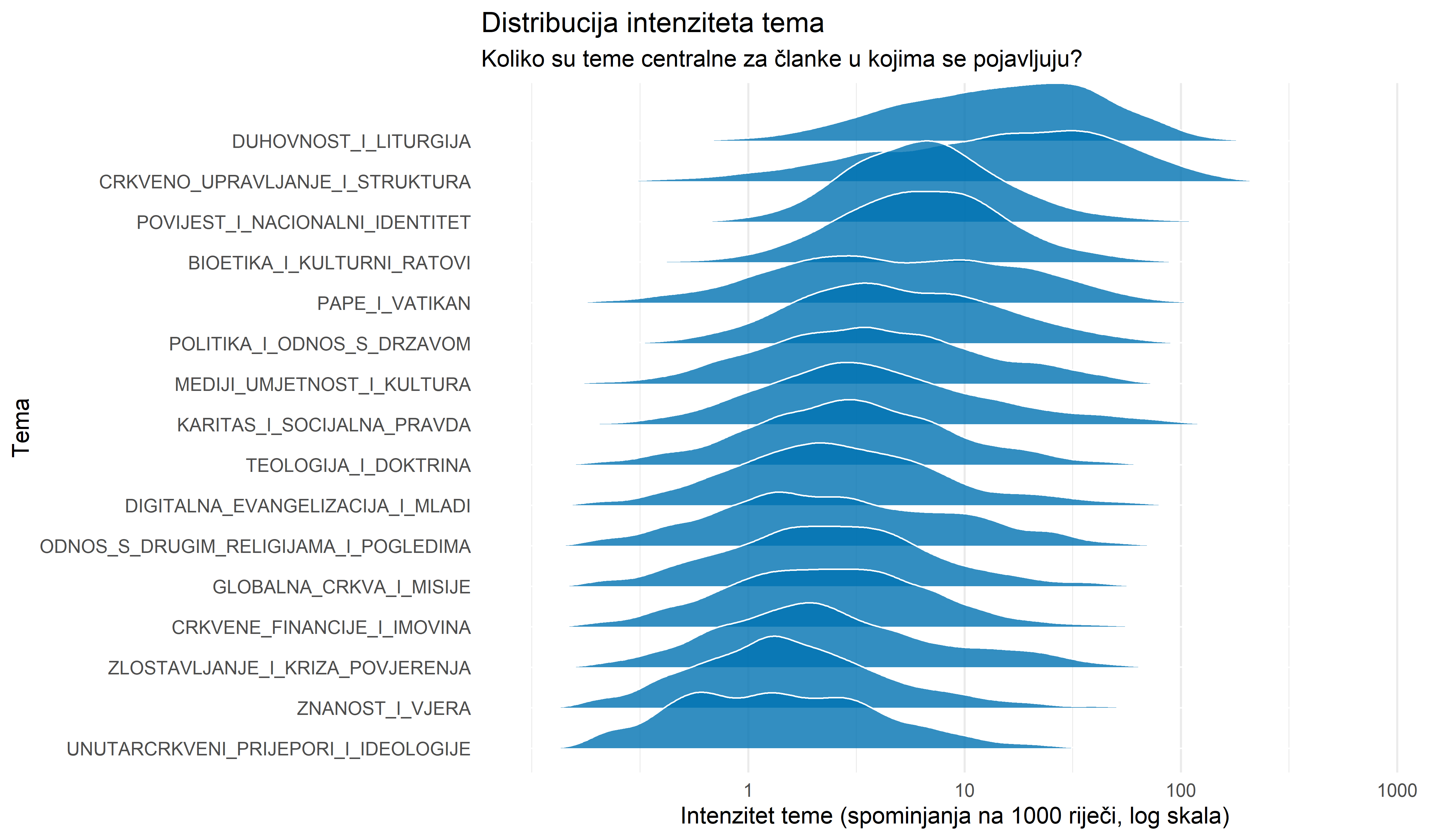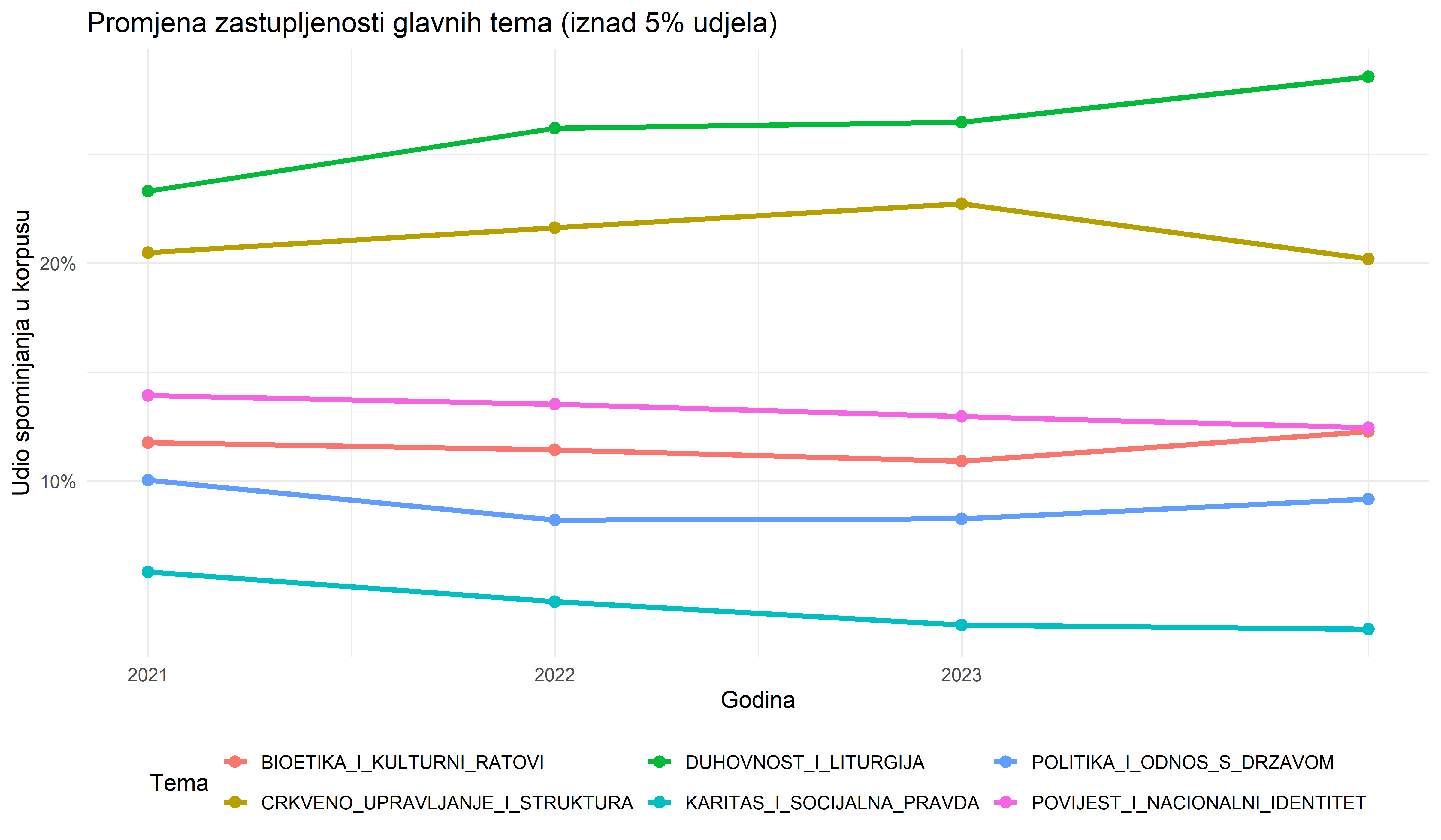 Analiza udjela svake teme u ukupnom broju spominjanja otkriva stabilnu strukturu, ali i suptilne promjene. Očekivano, teme vezane za Duhovnost i liturgiju te Crkvenu instituciju čine okosnicu diskursa. Značajan udio zauzimaju i teme koje povezuju Crkvu s društvom, poput Politike i Bioetike.