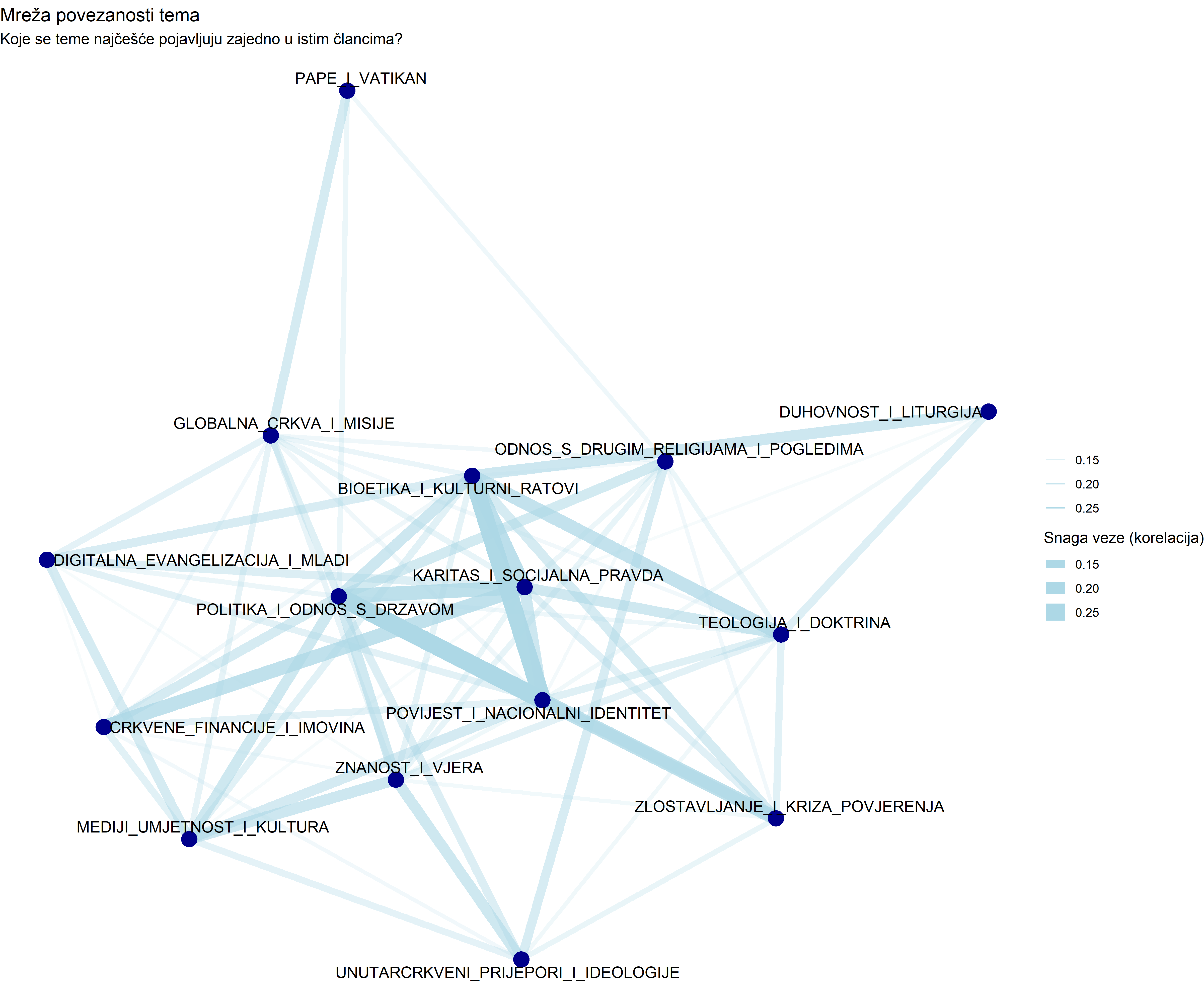 Teme se rijetko pojavljuju izolirano. One se spajaju u šire narativne okvire (frames). Analizom ko-okurencije tema unutar istih članaka, možemo mapirati te veze. Mreža pokazuje snažnu povezanost između Politike, Povijesti i Bioetike, tvoreći dominantan “društveno-politički” klaster. S druge strane, teme poput Duhovnosti i Karitasa čine zaseban, “pastoralni” klaster.