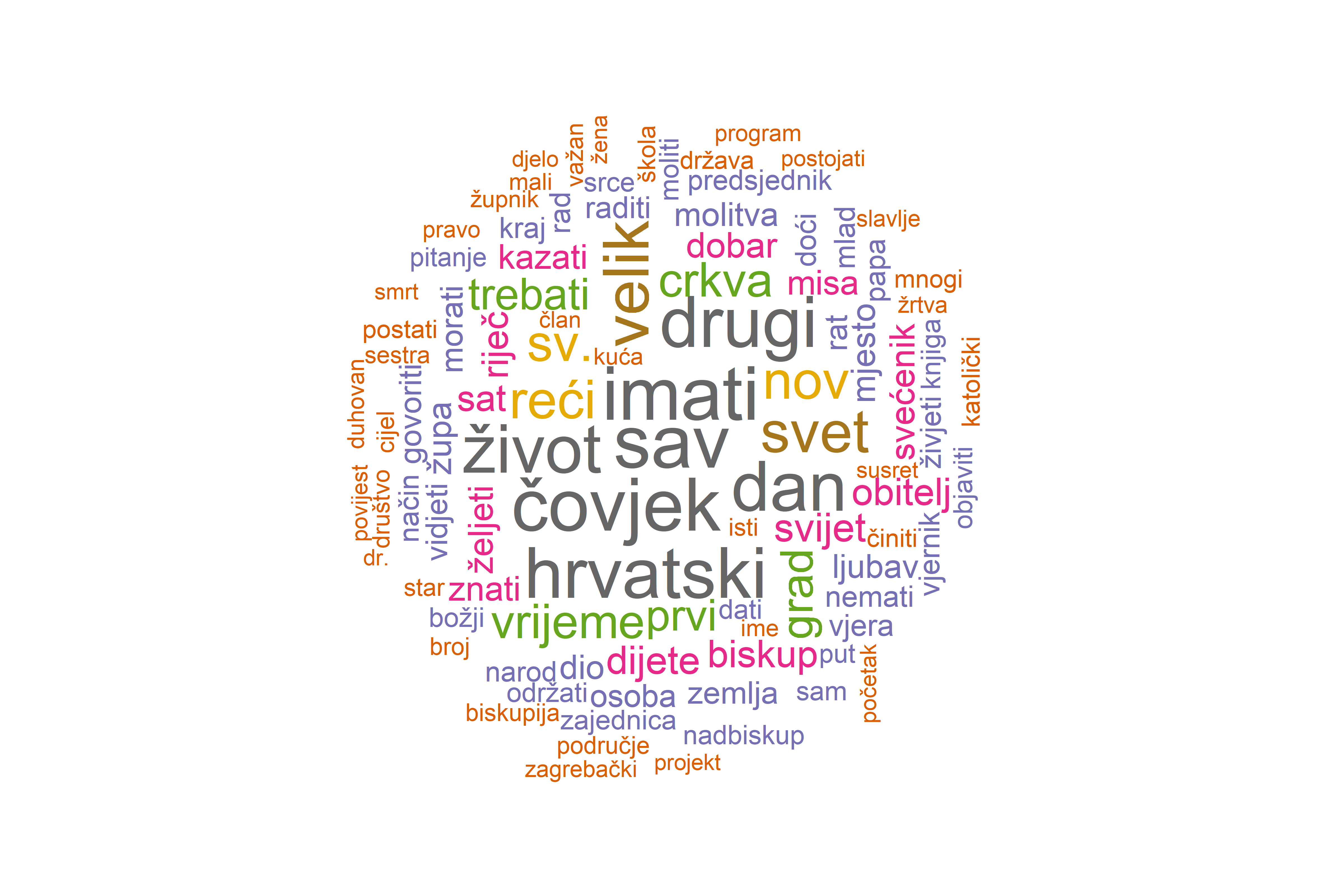 Ovaj vizualni sažetak odmah otkriva ključne entitete i koncepte koji čine srž diskursa: crkva, papa, biskup, Hrvatska, život, godina, čovjek, vjera i molitva.