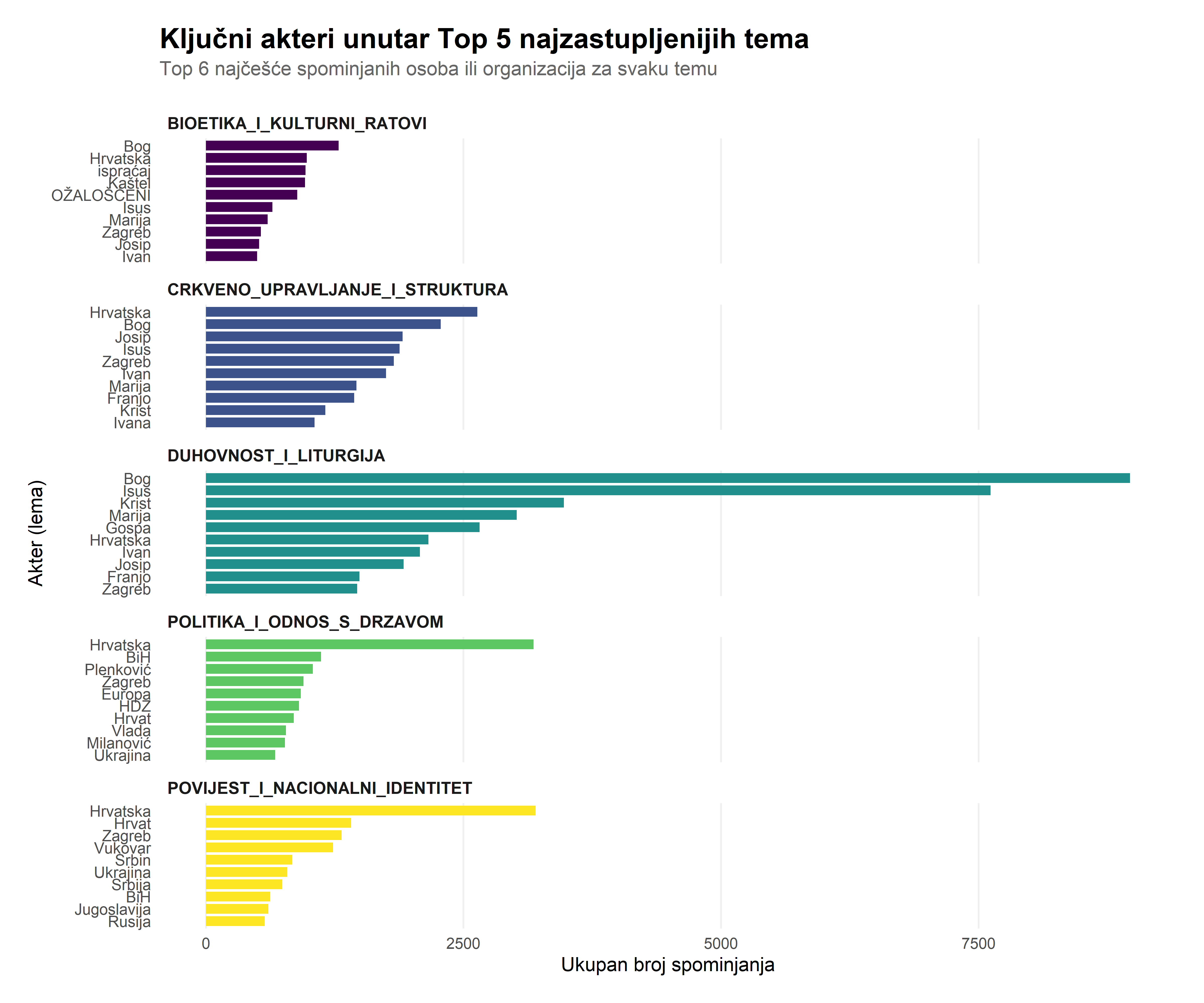 Svaka tematska “priča” ima svoje glavne likove. Analizom najčešće spominjanih osoba i organizacija unutar svake dominantne teme, dobivamo uvid u to tko su nositelji narativa. Očekivano, političari dominiraju političkim temama, dok crkveni velikodostojnici dominiraju institucionalnim.