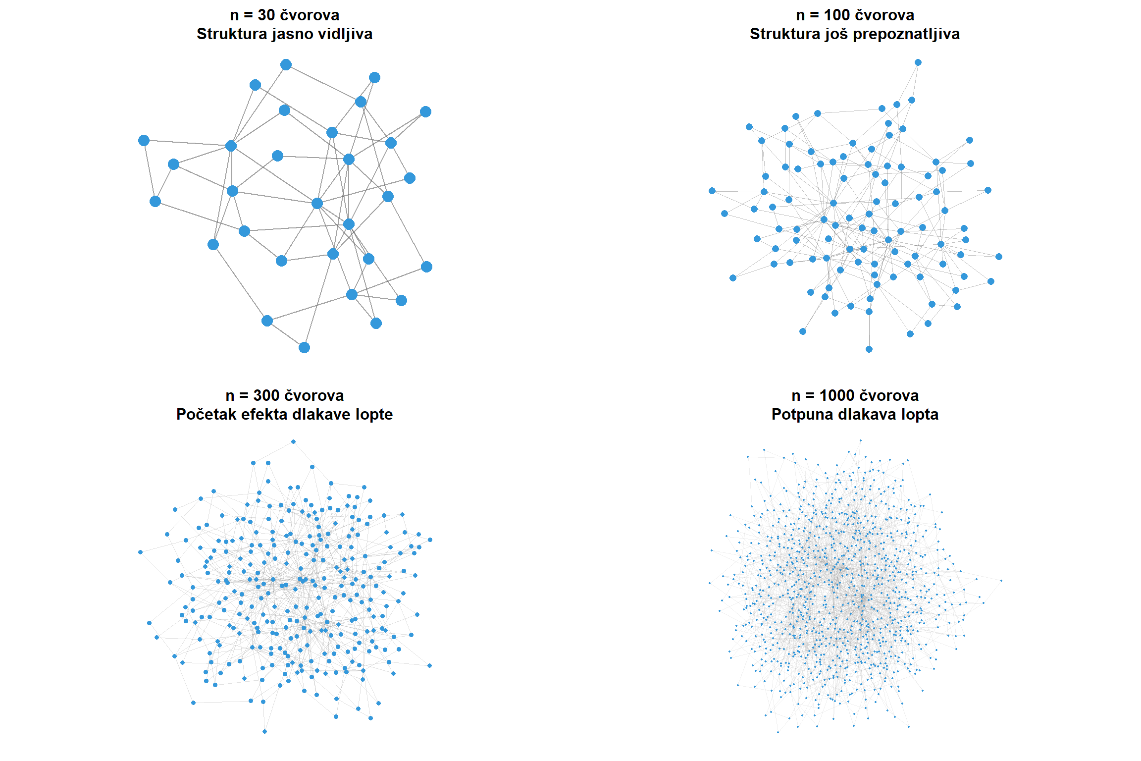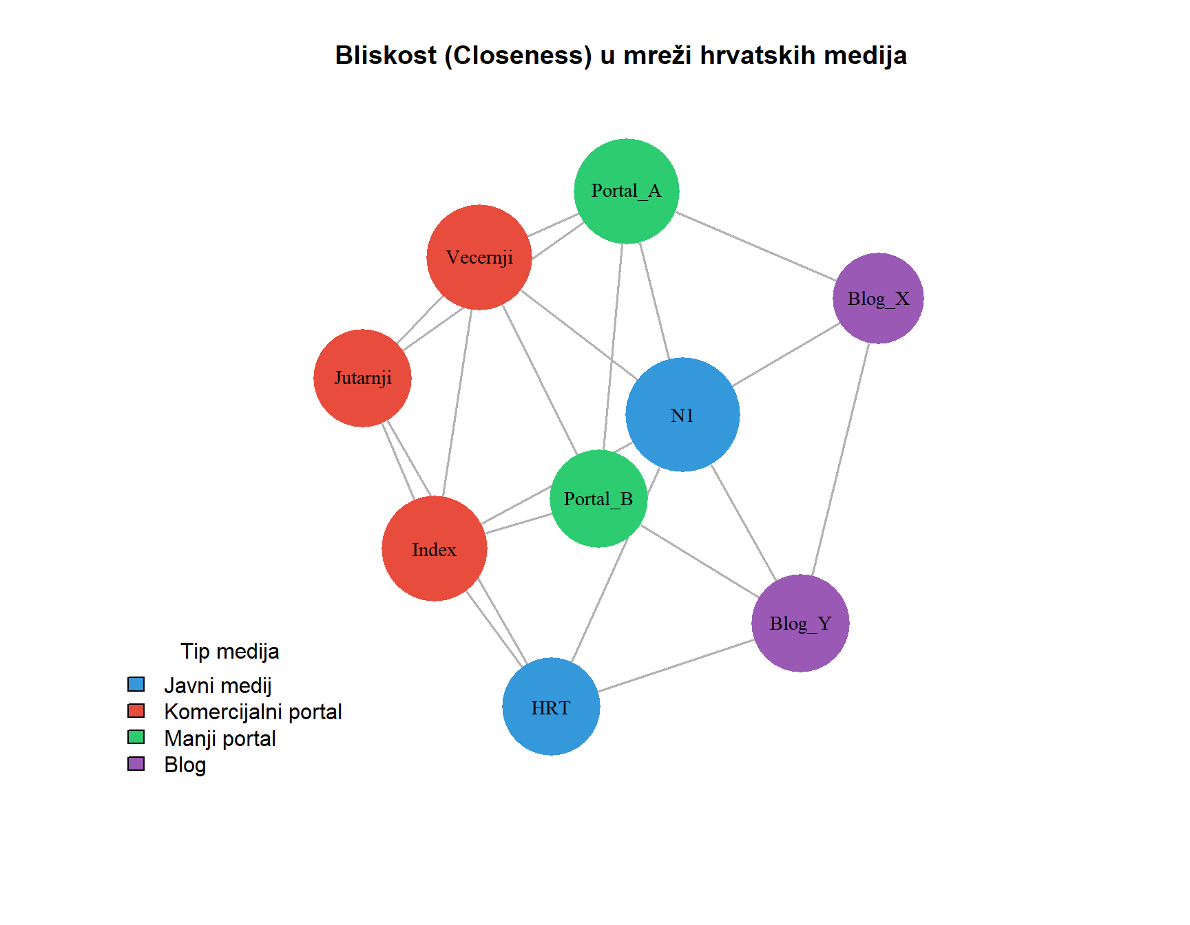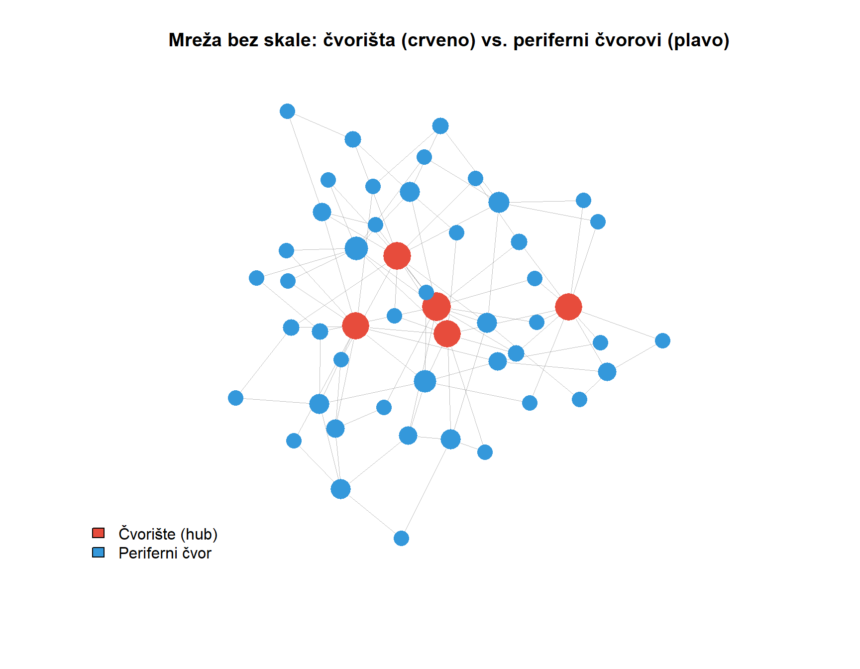 Barabasijevo otkriće imalo je dalekosežne implikacije za razumijevanje komunikacijskih sustava. Mreže bez skale karakterizira postojanje **čvorišta** (engl. *hubs*), odnosno čvorova s disproporcionalno velikim brojem veza. U kontekstu masovne komunikacije, čvorišta mogu biti mainstream mediji čije sadržaje preuzimaju deseci manjih portala, ili influenceri čije objave dijele tisuće pratitelja. Razumijevanje uloge čvorišta ključno je za analizu procesa poput širenja vijesti, formiranja javnog mnijenja ili dinamike dezinformacijskih kampanja. U R-u se nasumične mreže generiraju funkcijom `erdos.renyi.game()`, a mreže bez skale funkcijom `barabasi.game()`, obje iz paketa `igraph`, što omogućuje eksperimentiranje s različitim mrežnim topologijama i usporedbu njihovih svojstava. Razumijevanje ovih povijesnih temelja pruža kontekst za formalniju klasifikaciju mrežnih struktura koja slijedi u nastavku.