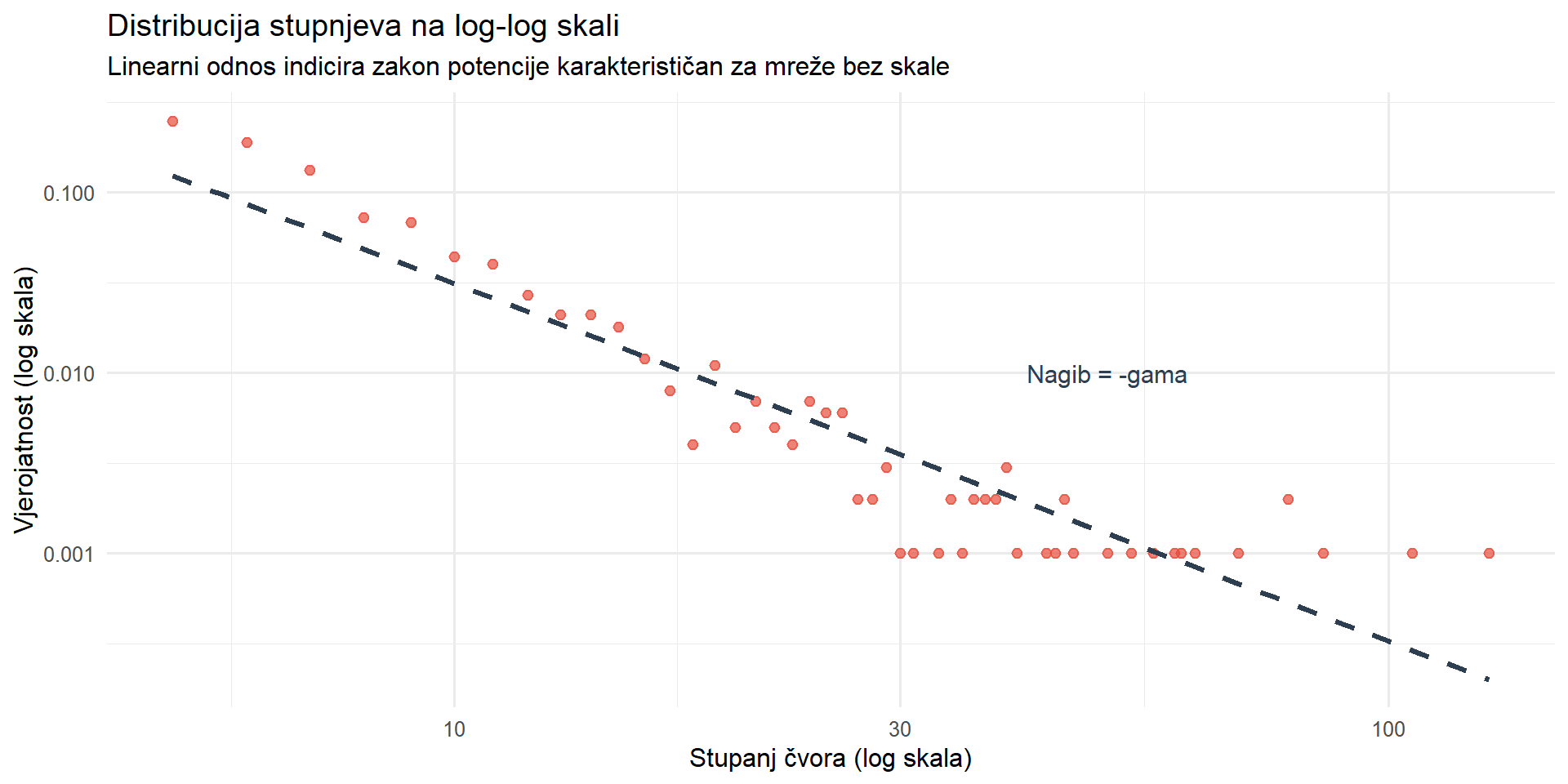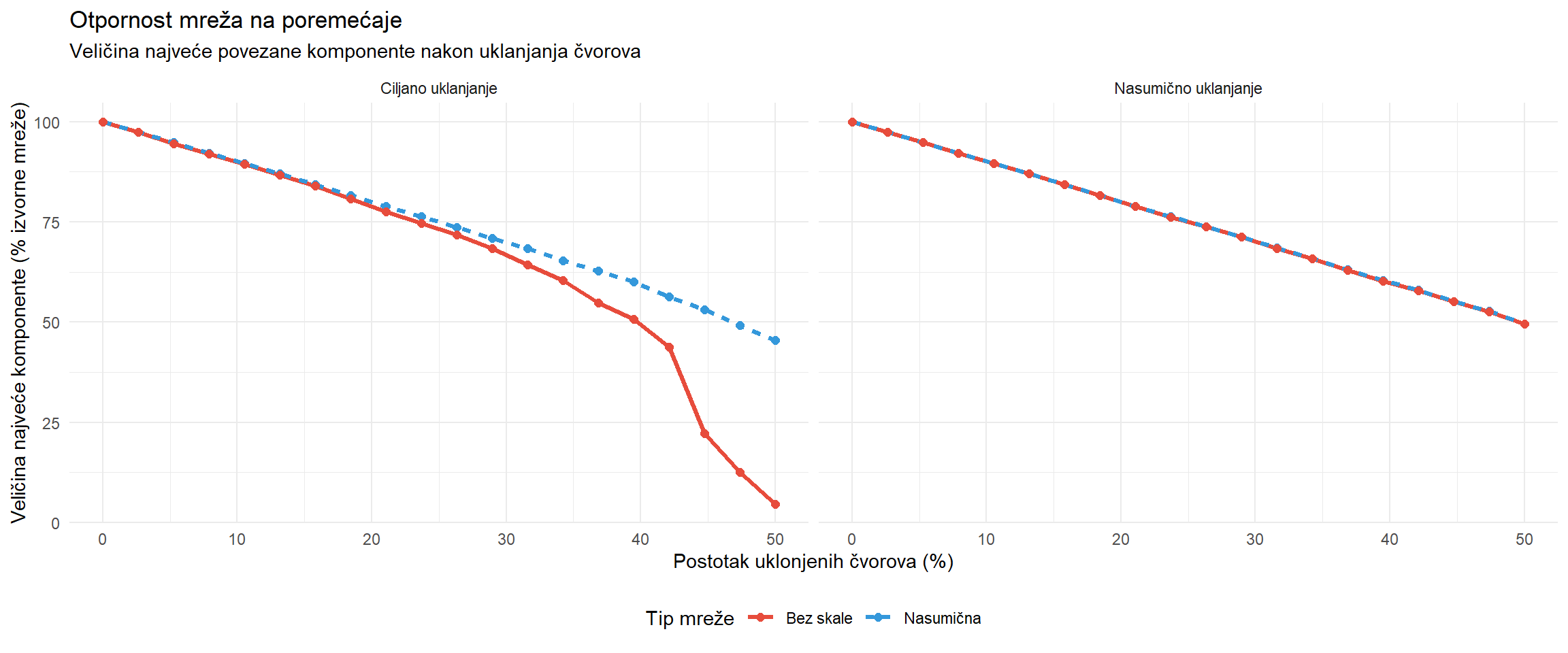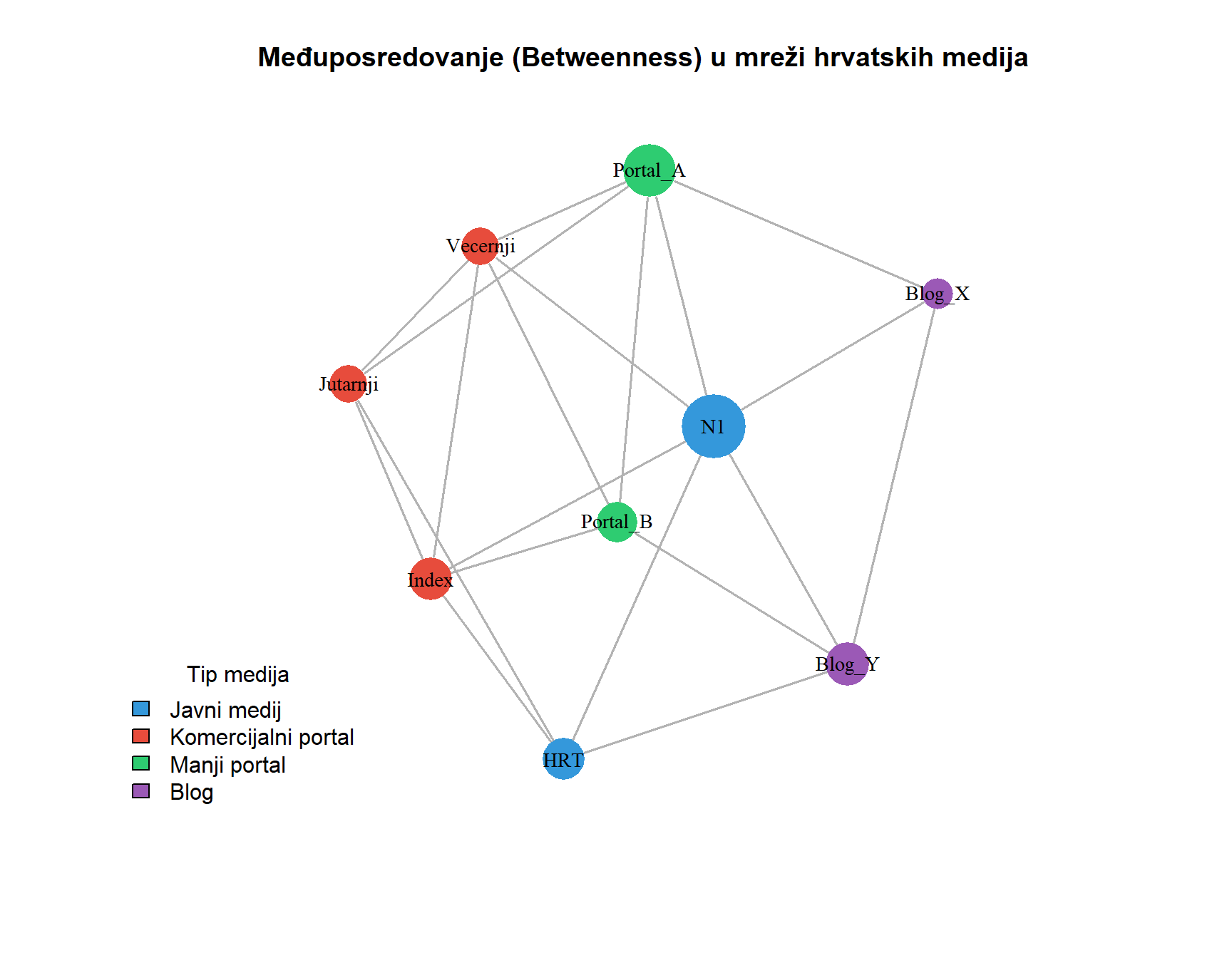 Barabasijevo otkriće imalo je dalekosežne implikacije za razumijevanje komunikacijskih sustava. Mreže bez skale karakterizira postojanje **čvorišta** (engl. *hubs*), odnosno čvorova s disproporcionalno velikim brojem veza. U kontekstu masovne komunikacije, čvorišta mogu biti mainstream mediji čije sadržaje preuzimaju deseci manjih portala, ili influenceri čije objave dijele tisuće pratitelja. Razumijevanje uloge čvorišta ključno je za analizu procesa poput širenja vijesti, formiranja javnog mnijenja ili dinamike dezinformacijskih kampanja. U R-u se nasumične mreže generiraju funkcijom `erdos.renyi.game()`, a mreže bez skale funkcijom `barabasi.game()`, obje iz paketa `igraph`, što omogućuje eksperimentiranje s različitim mrežnim topologijama i usporedbu njihovih svojstava. Razumijevanje ovih povijesnih temelja pruža kontekst za formalniju klasifikaciju mrežnih struktura koja slijedi u nastavku.
