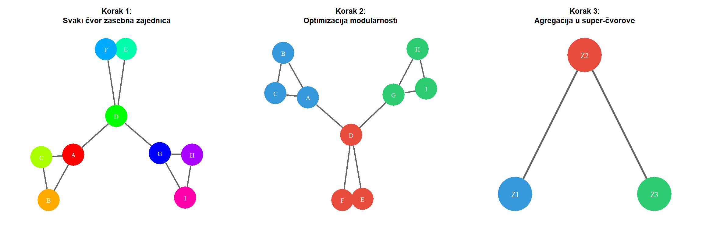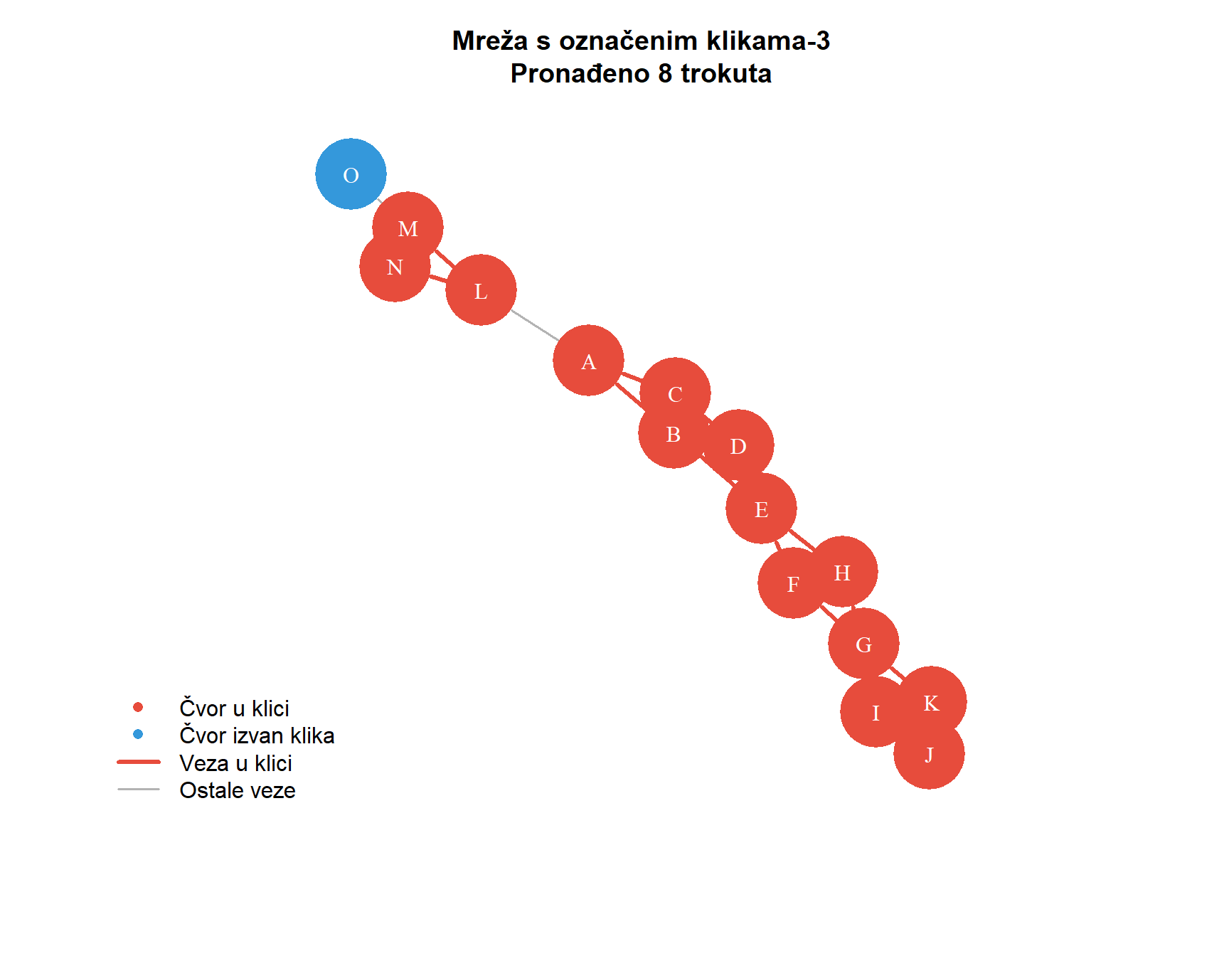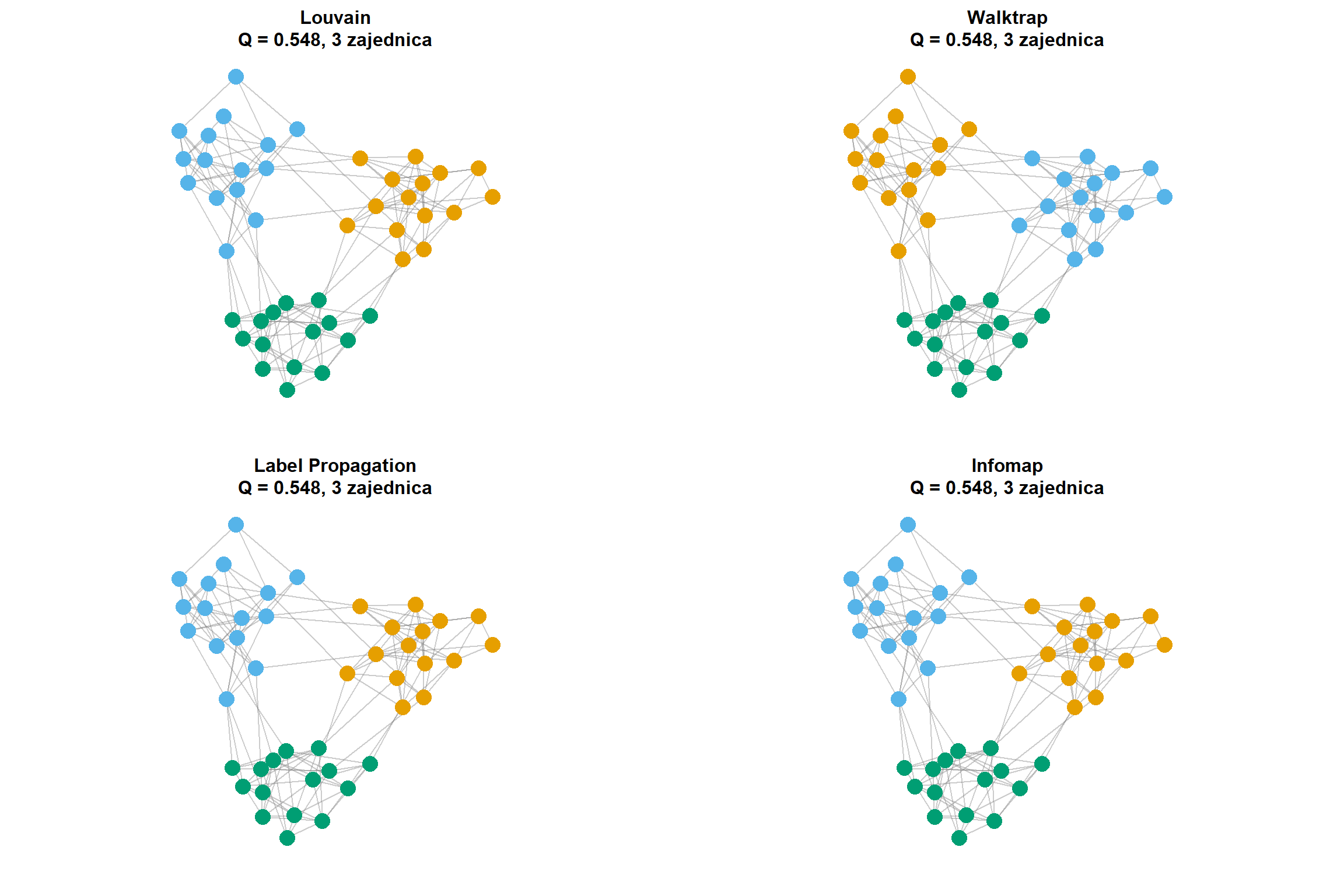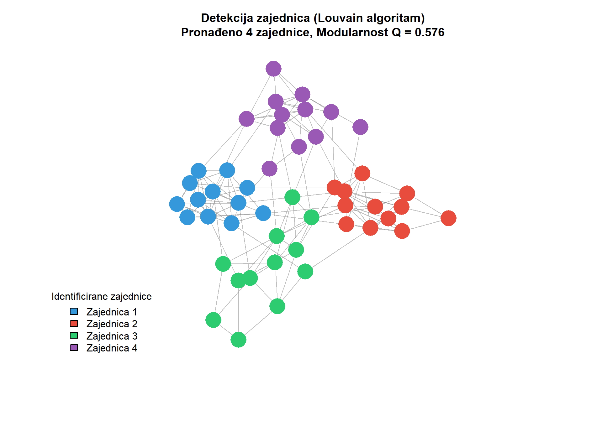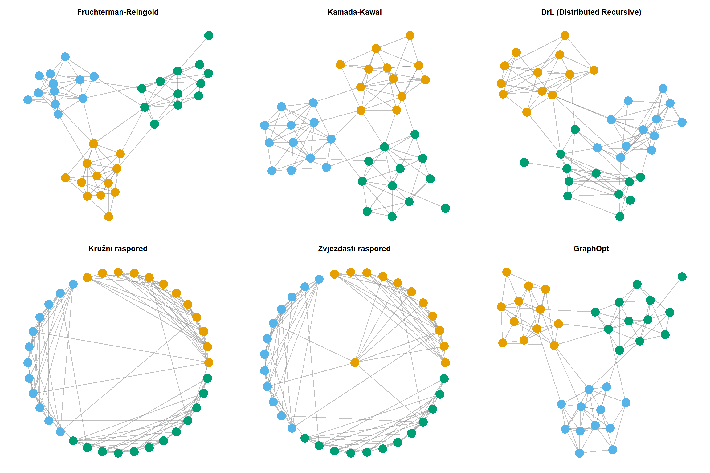 Za provedbu mrežnih analiza u primjerima koji slijede koriste se tri međusobno komplementarna R paketa. Paket `igraph` služi kao temeljni alat za kreiranje mrežnih objekata, izračun mjera centralnosti i drugih mrežnih metrika te primjenu algoritama za detekciju zajednica. Paket `tidygraph` omogućuje manipulaciju mrežnih podataka u *tidy* formatu poznatom iz paketa `dplyr`, čime se mrežni objekti mogu obrađivati istom logikom koja se koristi za tablične podatke. Paket `ggraph` nadograđuje `ggplot2` sustav za vizualizaciju i omogućuje izradu grafički kvalitetnih mrežnih dijagrama. Alternativno, u ekosustavu programskog jezika Python najrašireniji je paket `networkx` koji nudi slične funkcionalnosti. Valja napomenuti da su, za razliku od metoda računalne analize teksta obrađenih u poglavlju 11, metode mrežne analize u načelu jezično neovisne jer operiraju nad strukturnim podatcima o vezama među akterima, a ne nad jezičnim sadržajem. Jezično specifični izazovi pojavljuju se jedino kada se mrežni podatci konstruiraju iz tekstualnih izvora, primjerice pri izgradnji mreža supojavljivanja riječi ili mreža citiranja iz korpusa tekstova, pri čemu se primjenjuju postupci pripreme teksta opisani u poglavlju 11.