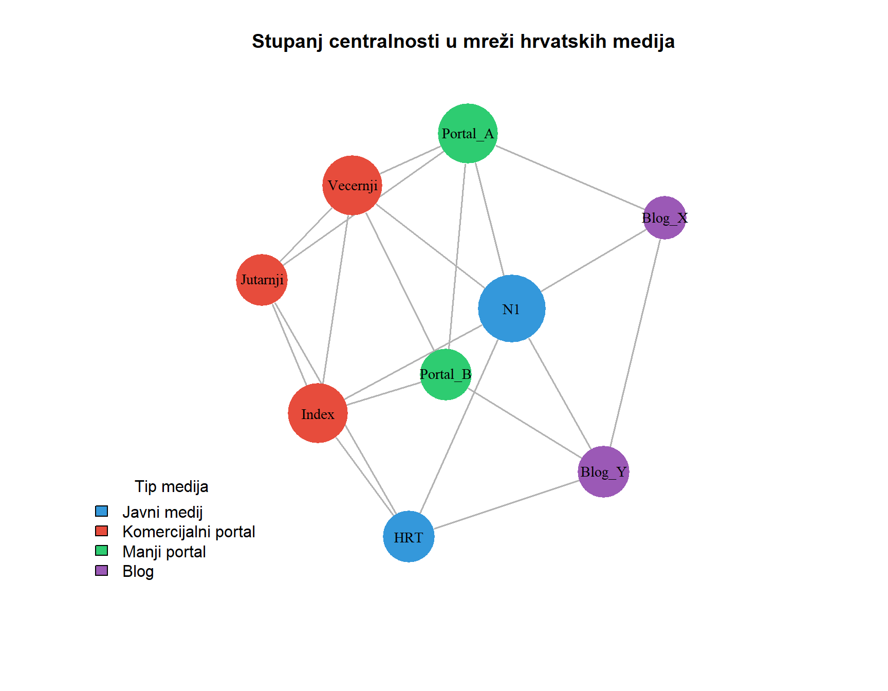 U prikazanom primjeru mreža je kreirana pomoću funkcije `graph_from_literal()` iz paketa `igraph`, koja omogućuje intuitivno definiranje veza korištenjem operatora `--`, a vizualizirana je pomoću paketa `ggraph` koji mrežne podatke prikazuje u skladu s gramatikom grafike poznata iz `ggplot2` sustava. Formalno, mrežu je moguće definirati kao uređeni par G = (V, E), gdje V predstavlja skup čvorova, a E skup veza među njima. Svaka veza e iz skupa E definirana je kao par čvorova (v1, v2) koje povezuje. Jednostavnije rečeno, mreža se sastoji od popisa svih aktera i popisa svih veza među njima, pri čemu se za svaku vezu bilježi koji su akteri njome povezani. Ova matematička formalizacija omogućuje precizno opisivanje strukture mreže i primjenu algoritama za njezinu analizu. Nadalje, čvorovi i veze mogu imati pridružene atribute koji obogaćuju analizu. Primjerice, čvorovima mogu biti pridruženi podaci o geografskoj lokaciji ili broju pratitelja, dok veze mogu nositi informaciju o vremenu nastanka ili učestalosti interakcije. U istraživanjima masovne komunikacije, akter može biti bilo koji entitet koji sudjeluje u komunikacijskom procesu. Medijska kuća poput HRT-a, portal Index.hr, novinar s imenom i prezimenom, ali i anonimni korisnik Twittera koji dijeli vijesti, svi oni mogu biti modelirani kao čvorovi u komunikacijskoj mreži. Ključno je razumjeti da mreža nije objektivna stvarnost, već analitička konstrukcija koju istraživač gradi prema svojim teorijskim pretpostavkama i istraživačkim ciljevima.