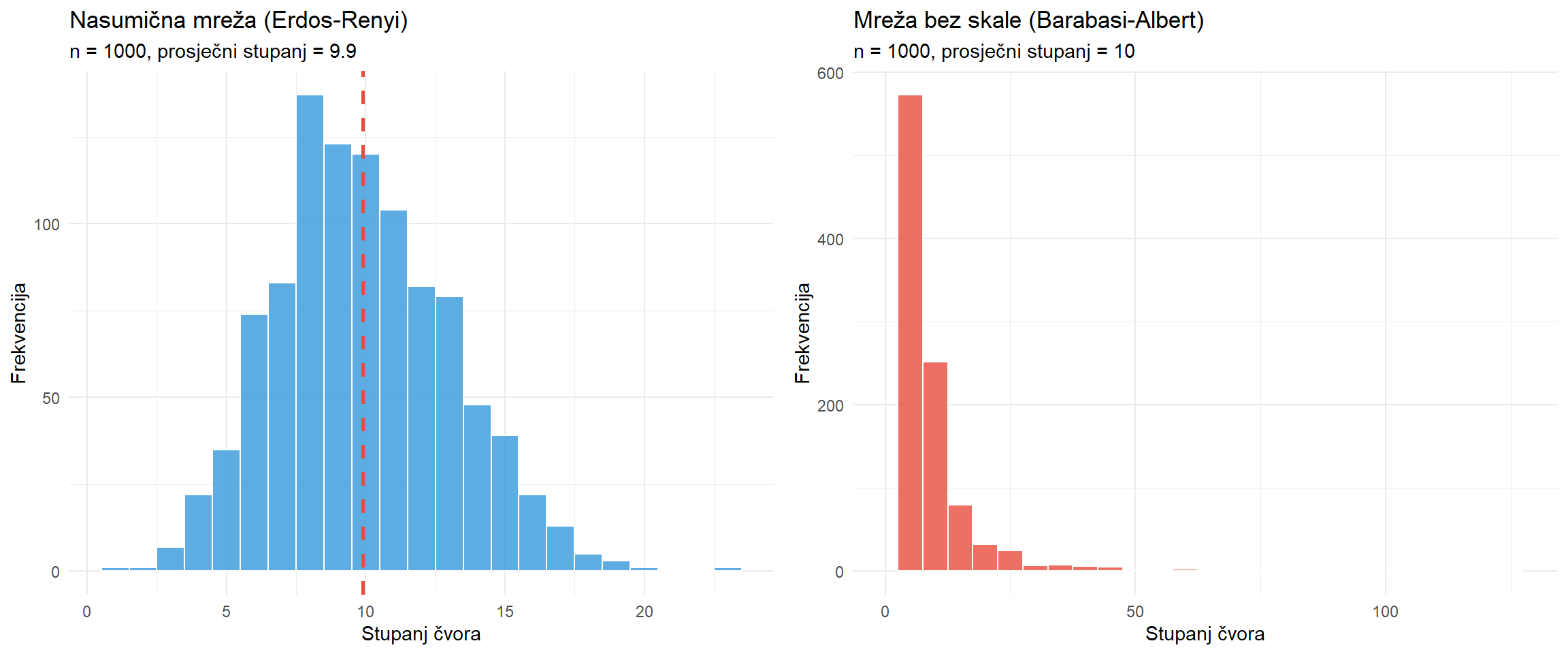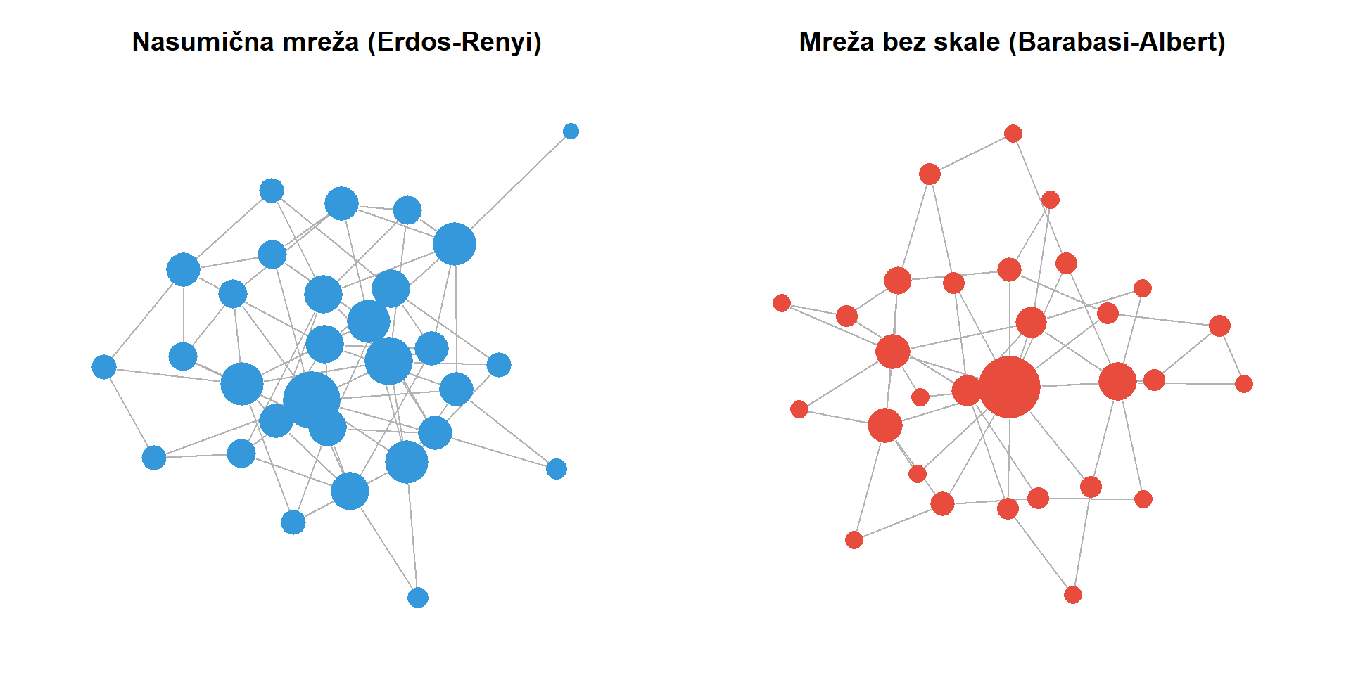 #| fig-cap: "Usporedba nasumične mreže (lijevo) i mreže bez skale (desno). U mreži bez skale jasno su vidljiva čvorišta s velikim brojem veza, dok nasumična mreža pokazuje ujednačeniju distribuciju povezanosti."