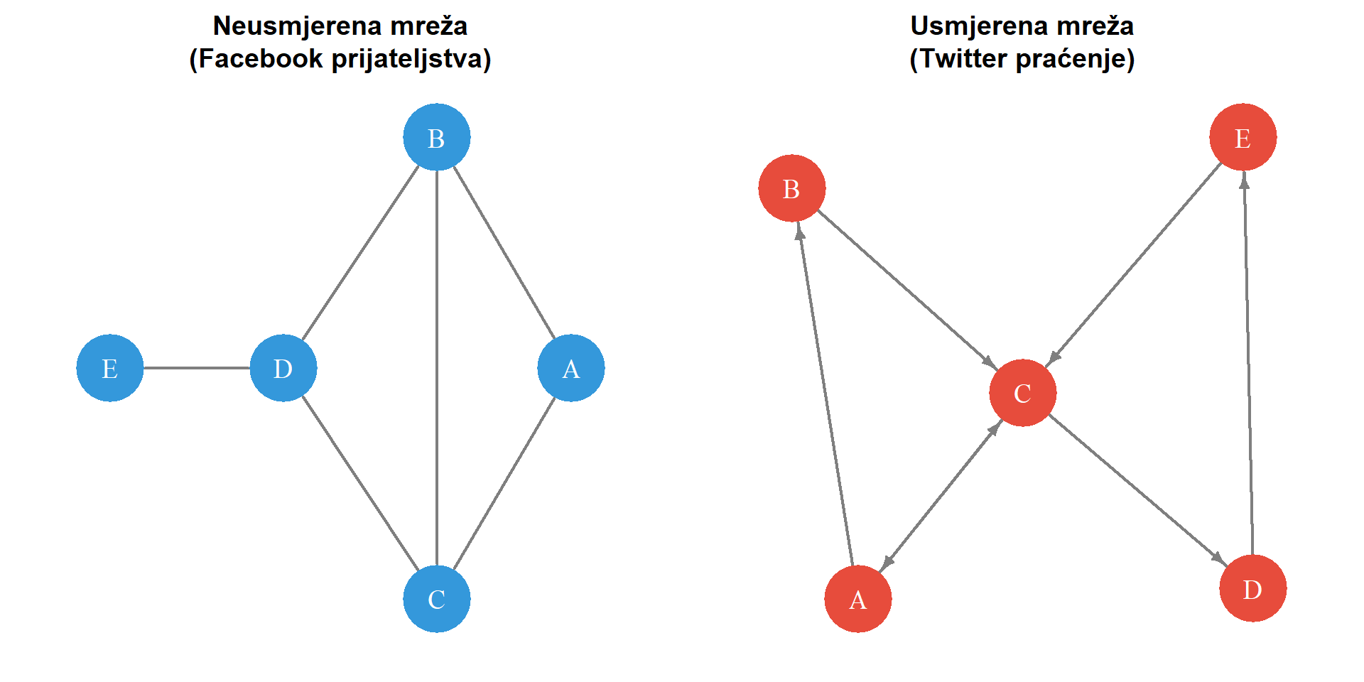 #| fig-cap: "Usporedba neusmjerene mreže (lijevo) gdje su veze simetrične i usmjerene mreže (desno) gdje strelice pokazuju smjer odnosa. U kontekstu društvenih mreža, neusmjerena mreža mogla bi predstavljati Facebook prijateljstva, dok usmjerena predstavlja Twitter praćenje."