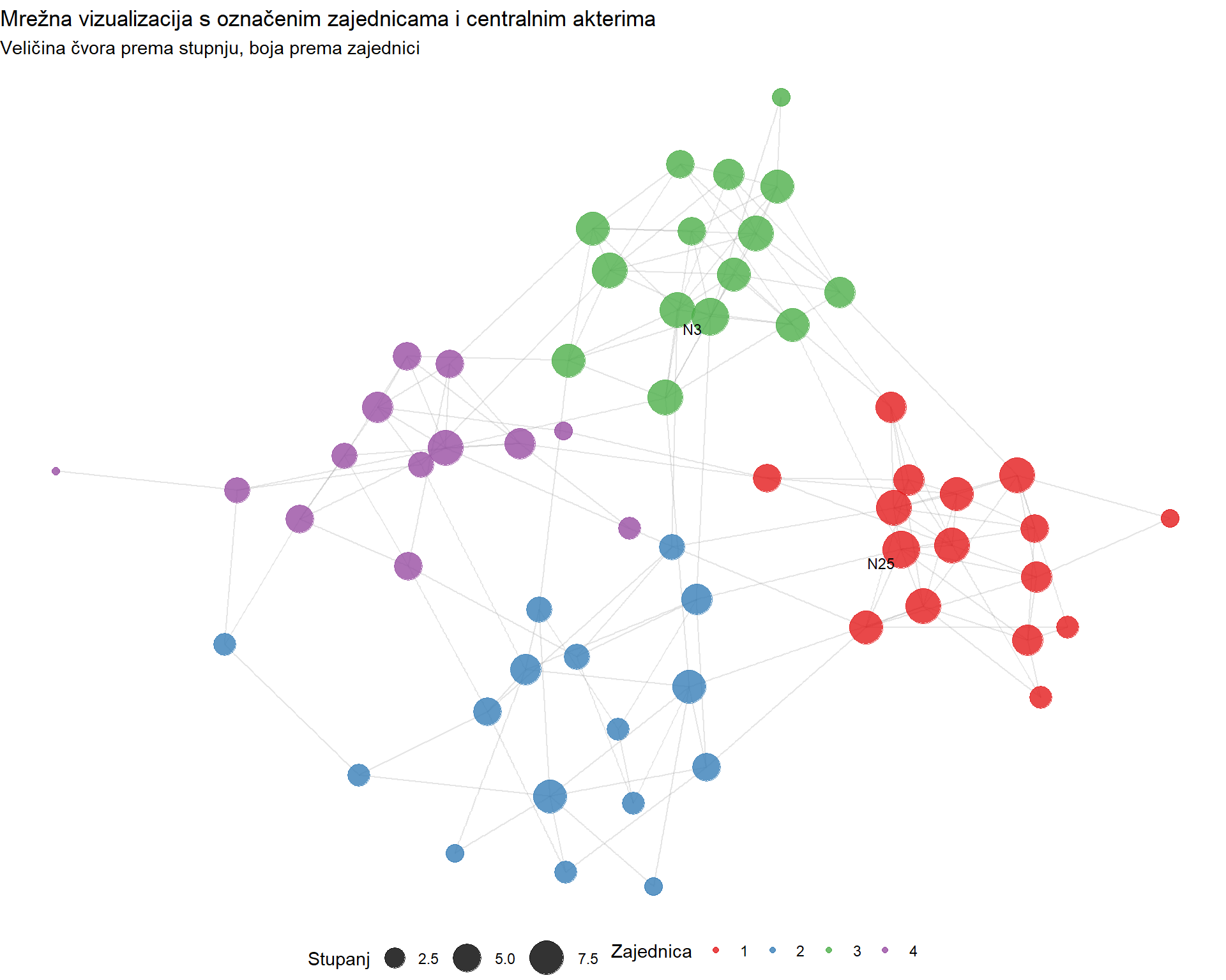 #| fig-cap: "Cjelovit primjer analize komunikacijske mreže: vizualizacija mreže dijeljenja vijesti s označenim zajednicama i centralnim akterima. Veličina čvora proporcionalna je stupnju centralnosti, boja označava zajednicu, a oznake prikazuju najcentralnije aktere u svakoj zajednici."
