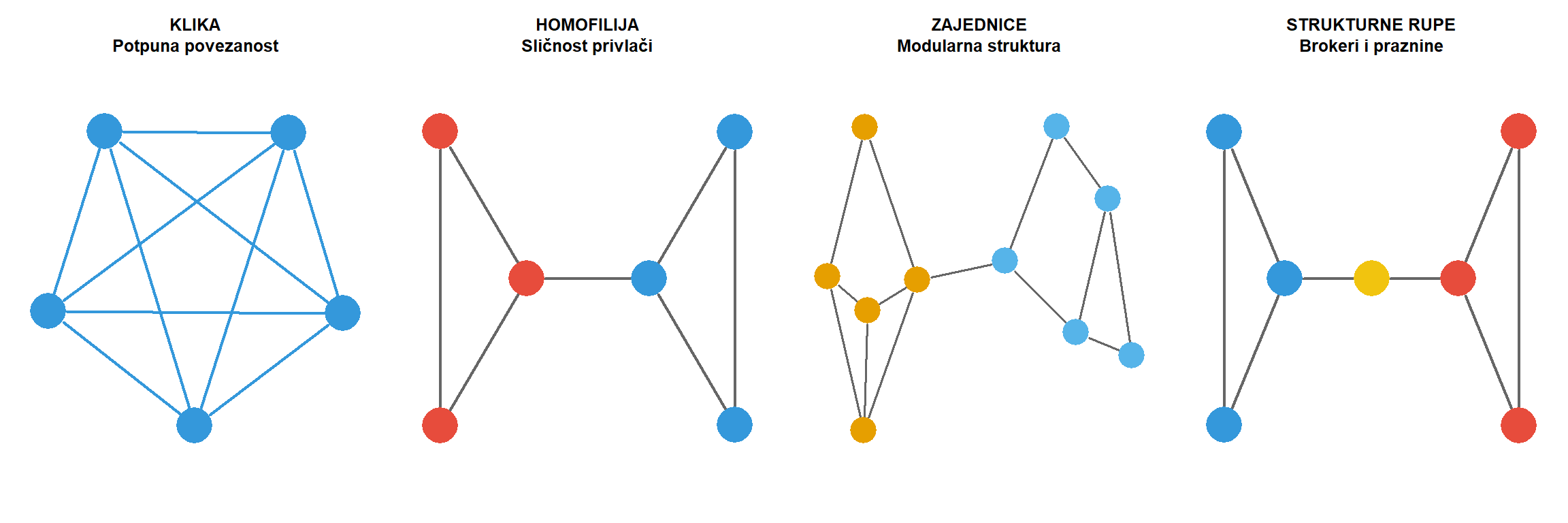 Osnovni elementi mreža, čvorovi i veze, definirani su zajedno s ključnim dimenzijama poput usmjerenosti i težine, te formatima za prikaz mrežnih podataka poput matrice susjedstva i liste bridova. Mjere centralnosti, uključujući stupanj, međuposredovanje, bliskost i svojstvenu vektorsku centralnost, operacionaliziraju različite koncepte važnosti aktera u mreži i omogućuju identifikaciju utjecajnih medija, gatekeepera i mostova između zajednica. Na makrorazini, gustoća, koeficijent klasteriranja, prosječna duljina putanje i distribucija stupnjeva pružaju uvide u globalnu organizaciju komunikacijskih sustava i procese koji ih oblikuju.
