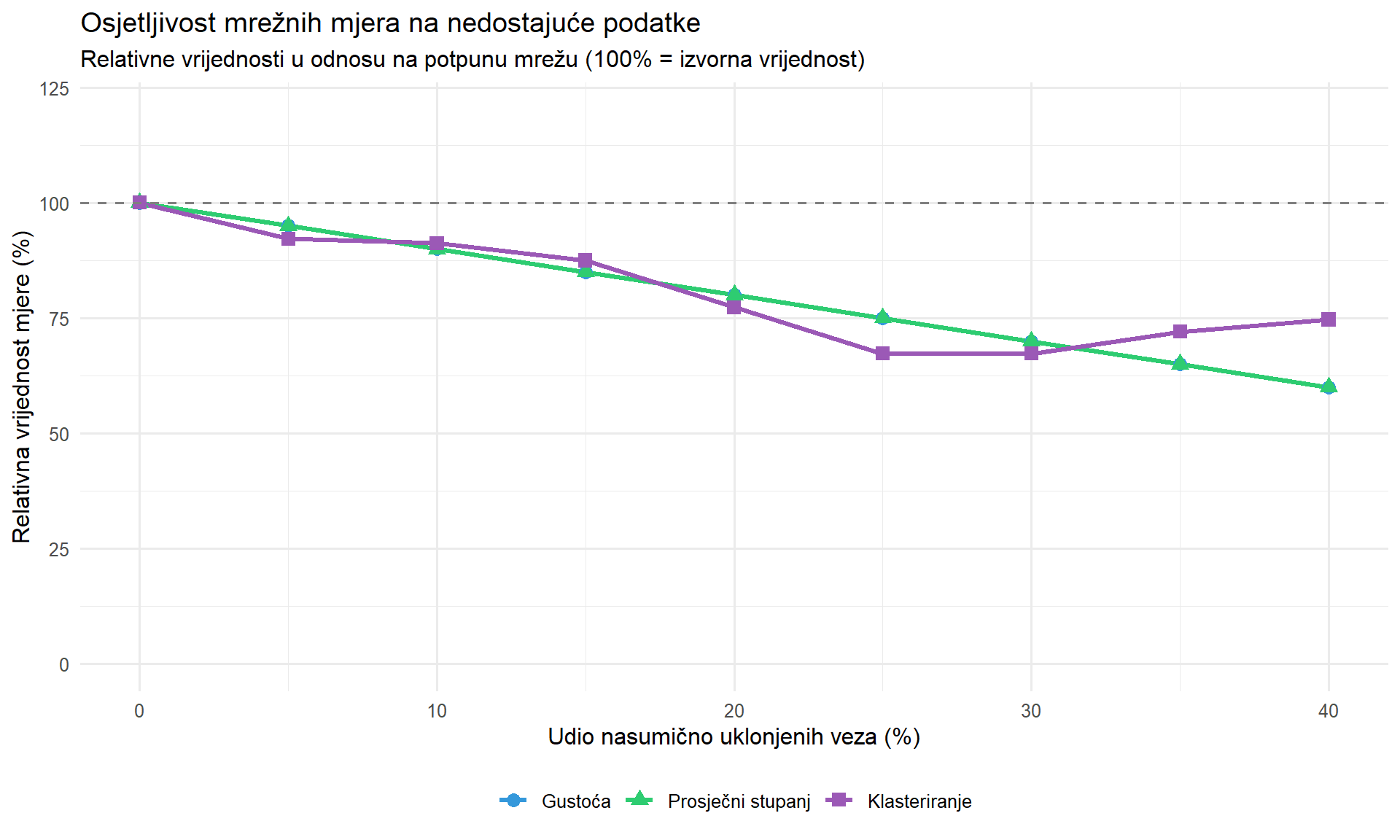 Prvi korak analize uključuje izračun makrostrukturnih mjera koje karakteriziraju mrežu kao cjelinu. Gustoća mreže, koeficijent klasteriranja i prosječna duljina putanje zajedno pružaju sliku o tome koliko je mreža kohezivna, jesu li prisutne lokalne strukture zajednica i koliko je učinkovita globalna komunikacija.