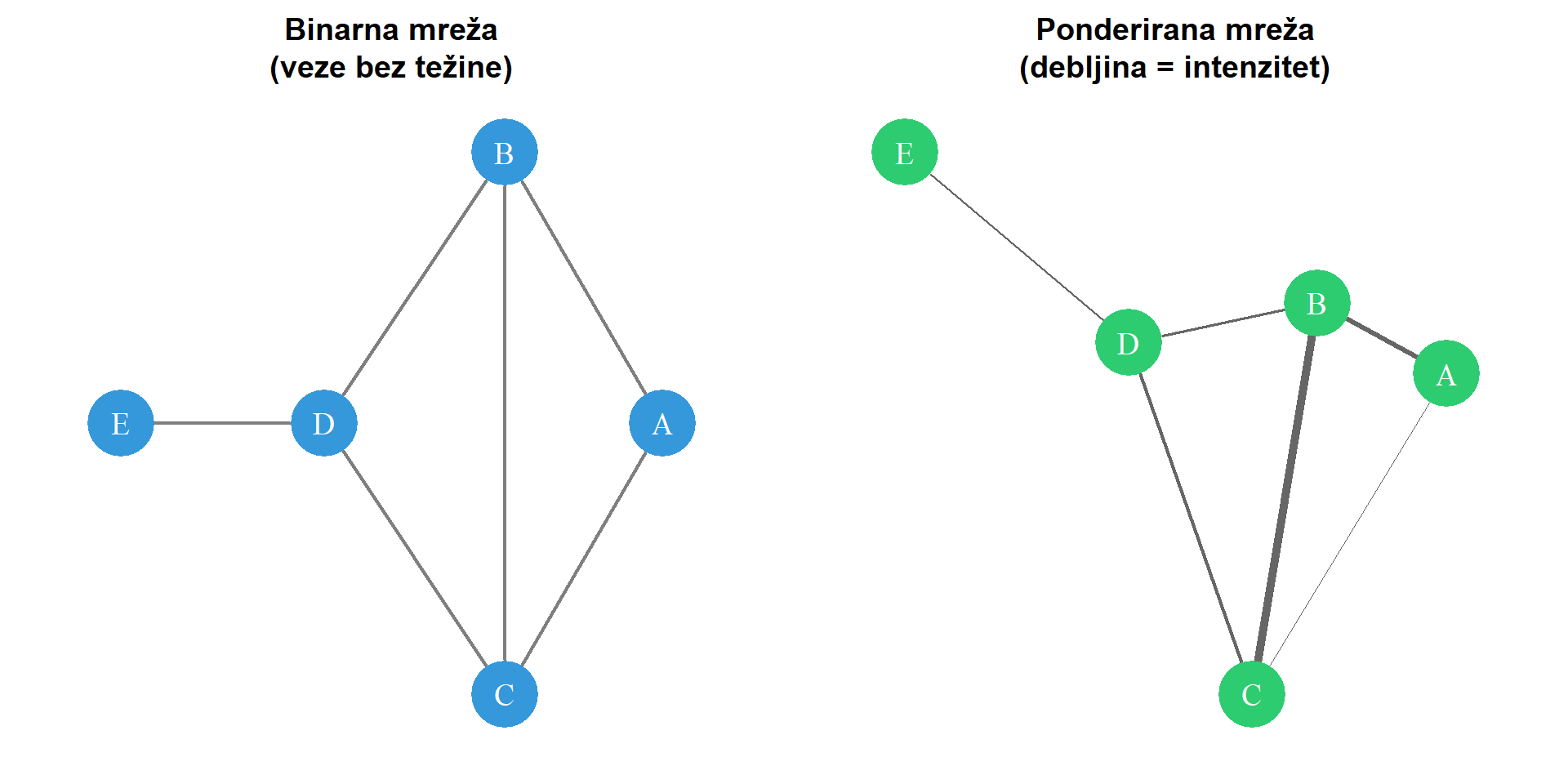 Razumijevanje različitih tipova mrežnih struktura preduvjet je za odabir odgovarajućih analitičkih metoda i ispravnu interpretaciju rezultata. Mreže se mogu klasificirati prema nekoliko ključnih dimenzija koje odražavaju prirodu odnosa koji se proučavaju. U ovom odjeljku razmatraju se tri temeljne karakteristike mrežnih podataka: usmjerenost veza, njihova težina te načini formalnog prikaza mrežne strukture.