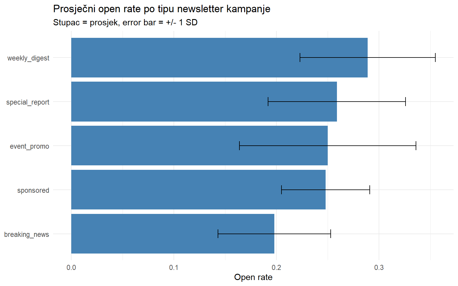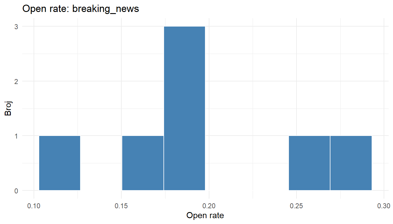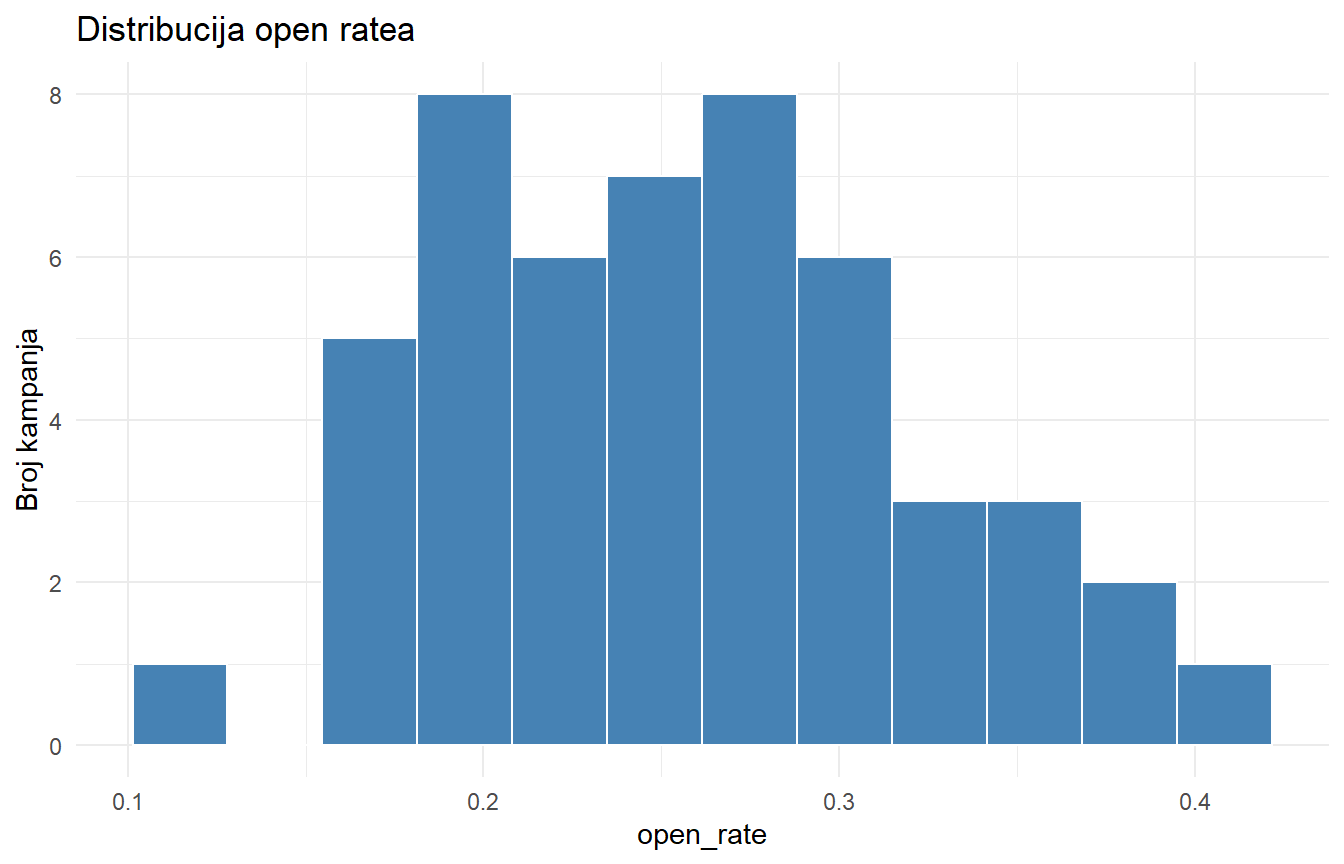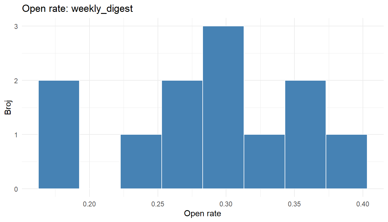 map(), generirajte sažetak open ratea za svaki dan u tjednu (stupacday_sent). Spojite rezultate u jedan tibble. - Napišite kratki Quarto dokument (.qmd) koji učitava podatke, prikazuje jedan graf i jednu tablicu, s popratnim tekstom. Renderirajte ga u HTML.