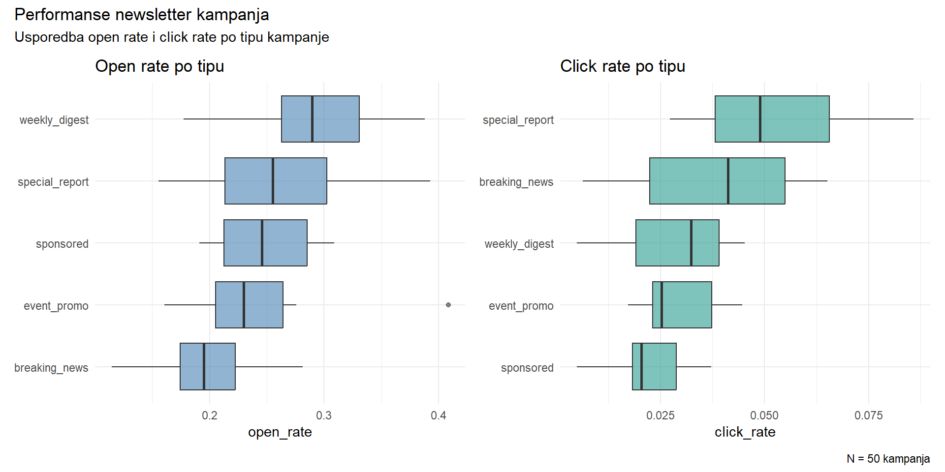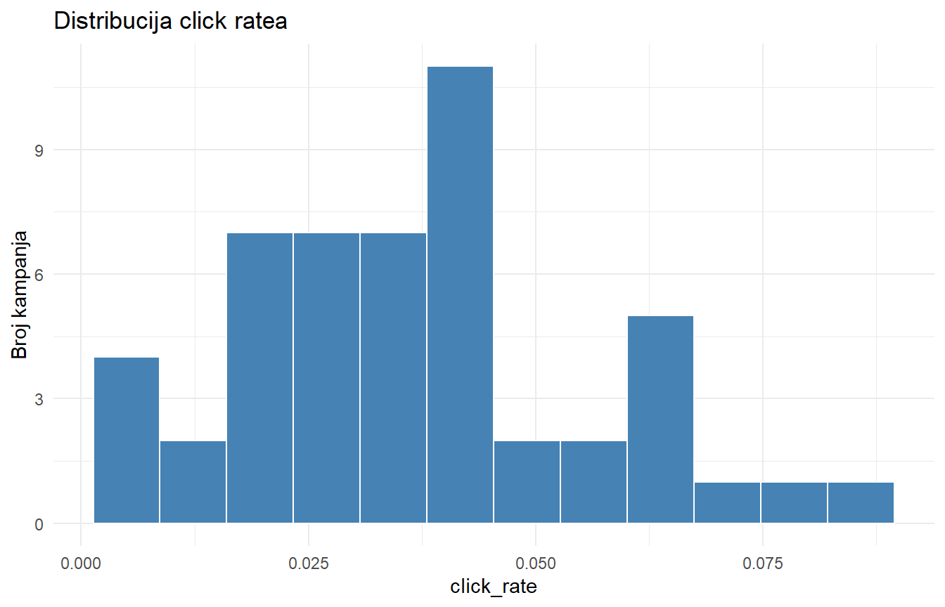 Ovaj tjedan koristimo dataset o 50 newsletter kampanja jednog informativnog portala. Za svaku kampanju imamo podatke o tipu, stilu naslova, vremenu slanja, broju pretplatnika, open rateu (postotak otvaranja), click rateu (postotak klikova) i drugim metrikama.