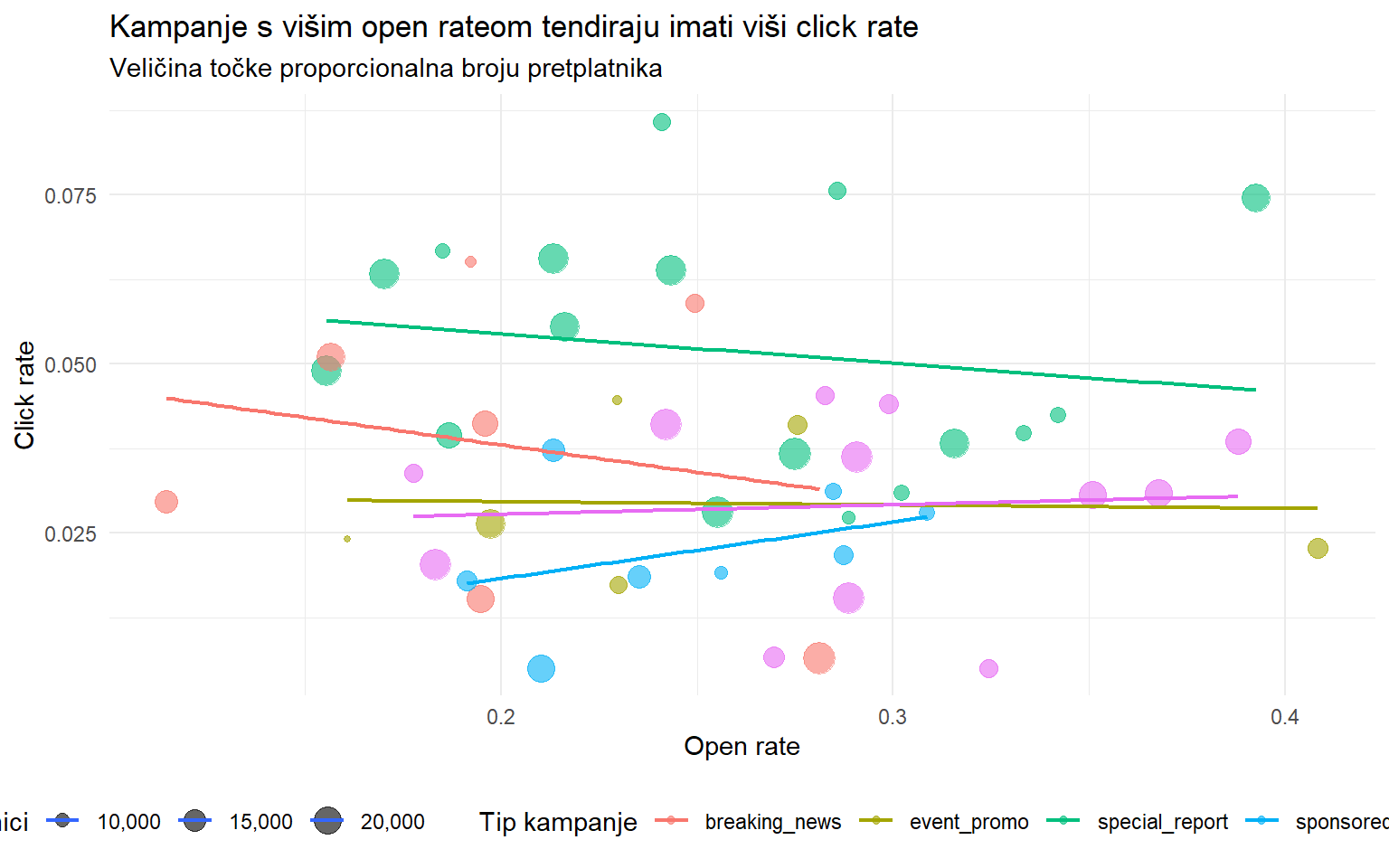 Analiza otkriva nekoliko nalaza. Breaking news i kampanje s hitnim stilom naslova imaju najviši open rate, ali uz veću varijabilnost. Click rate ne prati savršeno open rate, što sugerira da su čimbenici koji navode ljude da otvore email (naslov, hitnost) različiti od onih koji ih navode da kliknu na sadržaj (relevantnost, format). Korelacija između broja riječi i open ratea govori o preferiranom formatu, dok veličina baze pretplatnika sama po sebi ne predviđa bolji angažman.
