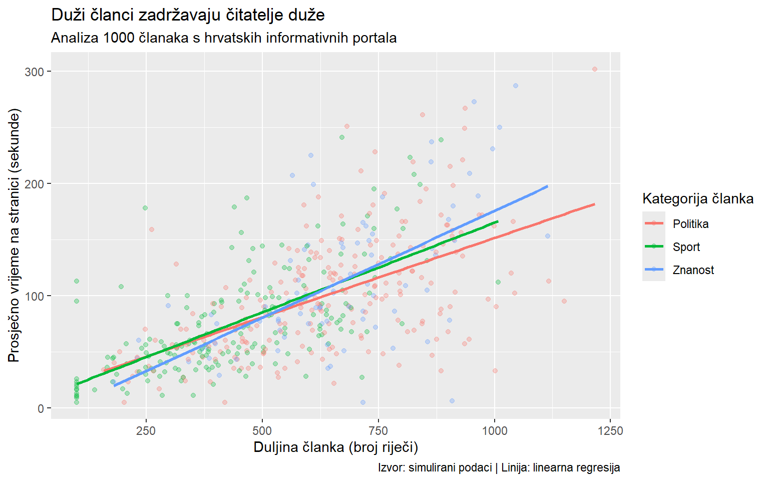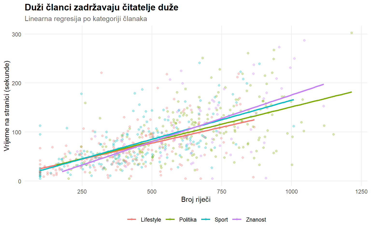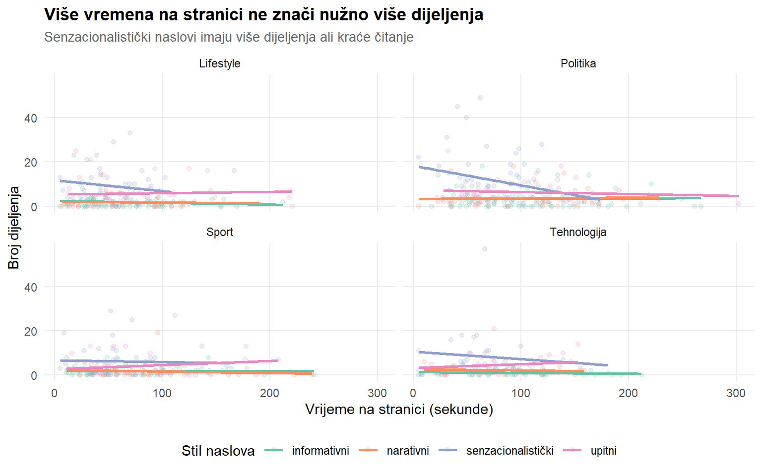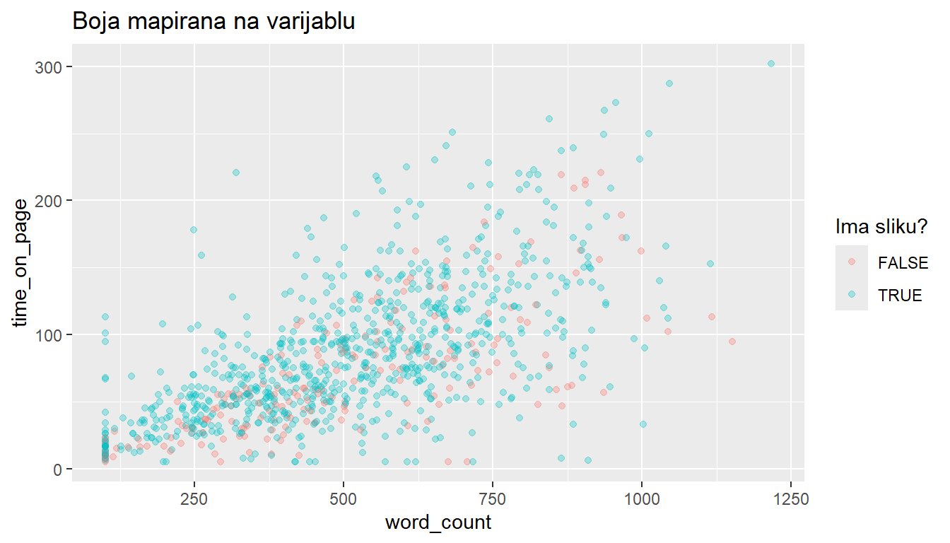 Estetike (aesthetics, aes()) — mapiranja varijabli na vizualne dimenzije grafa. Na primjer, varijabla time_on_page ide na x os, shares na y os, category određuje boju.