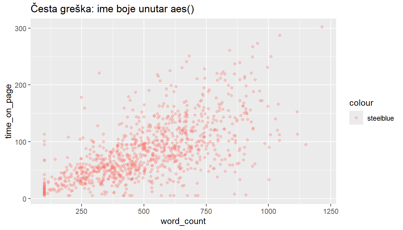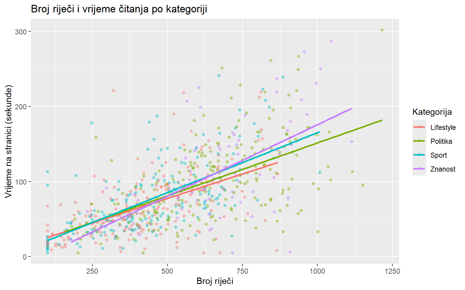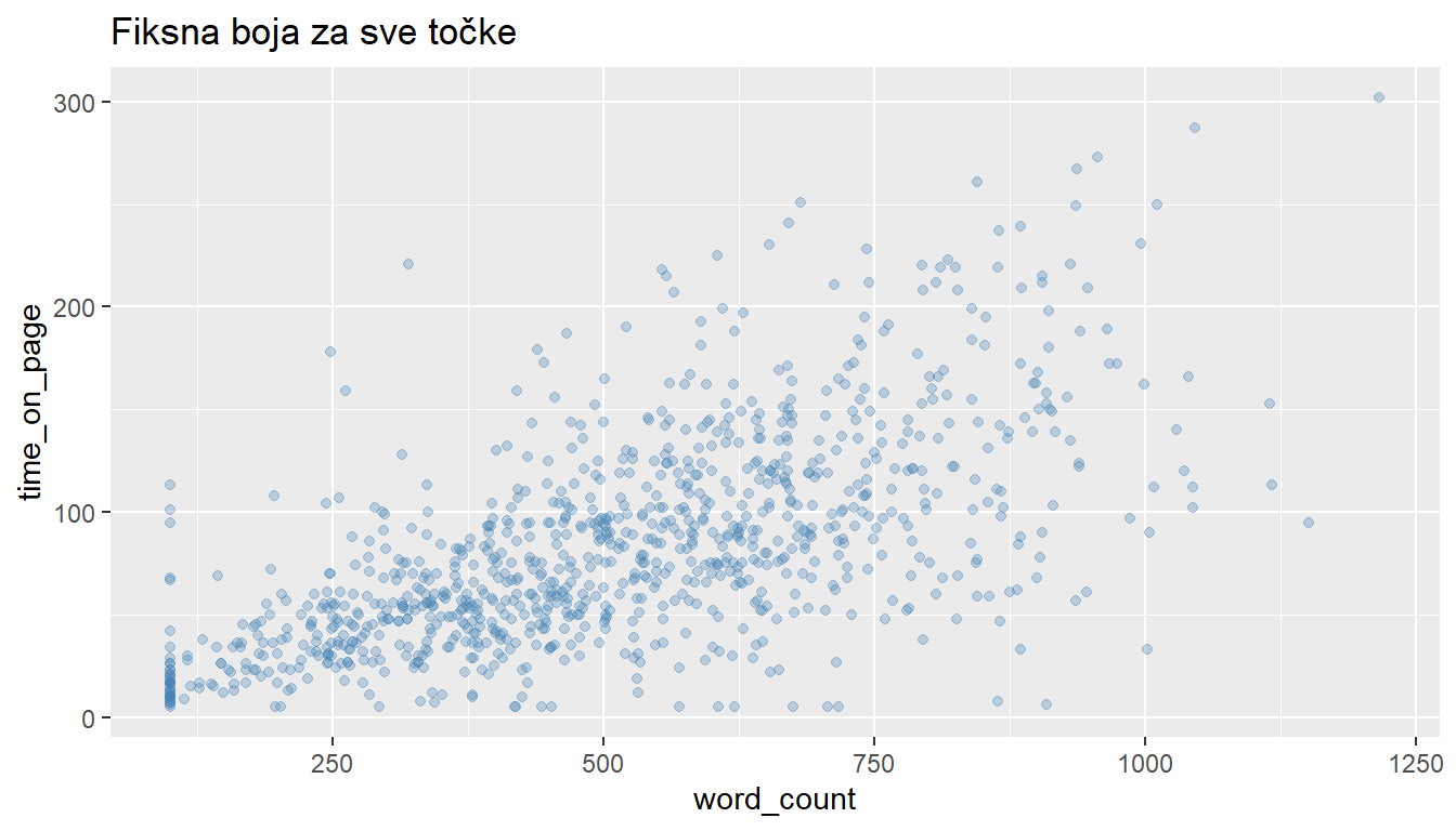 Estetike (aesthetics, aes()) — mapiranja varijabli na vizualne dimenzije grafa. Na primjer, varijabla time_on_page ide na x os, shares na y os, category određuje boju.