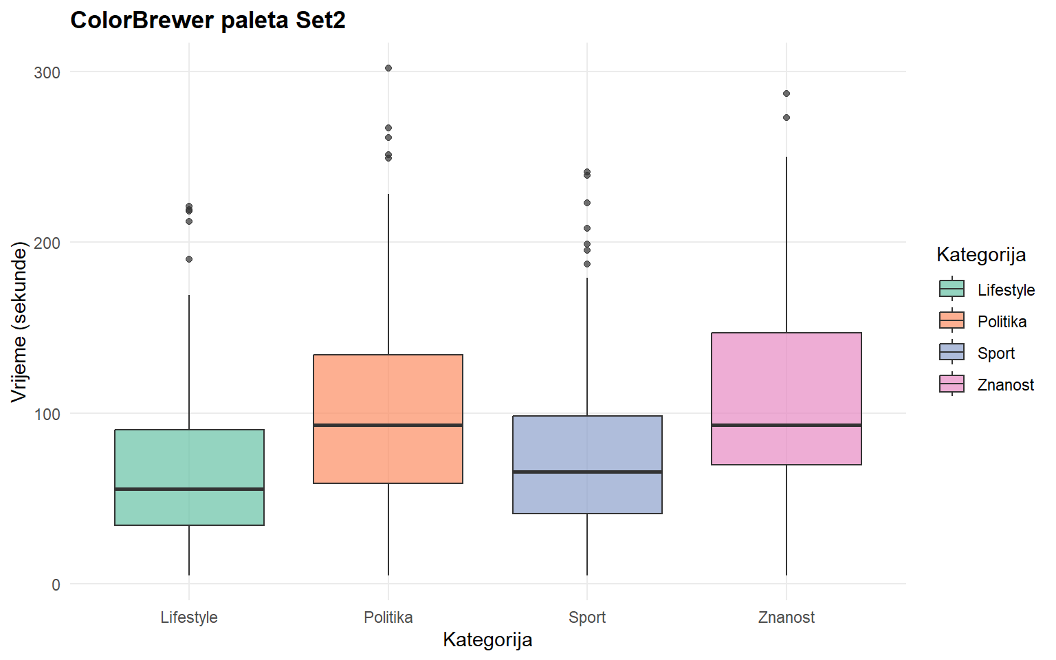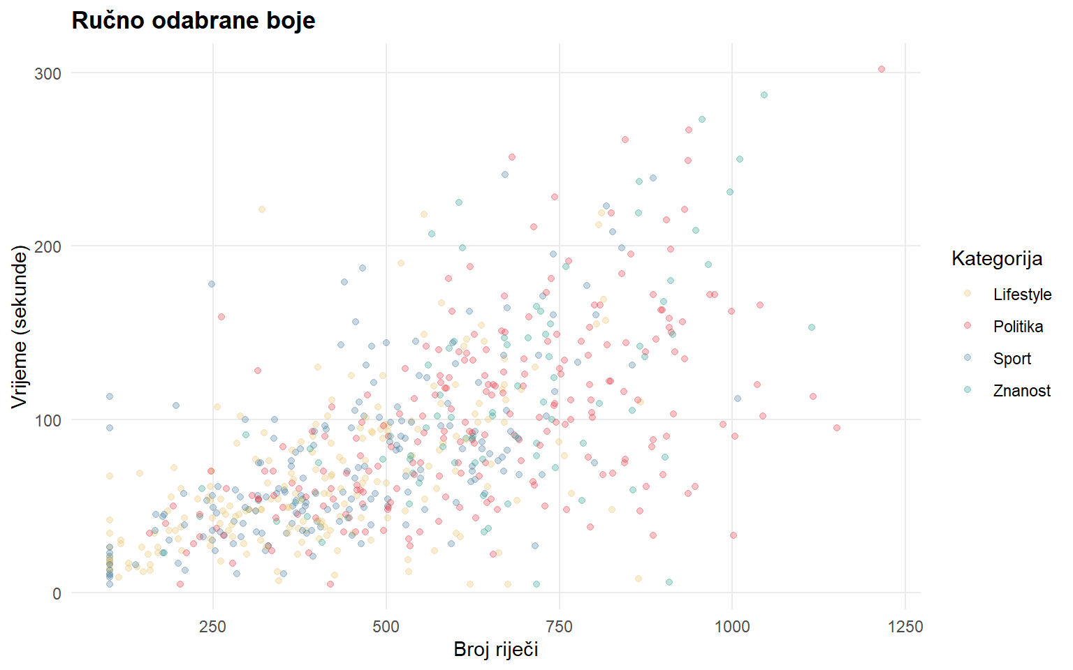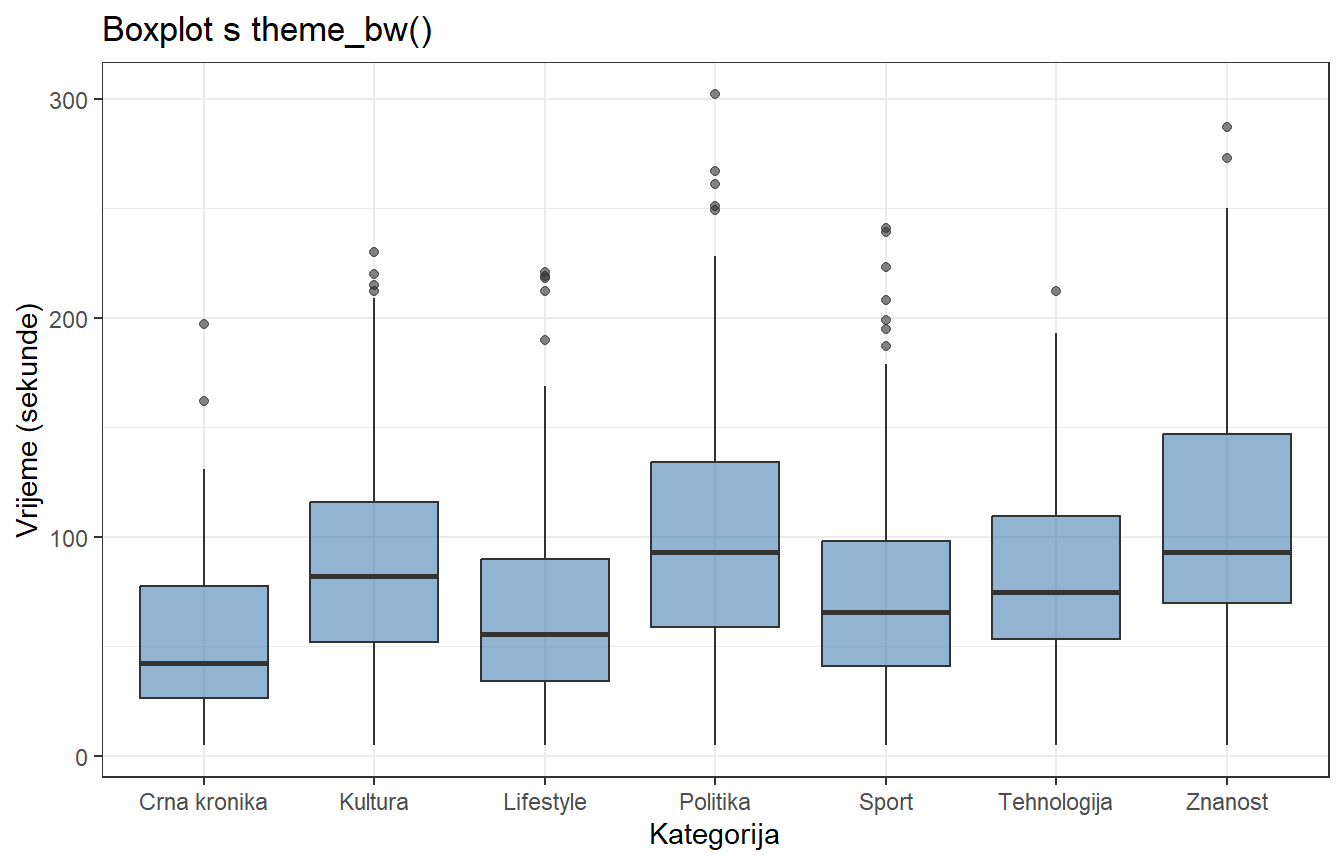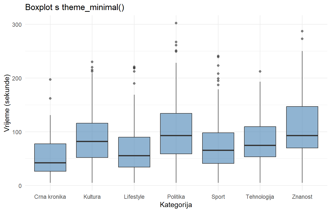 Estetike (aesthetics, aes()) — mapiranja varijabli na vizualne dimenzije grafa. Na primjer, varijabla time_on_page ide na x os, shares na y os, category određuje boju.