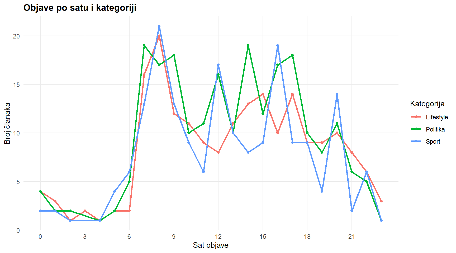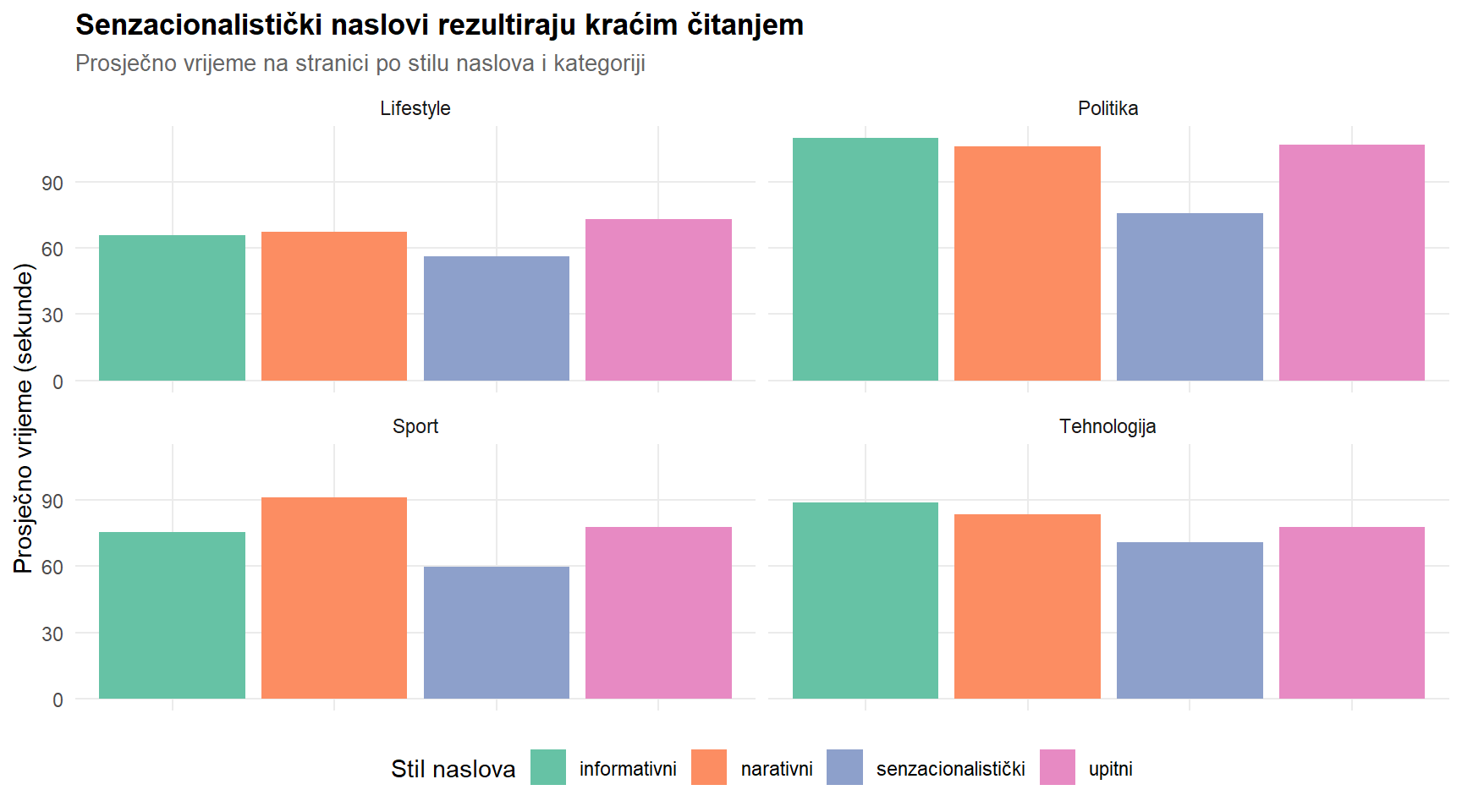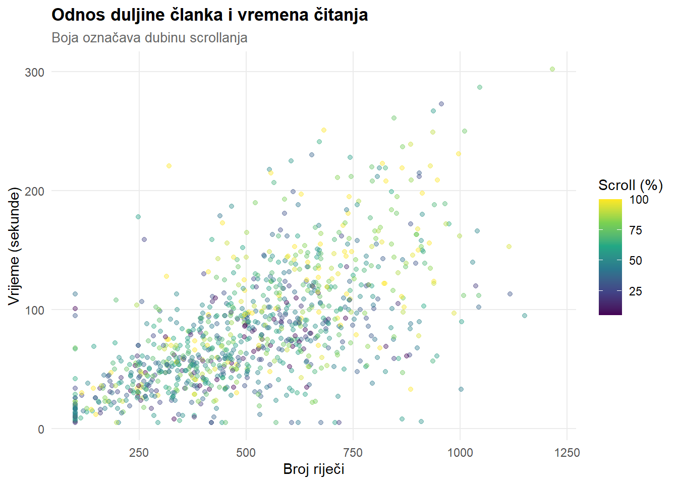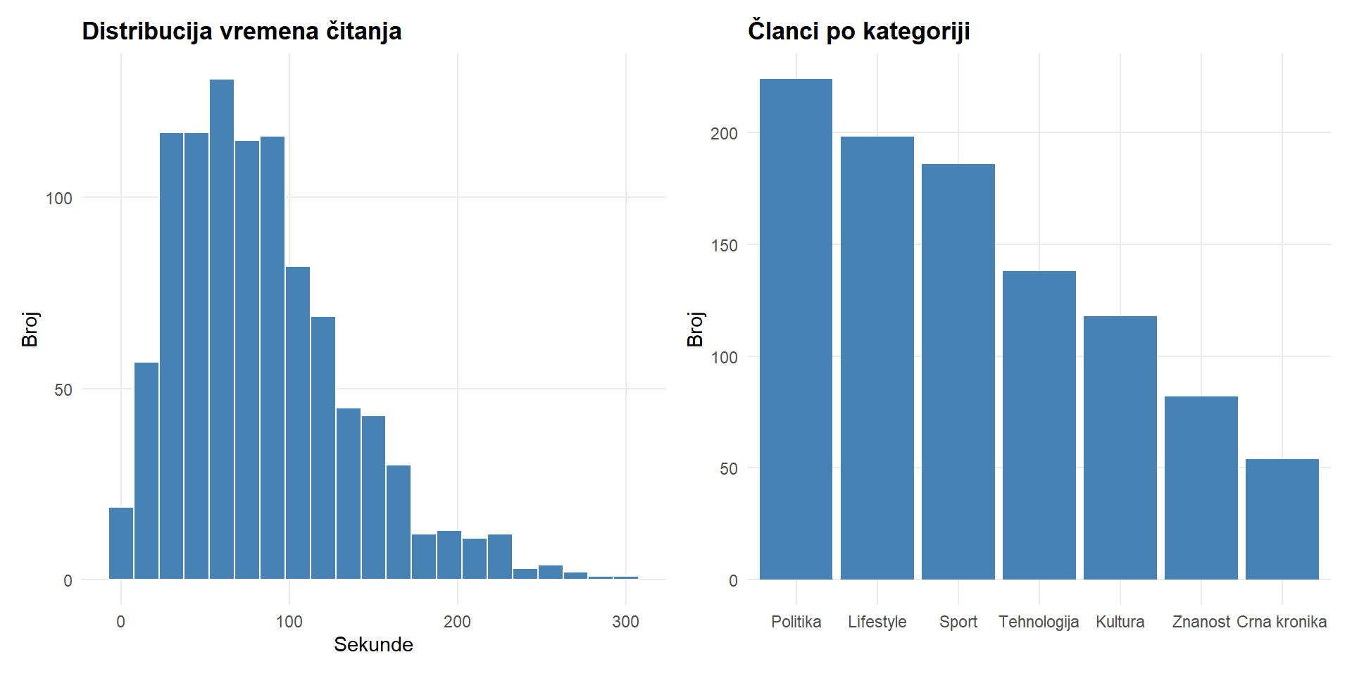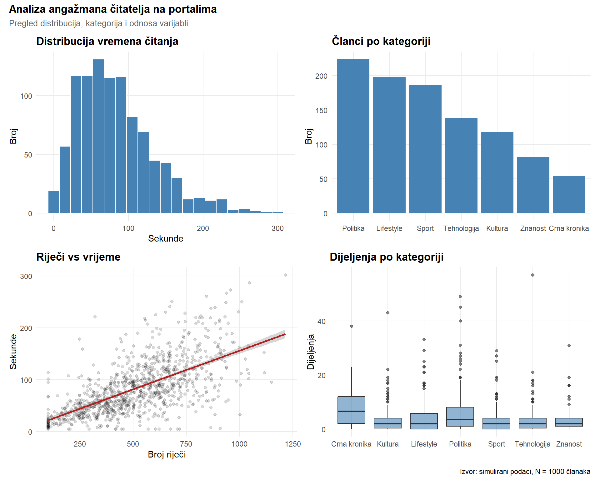 Koristit ćemo simulirani dataset koji sadrži podatke o 1000 članaka objavljenih na hrvatskim informativnim portalima. Za svaki članak imamo informacije o izvoru, kategoriji, stilu naslova, formatu, broju riječi, vremenu provedenom na stranici, broju dijeljenja, komentara, dubini scrollanja i drugim metrikama angažmana.