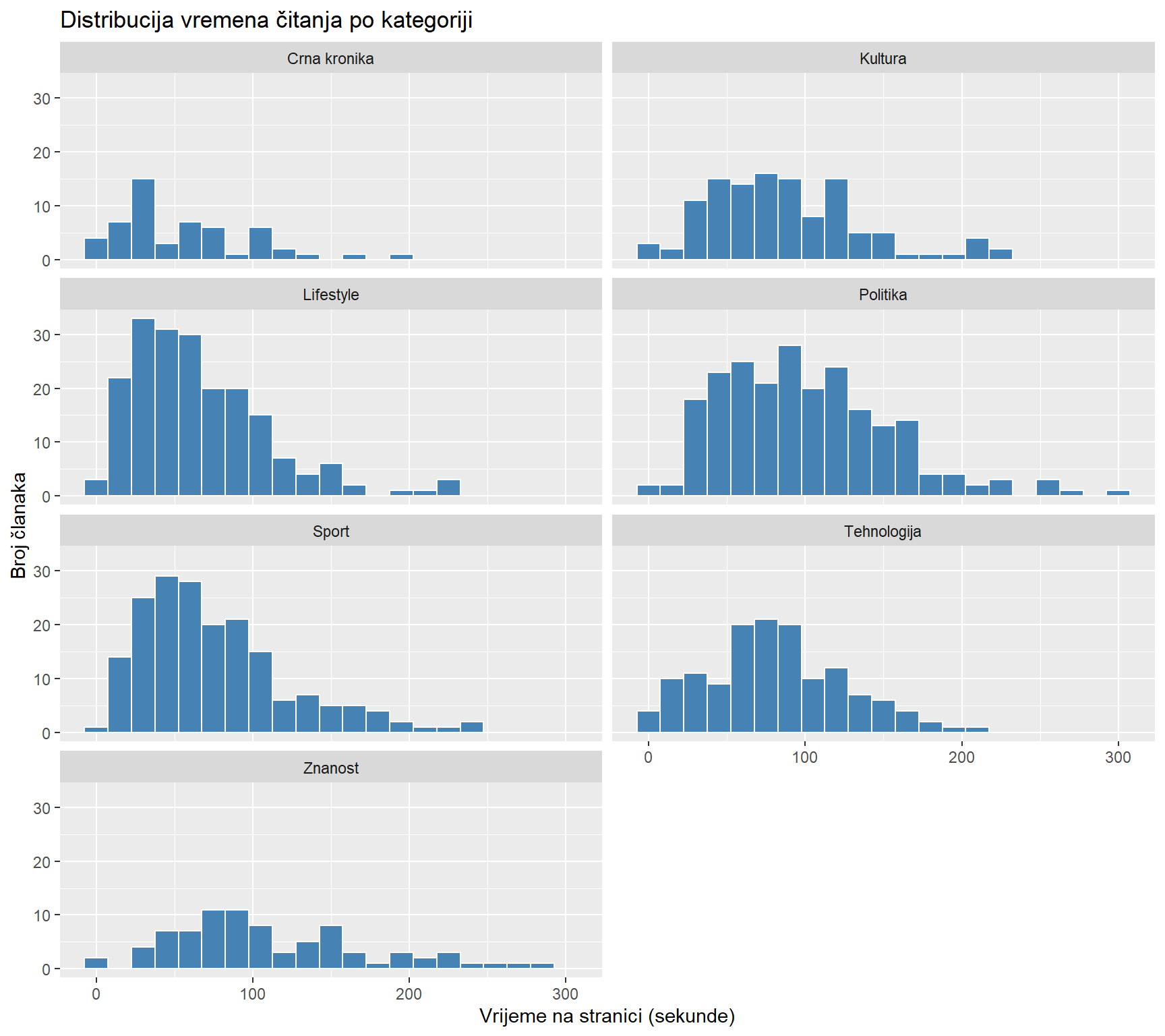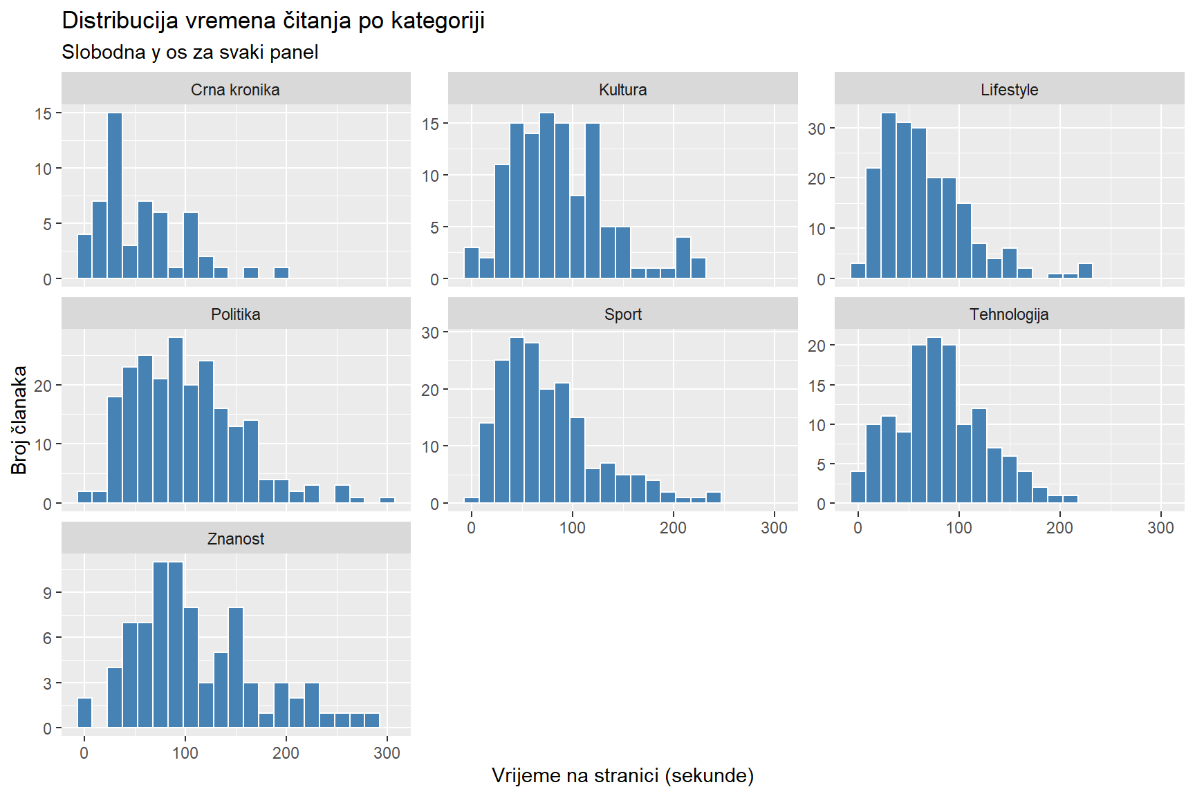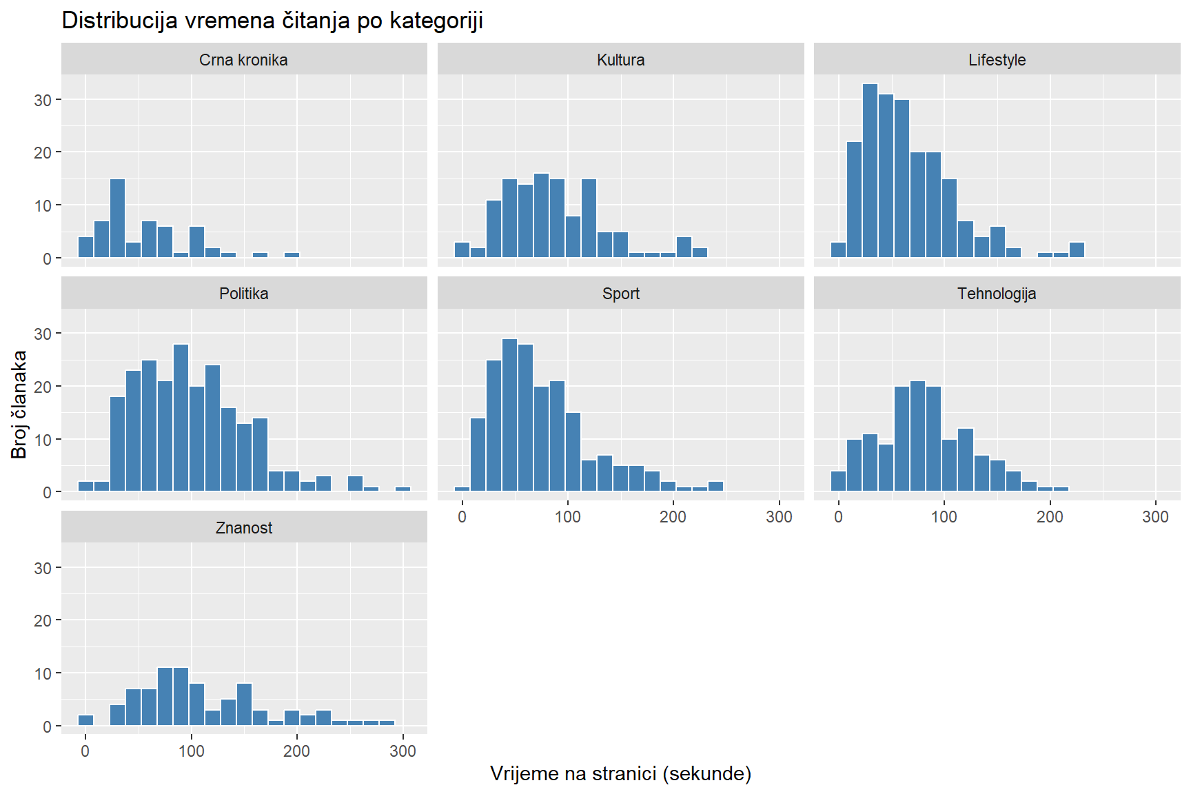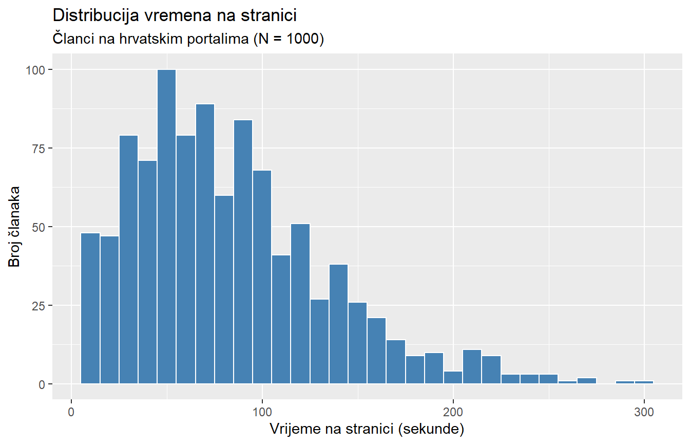 Ista logika vrijedi za svaku analizu koju ćete raditi kao komunikolozi. Recimo da vam netko kaže “prosječno vrijeme čitanja članaka na našem portalu je 83 sekunde”. Zvuči informativno. Ali to vam ne govori je li distribucija simetrična ili iskrivljena. Možda većina čitatelja provede 30 sekundi, a nekolicina koja čita detaljno diže prosjek. Ili možda postoje dva jasna klastera — oni koji odmah odu (bounce) i oni koji čitaju do kraja. Histogram bi to pokazao u sekundi. Broj sam po sebi ne može.