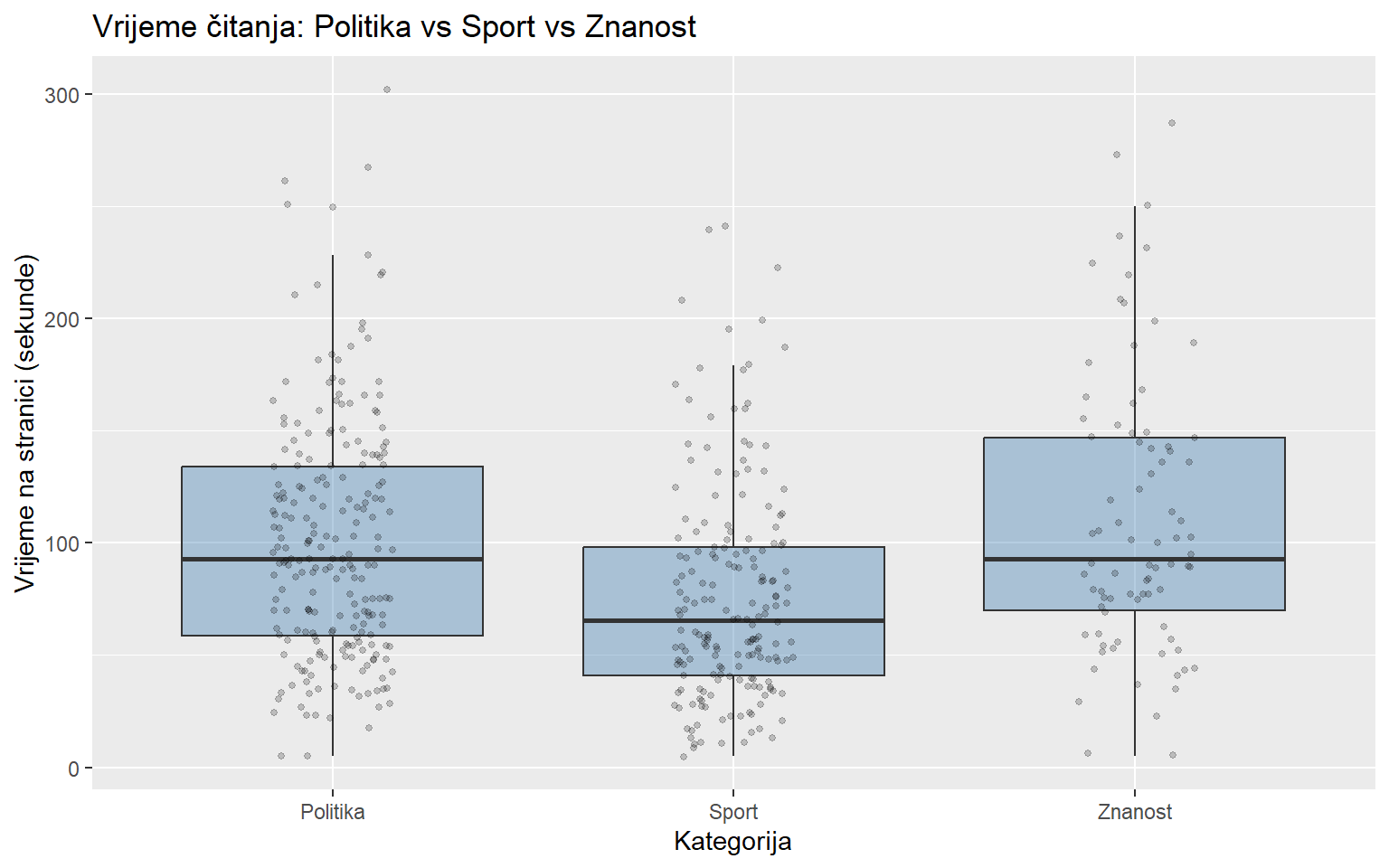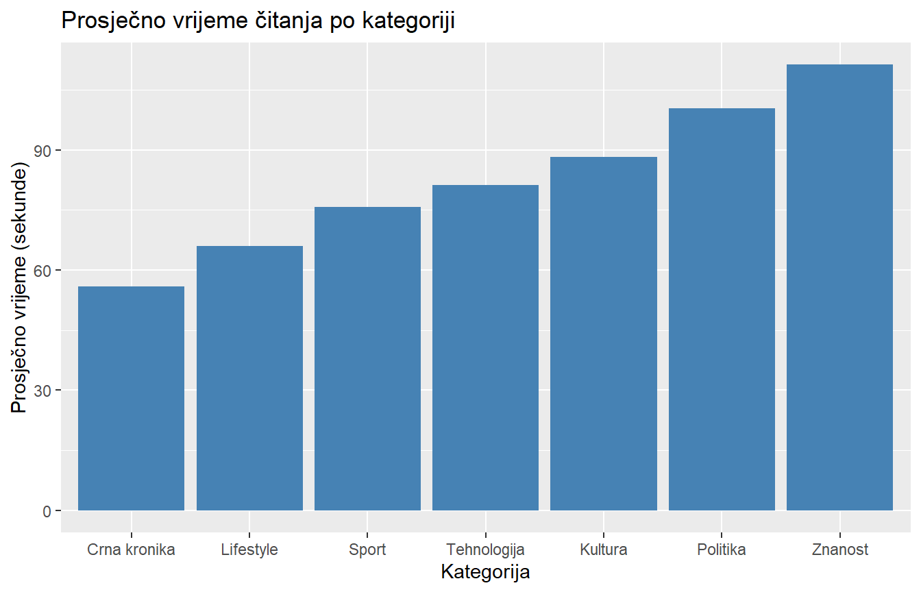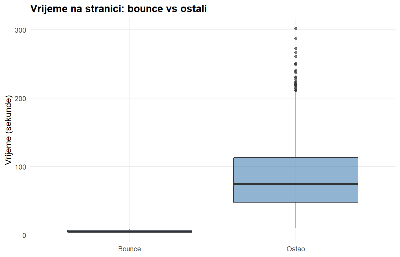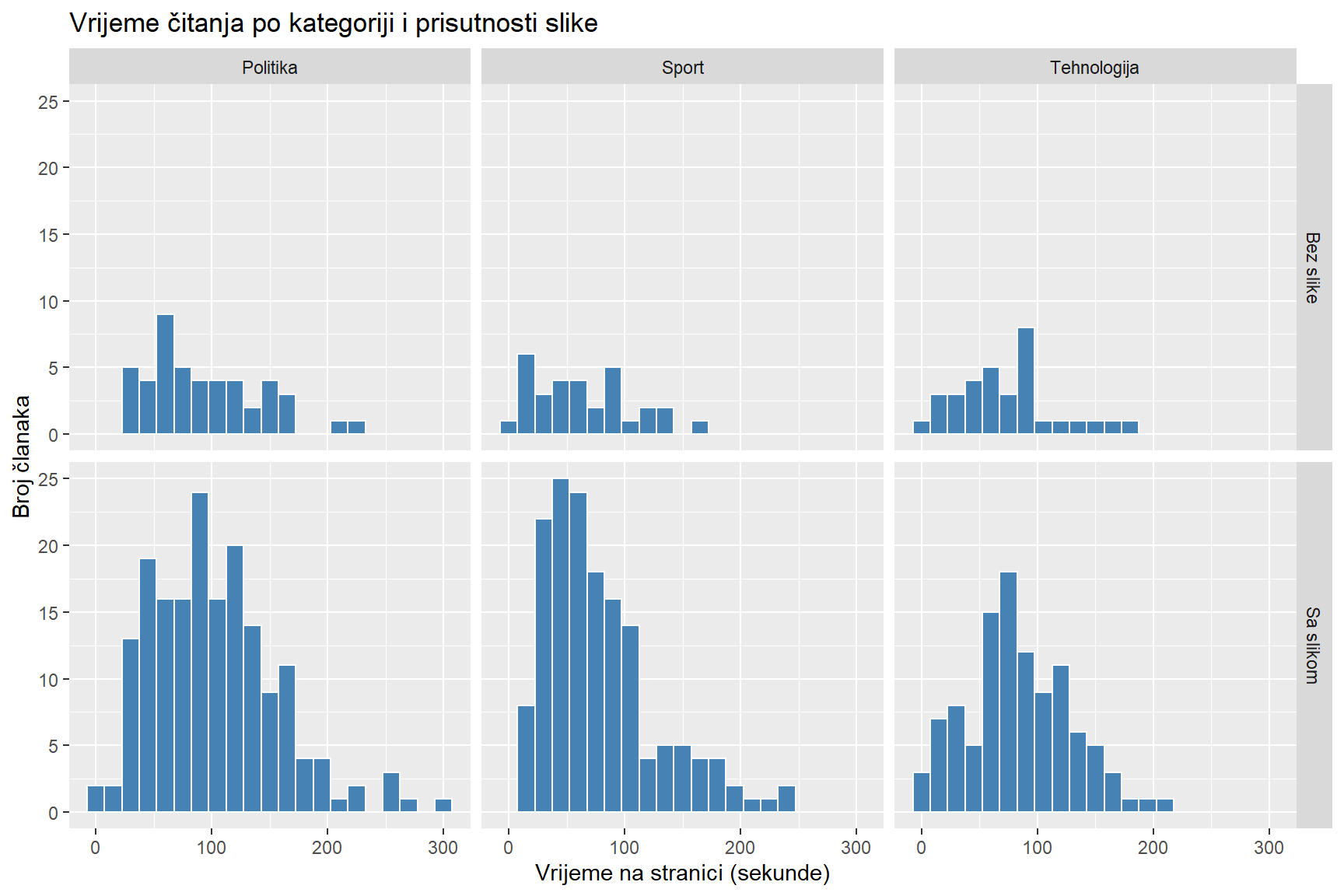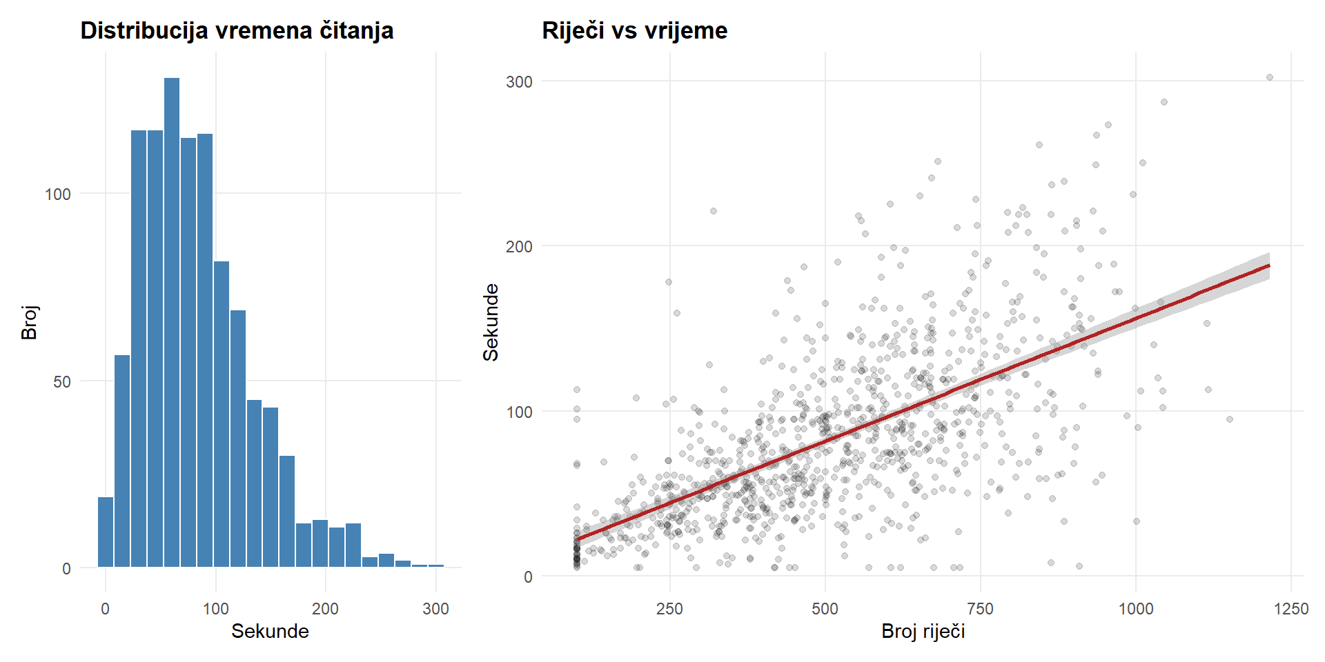 Ista logika vrijedi za svaku analizu koju ćete raditi kao komunikolozi. Recimo da vam netko kaže “prosječno vrijeme čitanja članaka na našem portalu je 83 sekunde”. Zvuči informativno. Ali to vam ne govori je li distribucija simetrična ili iskrivljena. Možda većina čitatelja provede 30 sekundi, a nekolicina koja čita detaljno diže prosjek. Ili možda postoje dva jasna klastera — oni koji odmah odu (bounce) i oni koji čitaju do kraja. Histogram bi to pokazao u sekundi. Broj sam po sebi ne može.