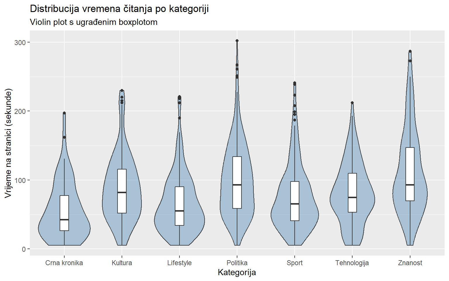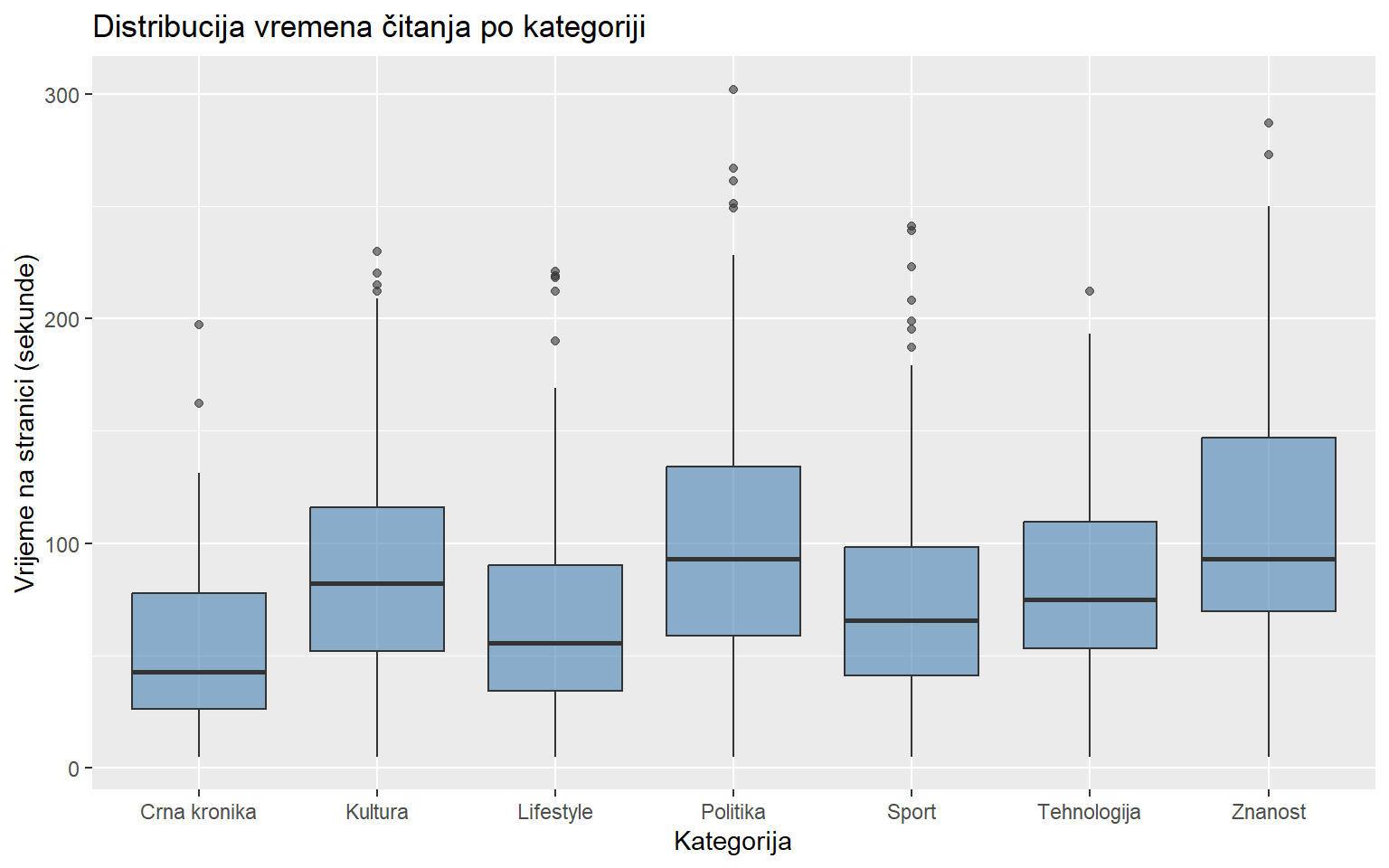 Distribucija je desno iskrivljena (pozitivan skew), što je tipično za metriku angažmana. Većina članaka ima relativno kratko vrijeme čitanja, ali postoji dugačak rep članaka s izuzetno dugim vremenom čitanja.