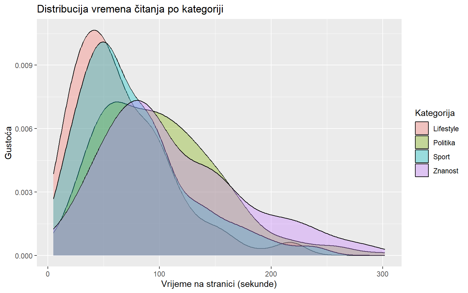 Recimo da želimo usporediti distribuciju vremena čitanja između različitih kategorija članaka. Histogram bi bio nepregledan s pet ili više preklopljenih boja, ali graf gustoće radi dobro.