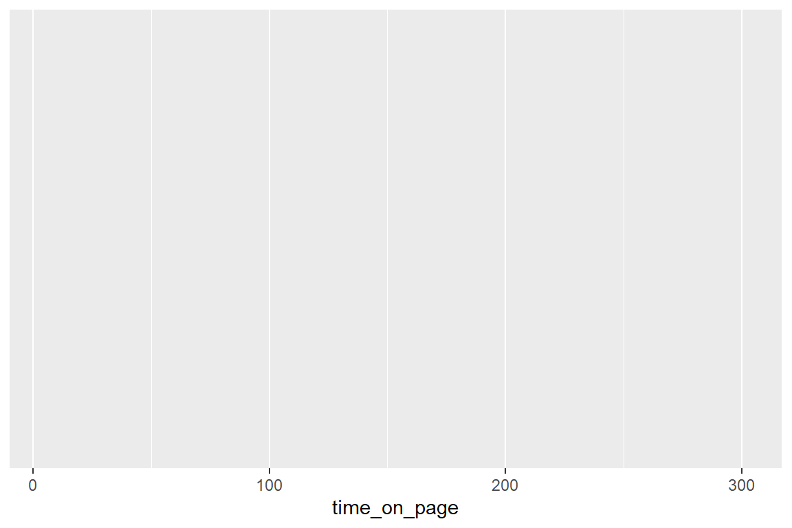 Ovaj kod kreira prazan graf. Definirali smo podatke (clanci) i jednu estetiku (varijabla time_on_page na x osi), ali nismo rekli ggplotu KAKO da prikaže te podatke (nismo dodali geometriju). Rezultat je prazan koordinatni sustav s ispravno postavljenom x osi. Ggplot zna raspon varijable i pripremio je platno, ali čeka da mu kažemo što da nacrta.