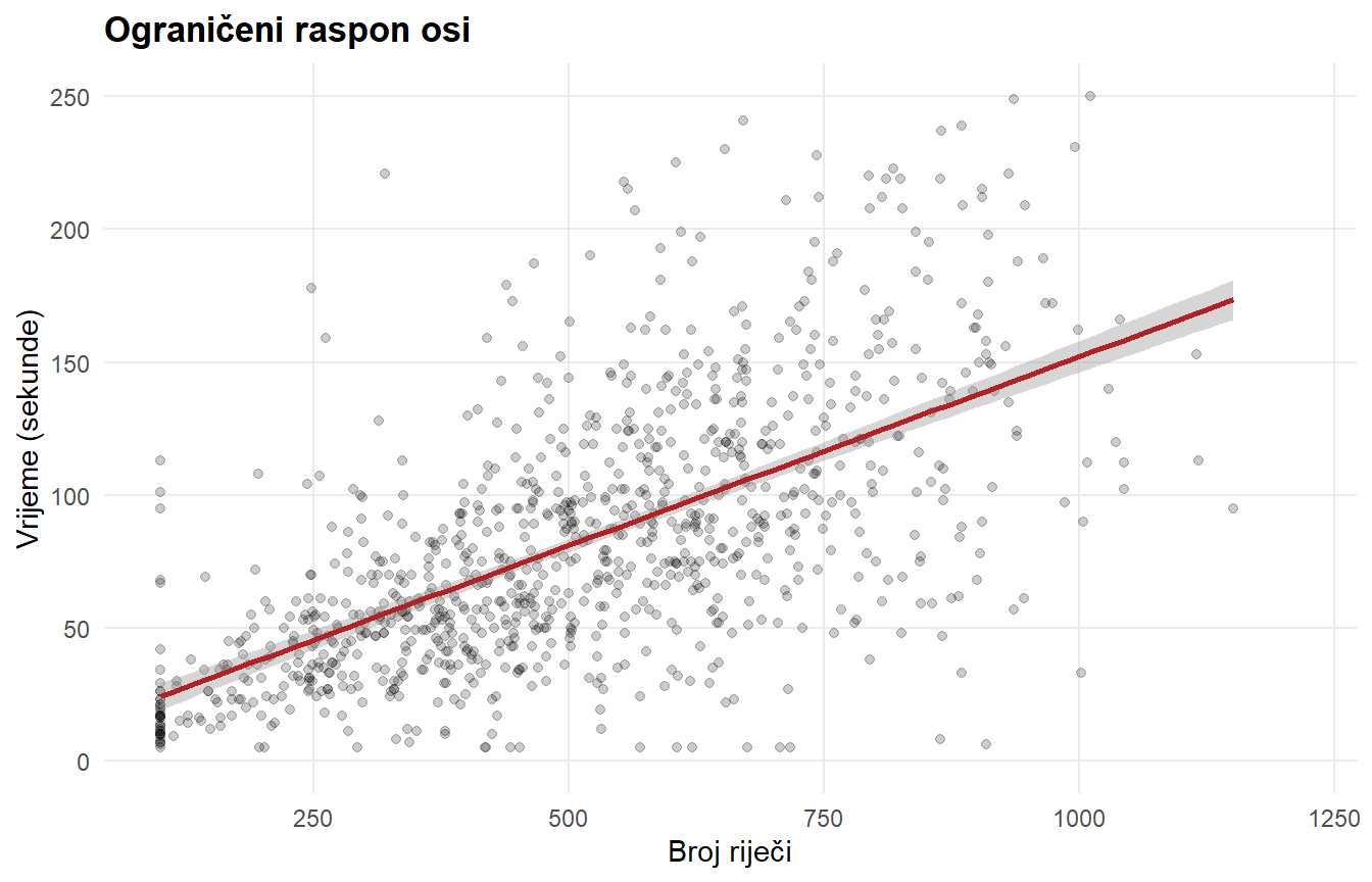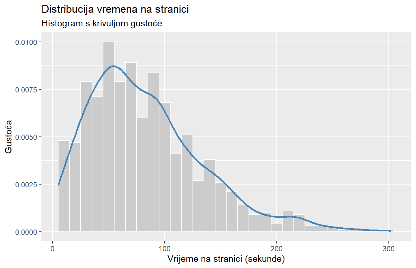 Ovdje smo napravili nekoliko poboljšanja. Argument binwidth = 10 postavlja širinu svakog bina na 10 sekundi, što daje jasniju sliku od defaultnih 30 binova. fill = "steelblue" boja ispunu stupaca, a color = "white" crta bijeli rub između stupaca za bolju čitljivost. Funkcija labs() dodaje naslov, podnaslov i oznake osi.