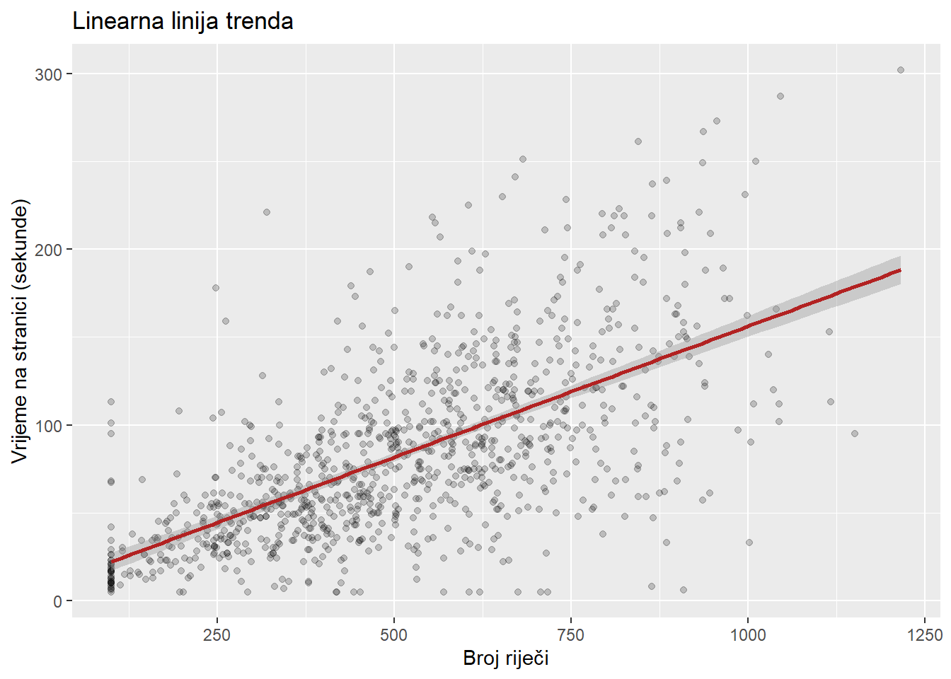 Geometrija za liniju trenda. Default LOESS, method = "lm" za linearnu. |