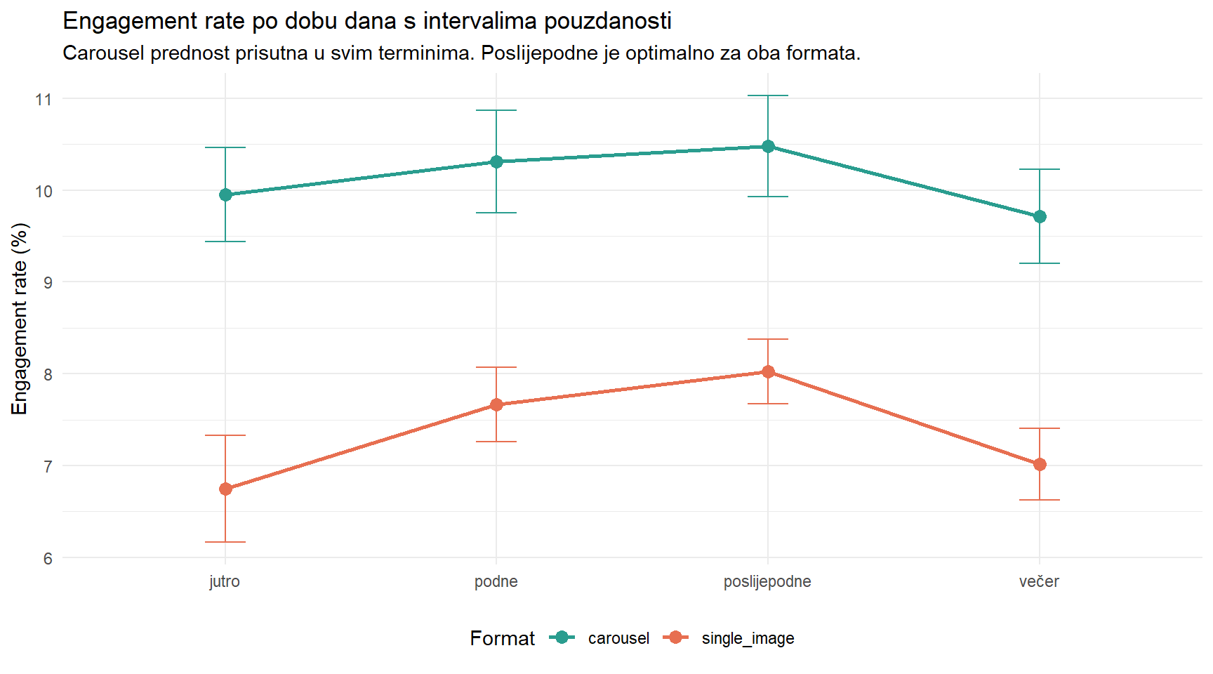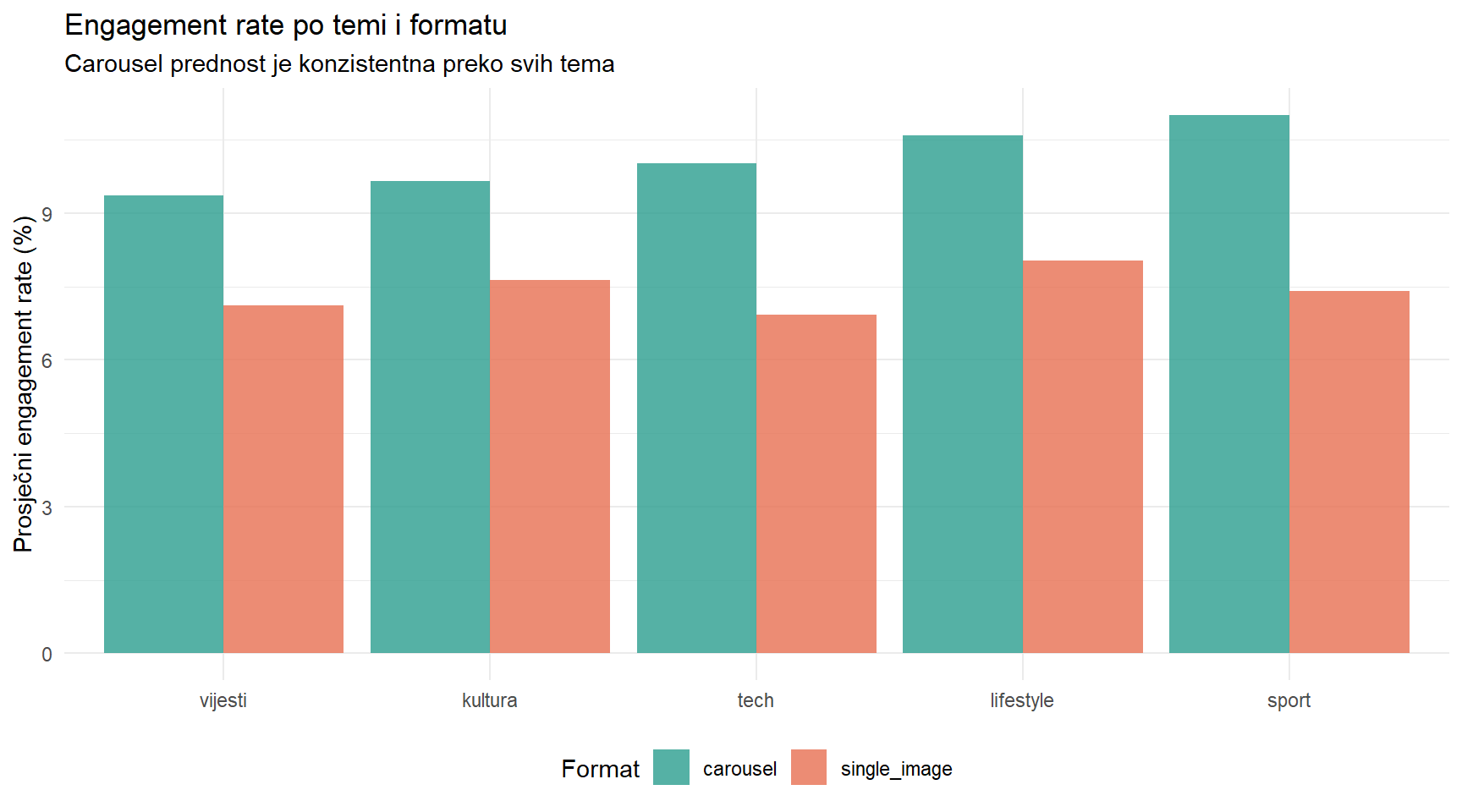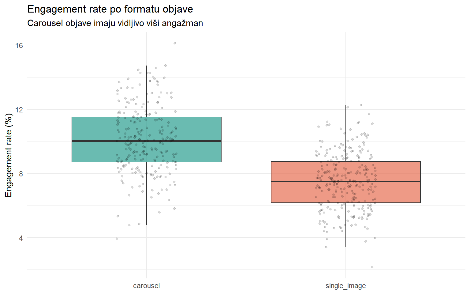 Radite kao analitičarka u redakciji medijske kuće. Vaš Instagram profil objavljuje sadržaj u dva formata — carousel (objave s više slika koje korisnik lista) i obične slike (single image). Urednica vas jednog jutra zaustavi u hodniku i pita: “Imam osjećaj da carousel objave generiraju više angažmana. Imamo li za to dokaz?”