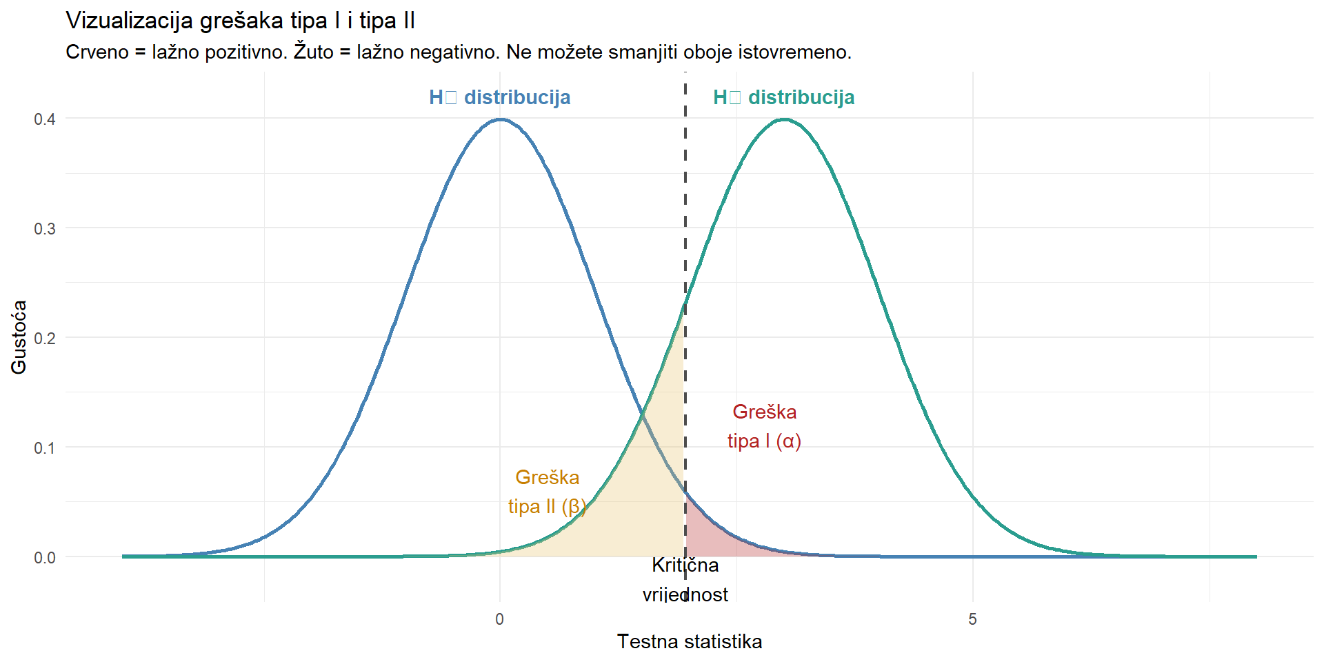 | Greška tipa II | Ne odbacimo H₀ kad je lažna. Propušteni pravi učinak. Vjerojatnost = β. |