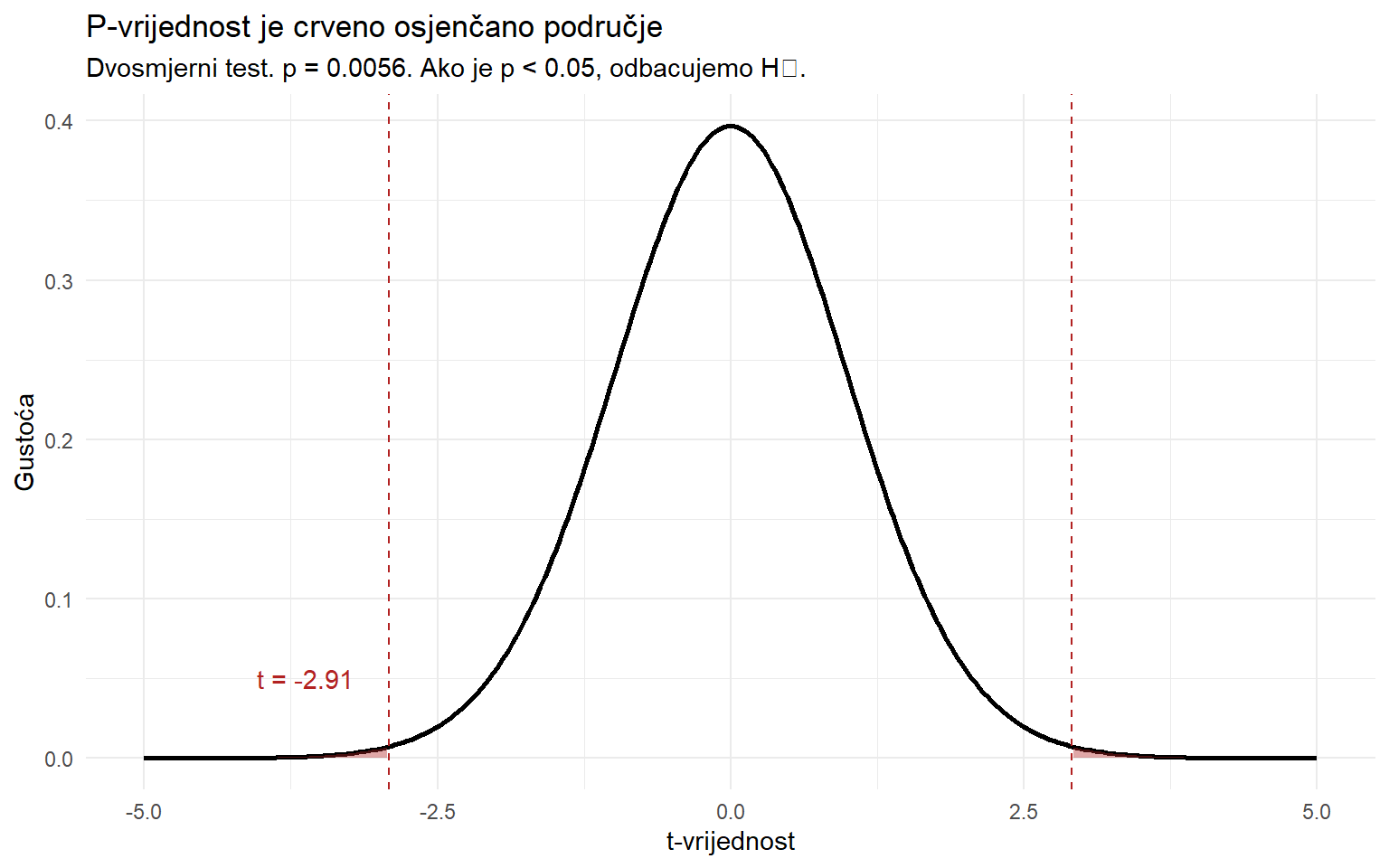Testna statistika t je negativna jer je prosjek uzorka manji od pretpostavljene vrijednosti. Apsolutna vrijednost |t| govori koliko standardnih pogrešaka je prosjek udaljen od μ₀. Što je ta udaljenost veća, to su jači dokazi protiv H₀.
