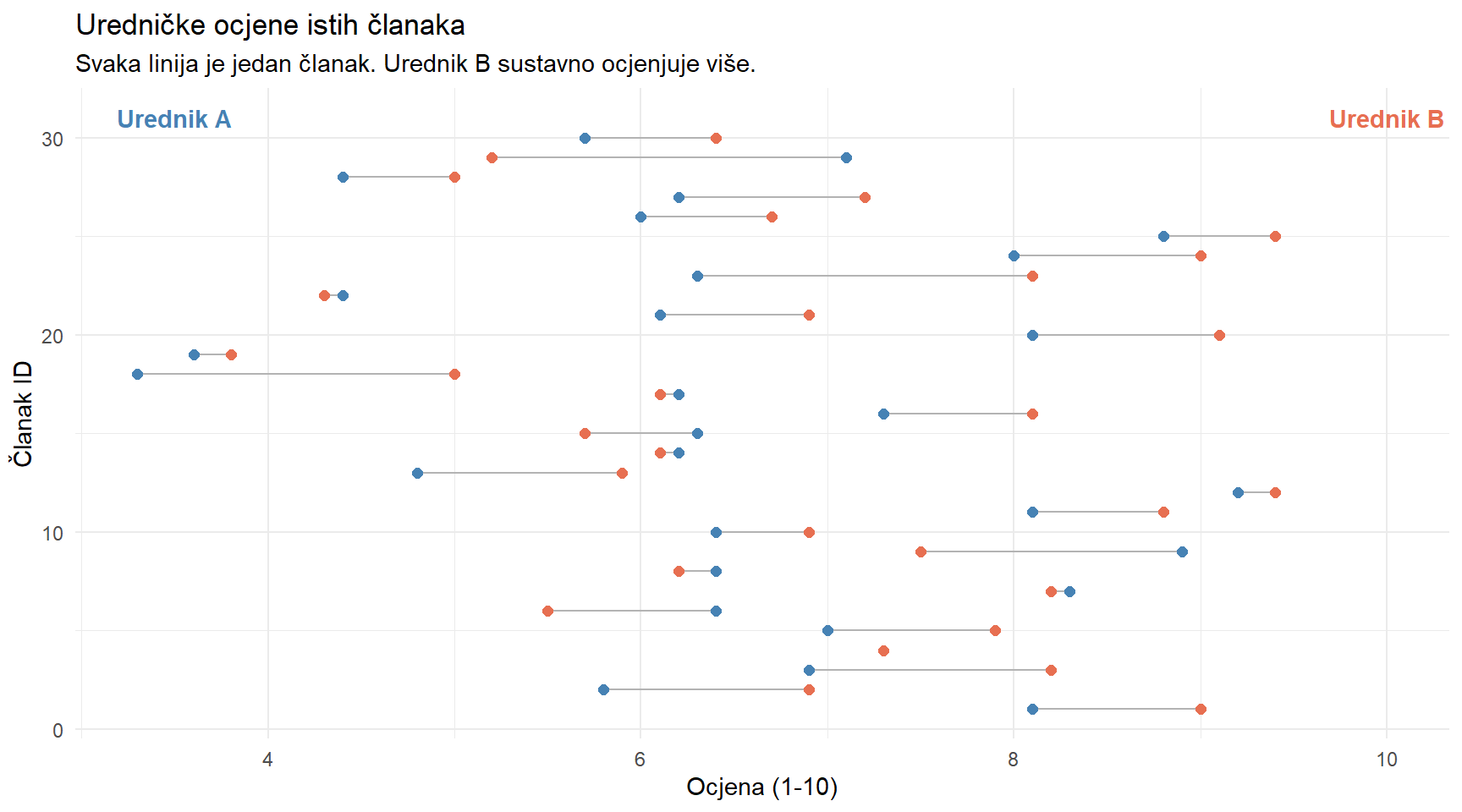 "Upareni", "Iste jedinice, dva mjerenja", "t.test(x, y, paired = TRUE)", "Ocjene istih članaka od 2 urednika"