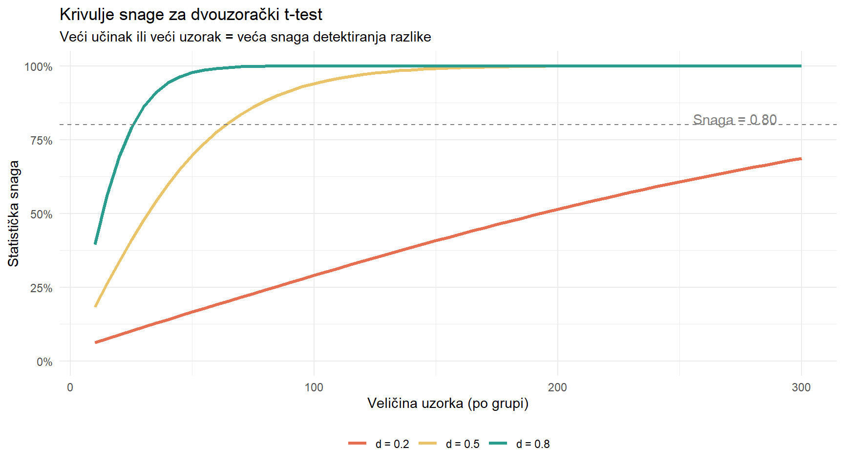 Planirajte uzorak unaprijed. power.t.test() računa koliko podataka trebate za zadanu snagu i veličinu učinka. Ovo radite prije prikupljanja podataka.