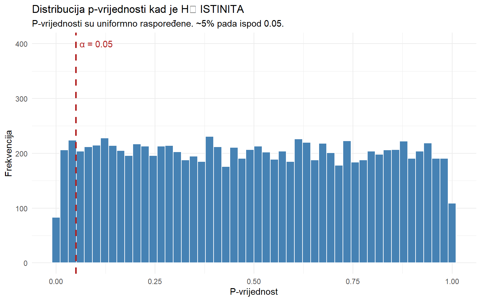 cat("Od 20 testova (svi H₀ istiniti):\n")Od 20 testova (svi H₀ istiniti):
