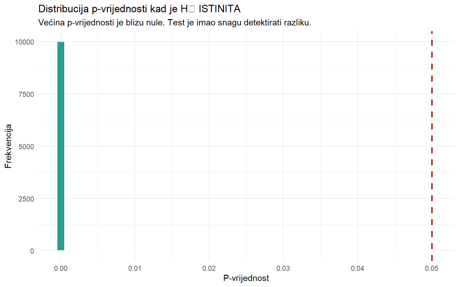 | P-vrijednost | Vjerojatnost podataka (ili ekstremnijih) pod pretpostavkom da je H₀ istinita. |