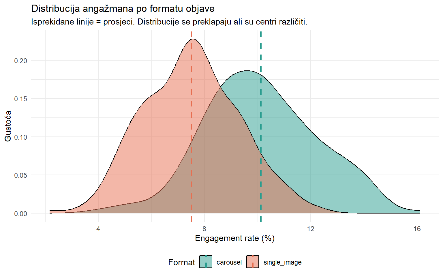 Vi znate odgovoriti na to pitanje. Otvarate podatke i gledate prosjeke — carousel objave imaju engagement rate od 10.1%, a obične slike 7.5%. Razlika postoji. Ali urednica nije pitala “je li prosjek različit u uzorku” — ona pita “možemo li se osloniti na tu razliku kad planiramo strategiju.” A to je sasvim drugo pitanje. Možda je razlika realna i stabilna. Ali možda je samo artefakt — slučajni šum u podacima koji bi nestao kad bismo ponovili usporedbu na novom skupu objava.