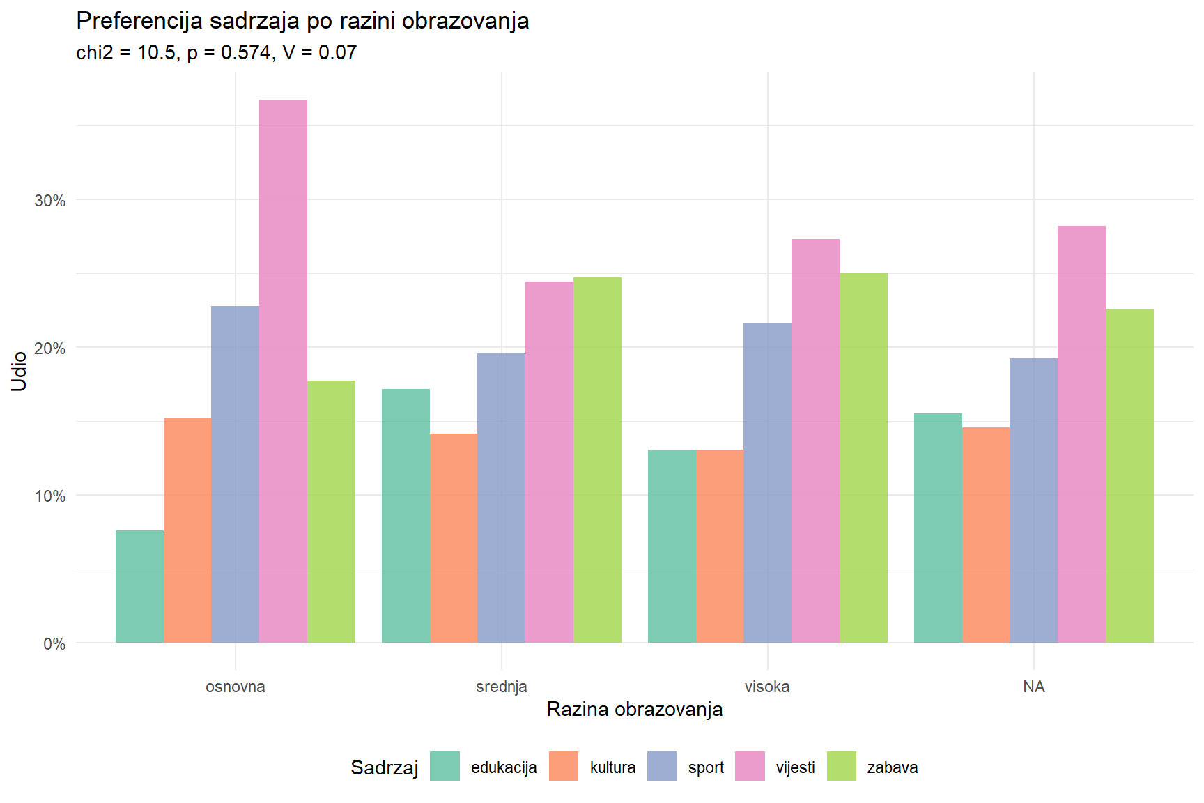 Proporcije govore jasnu priču. Među osobama 18-29, 43% preferira streaming i 27% web portale. Među osobama 60+, 47% preferira TV i 23% radio. Obrazac je očit — mlađi preferiraju digitalne medije, stariji tradicionalne. Ali je li ovaj obrazac statistički značajan, ili bi mogao nastati čistim slučajem u uzorku od 800 ljudi?