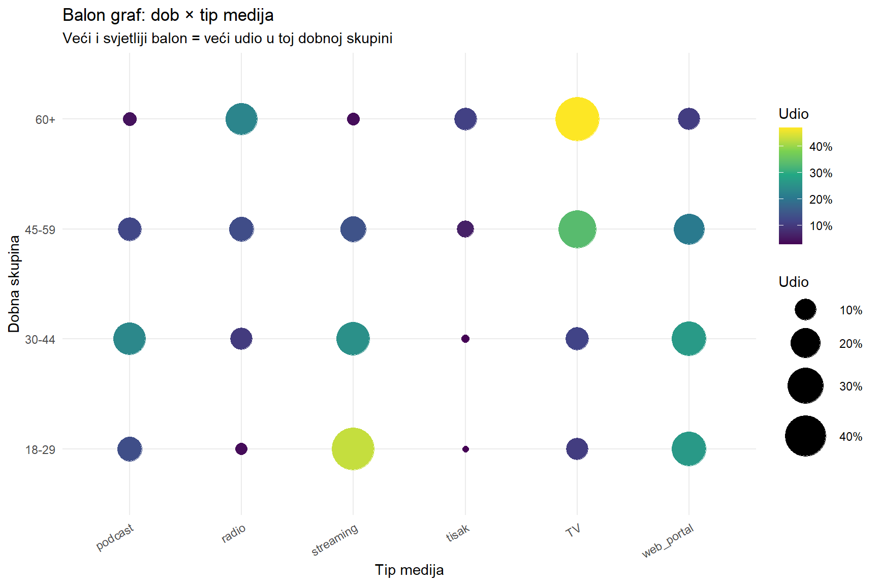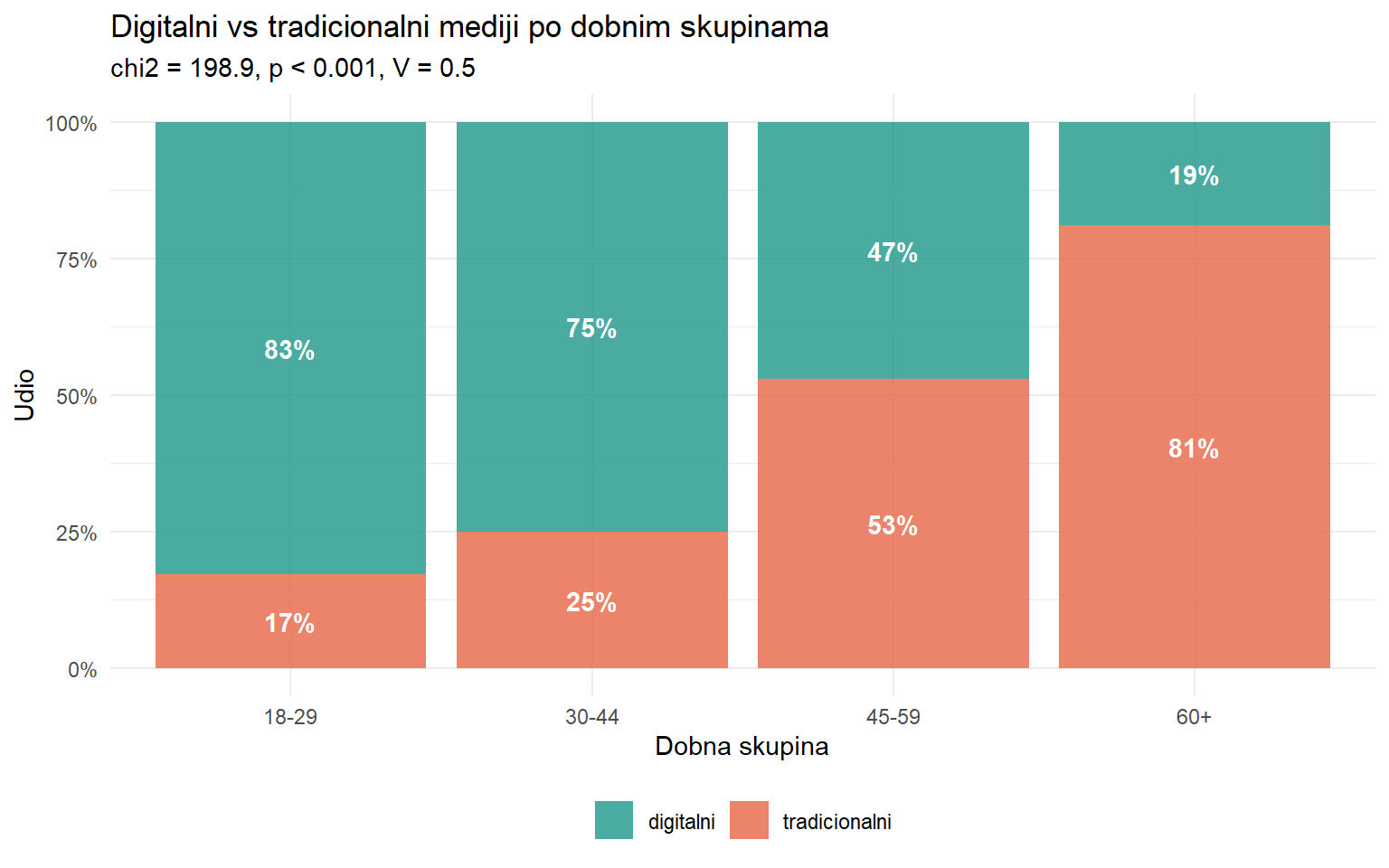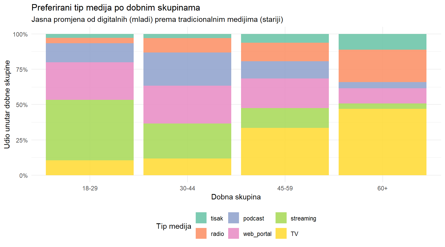 subtitle = "Jasna promjena od digitalnih (mladi) prema tradicionalnim medijima (stariji)",