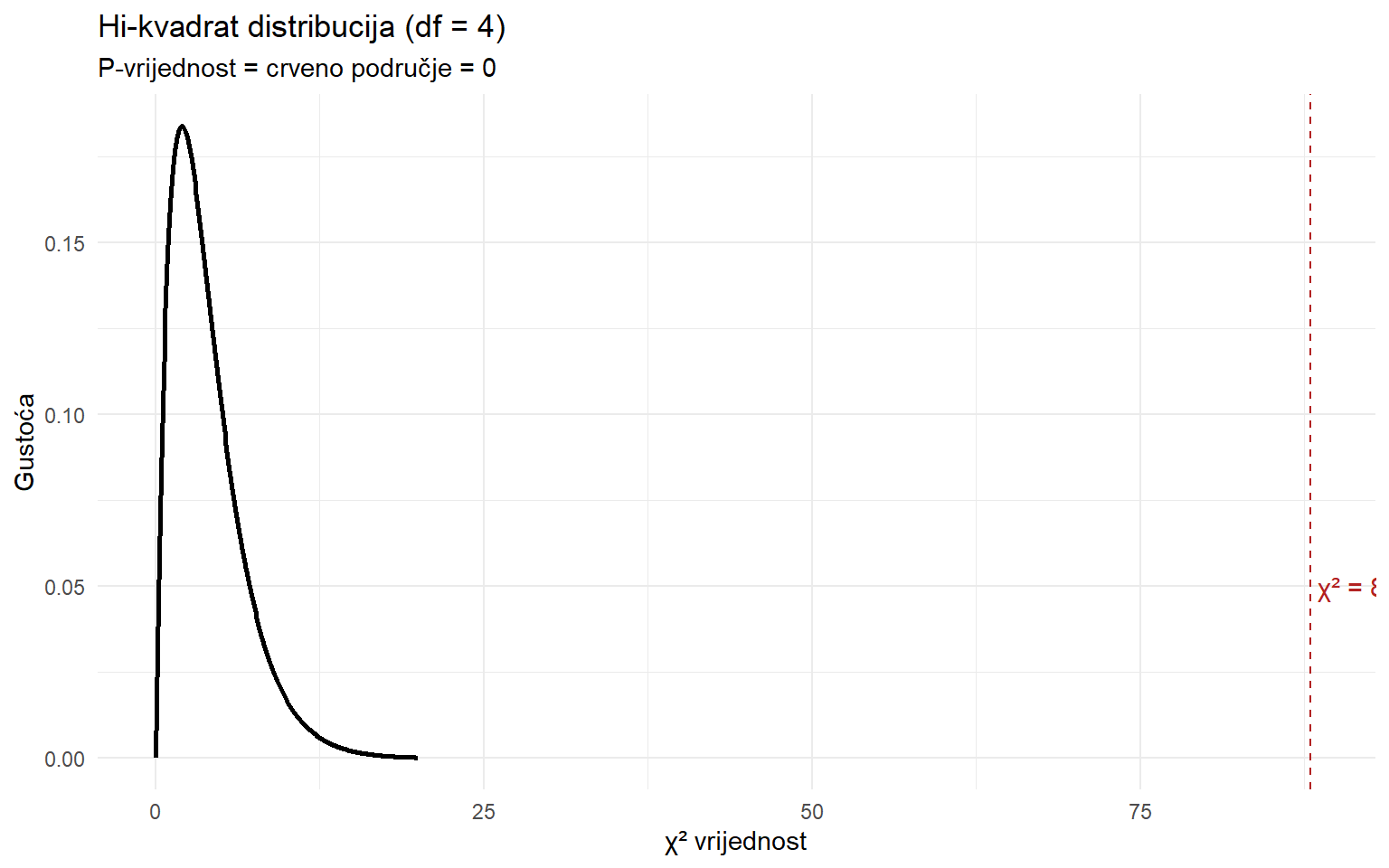 \[H_0: \text{Distribucija regija u uzorku odgovara uniformnoj distribuciji (20\% svaka)}\] \[H_1: \text{Distribucija regija nije uniformna}\]