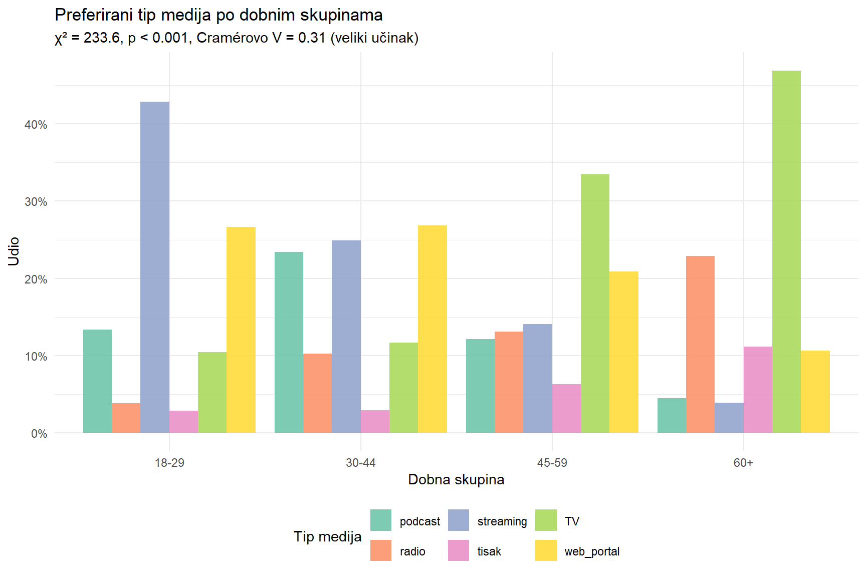 Ključne kategoričke varijable su age_group (četiri kategorije poput 18-29, 30-44, 45-59, 60+) i media_type (šest kategorija — streaming, TV, web portal, radio, tisak, podcast). Temeljno pitanje za upravu glasi — postoji li veza između dobi i preferiranog medija? I ako postoji, koliko je jaka?