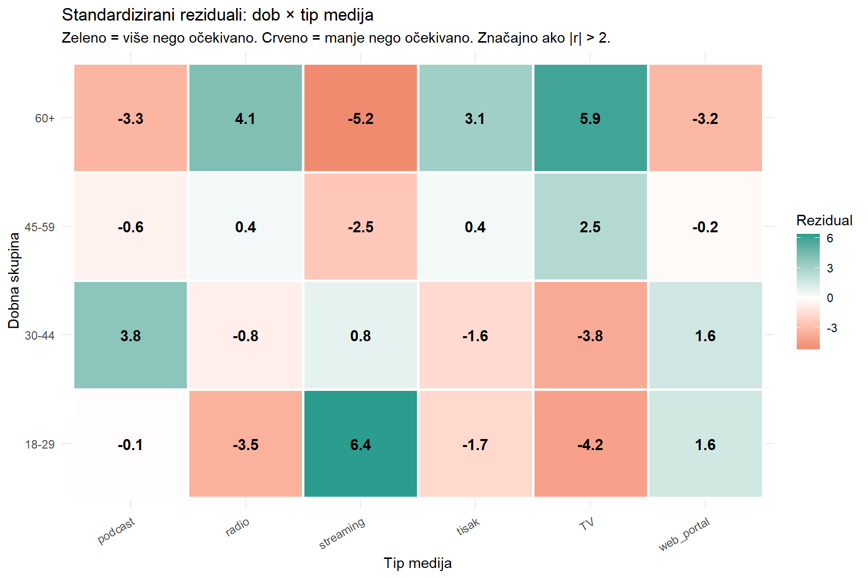 Reziduali govore gdje je veza najjača. Ukupni χ² kaže da veza postoji. Standardizirani reziduali s |r| > 2 identificiraju specifične ćelije. Uvijek ih izvijestite — jer urednica ne želi znati samo “postoji veza”, nego kakva je.