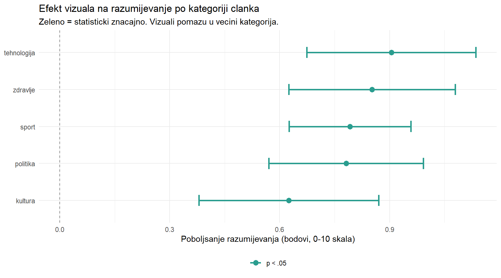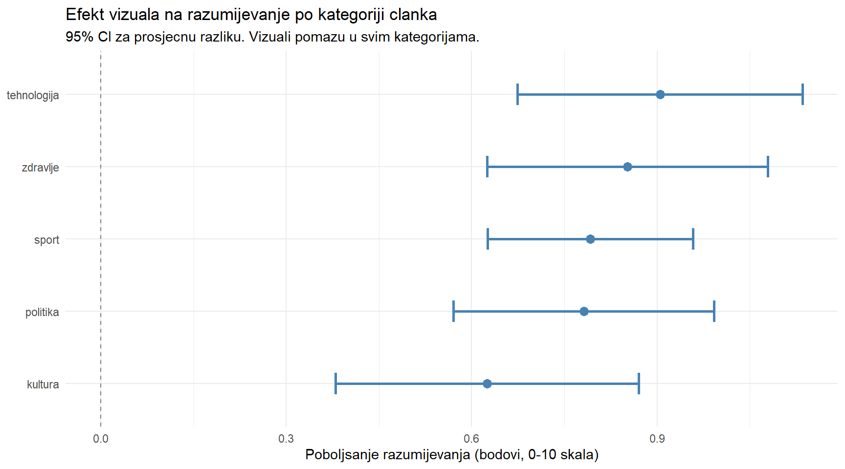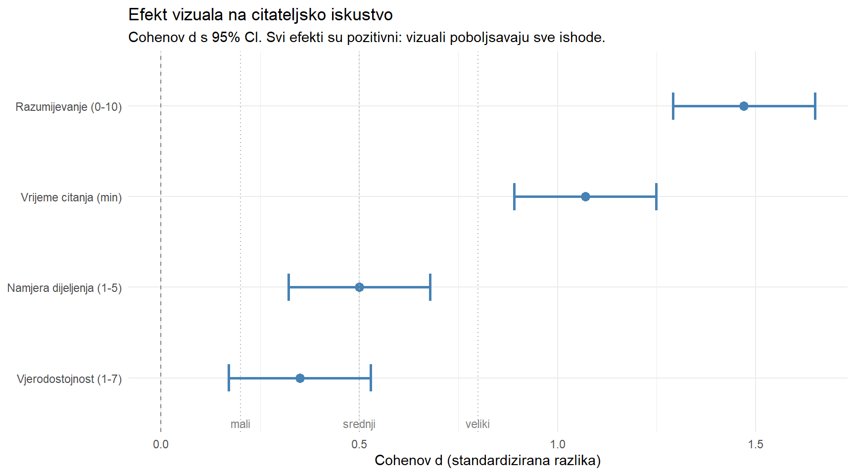 Zamislite da radite kao istraživačica u uredništvu jednog web portala. Portal objavljuje članke o politici, zdravlju, tehnologiji, sportu i kulturi — uglavnom tekstualne, s ponekom fotografijom za vizualni odmor. Uredništvo razmišlja o velikom redizajnu. Žele dodati infografike, podatkovne vizualizacije, ilustracije i interaktivne elemente. Ideja zvuči privlačno, ali glavni urednik nije uvjeren. “Vizuali koštaju,” kaže. “Trebam dokaze da stvarno poboljšavaju čitateljsko iskustvo.”