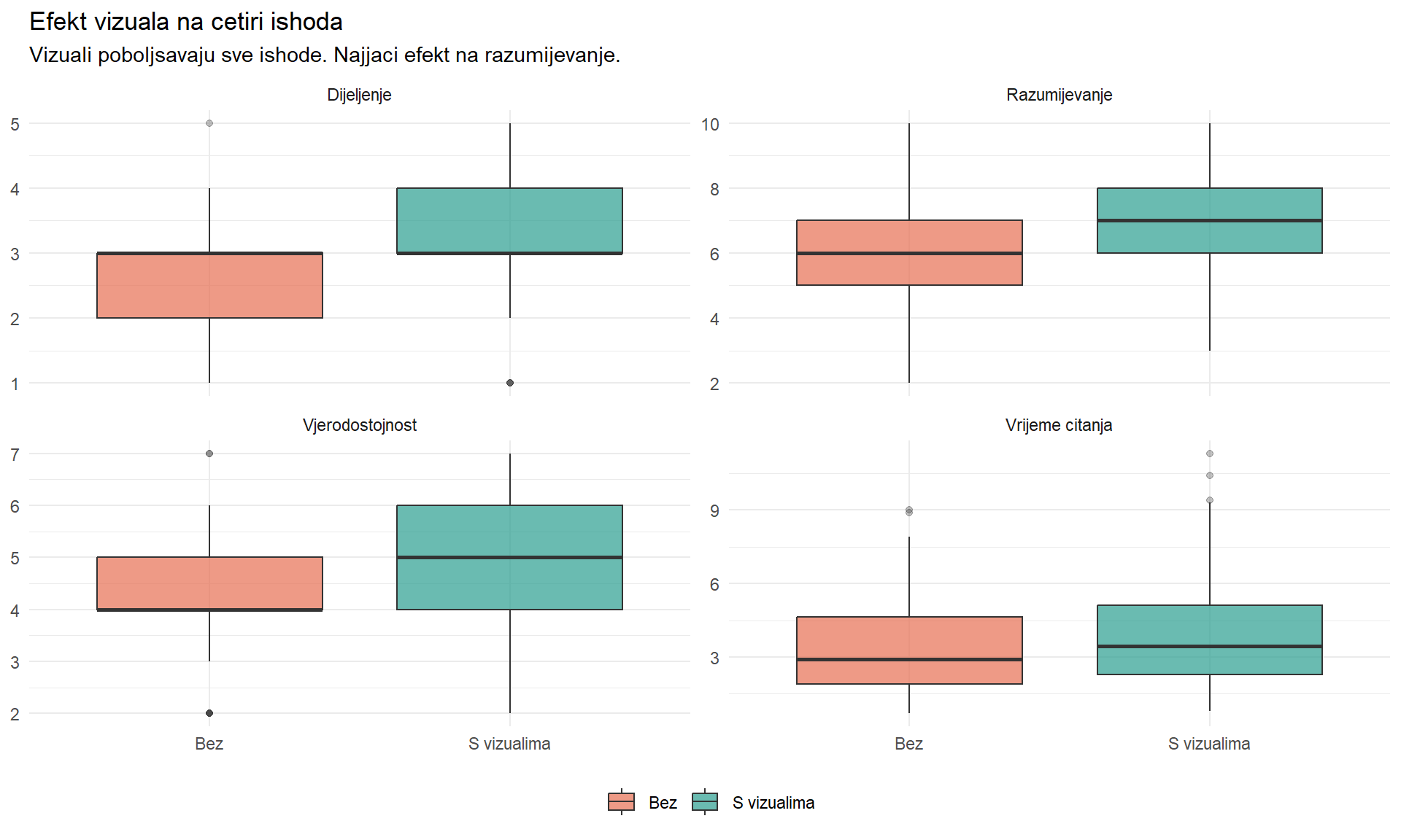 cat(" Efekt vizuala na razumijevanje je konzistentan preko svih\n") Efekt vizuala na razumijevanje je konzistentan preko svih