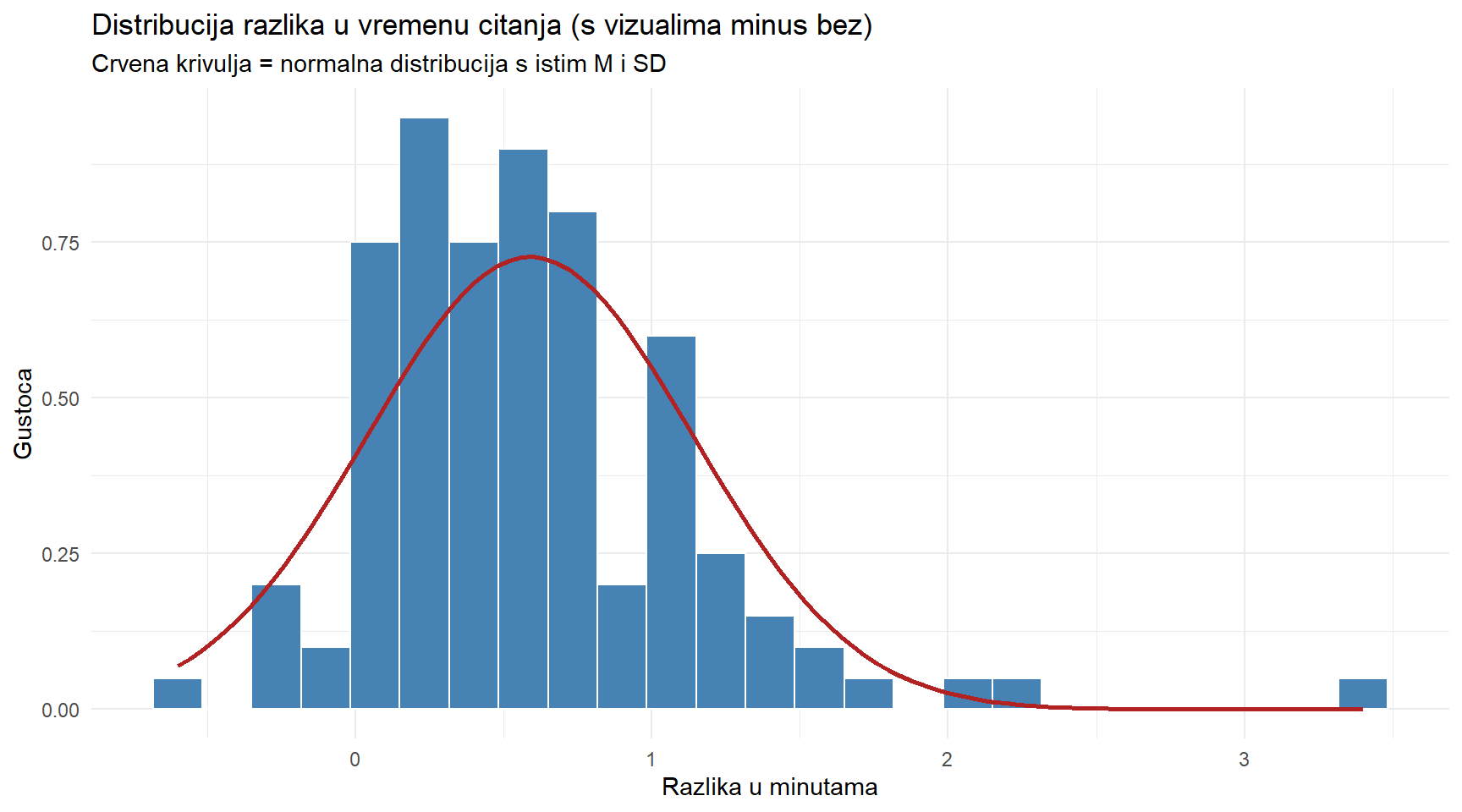 cat(" Normalnost razlika: Shapiro-Wilk prolazi za vrijeme citanja\n") Normalnost razlika: Shapiro-Wilk prolazi za vrijeme citanja