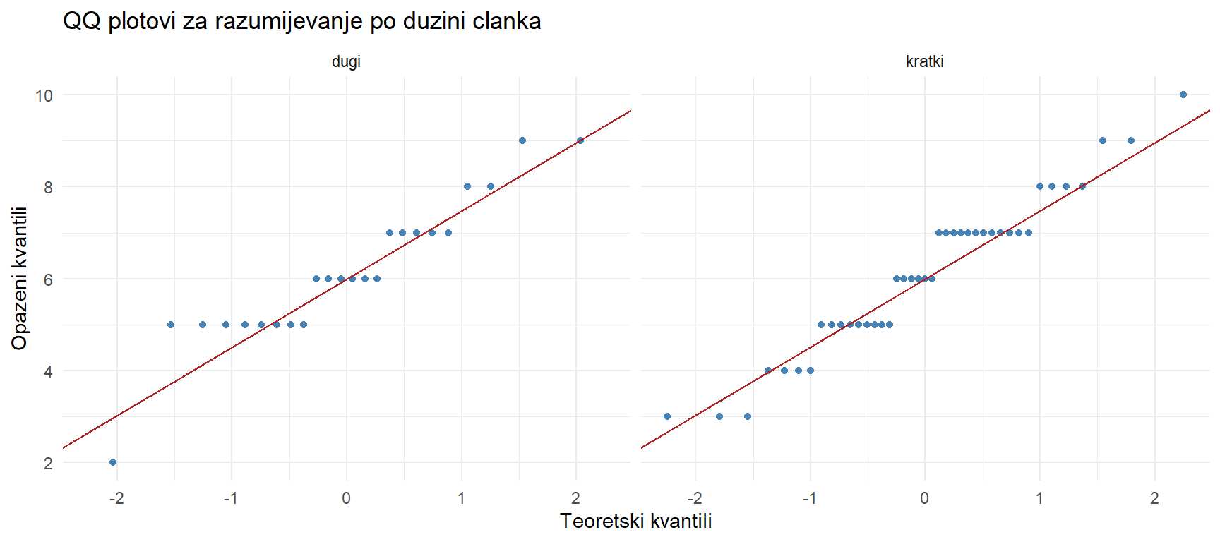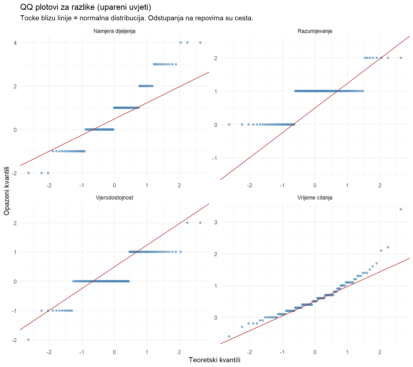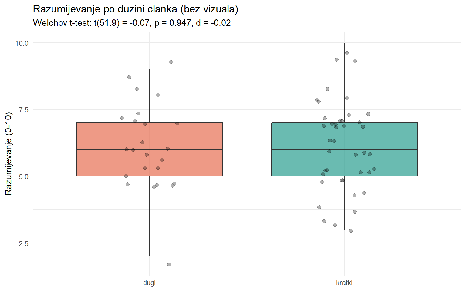 Na prvi pogled, brojke govore u prilog vizualima — članci s vizualnim elementima imaju duže vrijeme čitanja, bolje razumijevanje i višu namjeru dijeljenja. Ali “na prvi pogled” nije dovoljno za istraživačicu koja zna što radi. Prije nego što izvučemo ikakve zaključke, moramo provjeriti jesu li pretpostavke statističkog testa koje namjeravamo koristiti uopće zadovoljene.