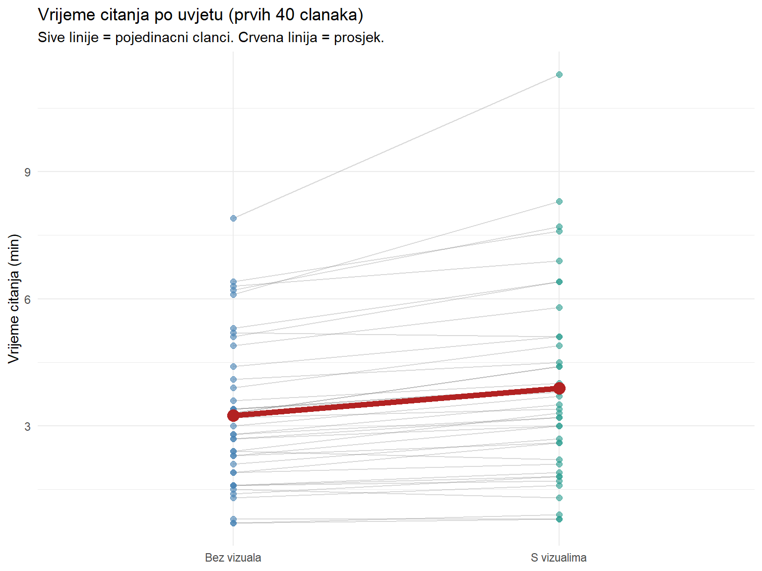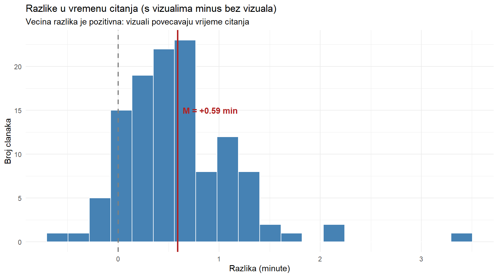 I tako dobijete zadatak — osmisliti eksperiment koji će odgovoriti na pitanje utječu li vizualni elementi na četiri ključna ishoda — vrijeme čitanja, razumijevanje sadržaja, namjeru dijeljenja i percipiranu vjerodostojnost. Odabrali ste 120 članaka i svaki prezentirali ispitanicima u dva uvjeta: jednom s vizualima, jednom bez. Budući da je svaki članak testiran u oba uvjeta, radi se o within-subjects dizajnu — a statistički alat koji vam treba za takvu usporedbu zove se upareni t-test.