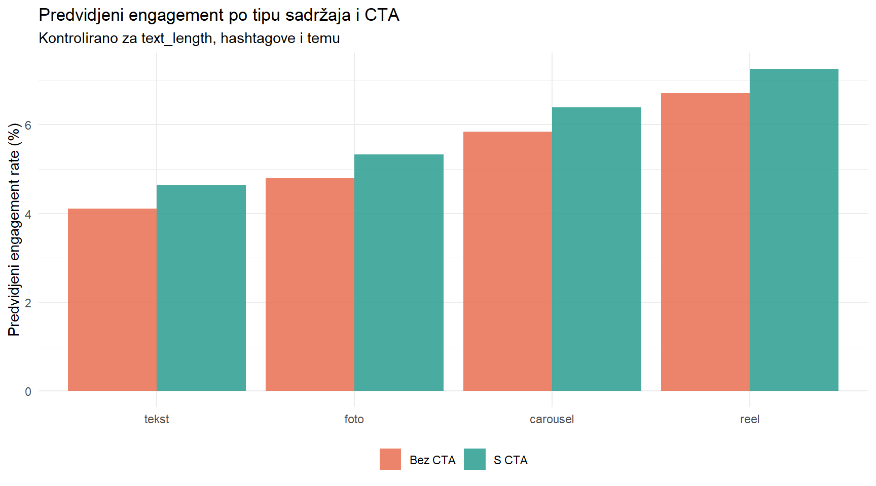 Provedena je višestruka linearna regresija s polinomnim članom za broj hashtagova kako bi se ispitali prediktori angažmana Instagram objava. Model je bio statistički značajan, F(11, 488) = 45.3, p < .001, R² = .505, prilagođeni R² = .494, objašnjavajući 49.4% varijabilnosti u engagement rateu. Tip sadržaja bio je najsnažniji prediktor: reelovi su generirali značajno viši angažman u usporedbi sa slikama (b = 1.52, p < .001). Odnos između broja hashtagova i angažmana bio je nelinearan (blinear = 0.18, p < .001; bkvadratni = -0.009, p < .001), s optimalnim brojem od oko 10 hashtagova. Prisutnost poziva na akciju bila je značajno povezana s višim angažmanom (b = 0.62, p < .001).