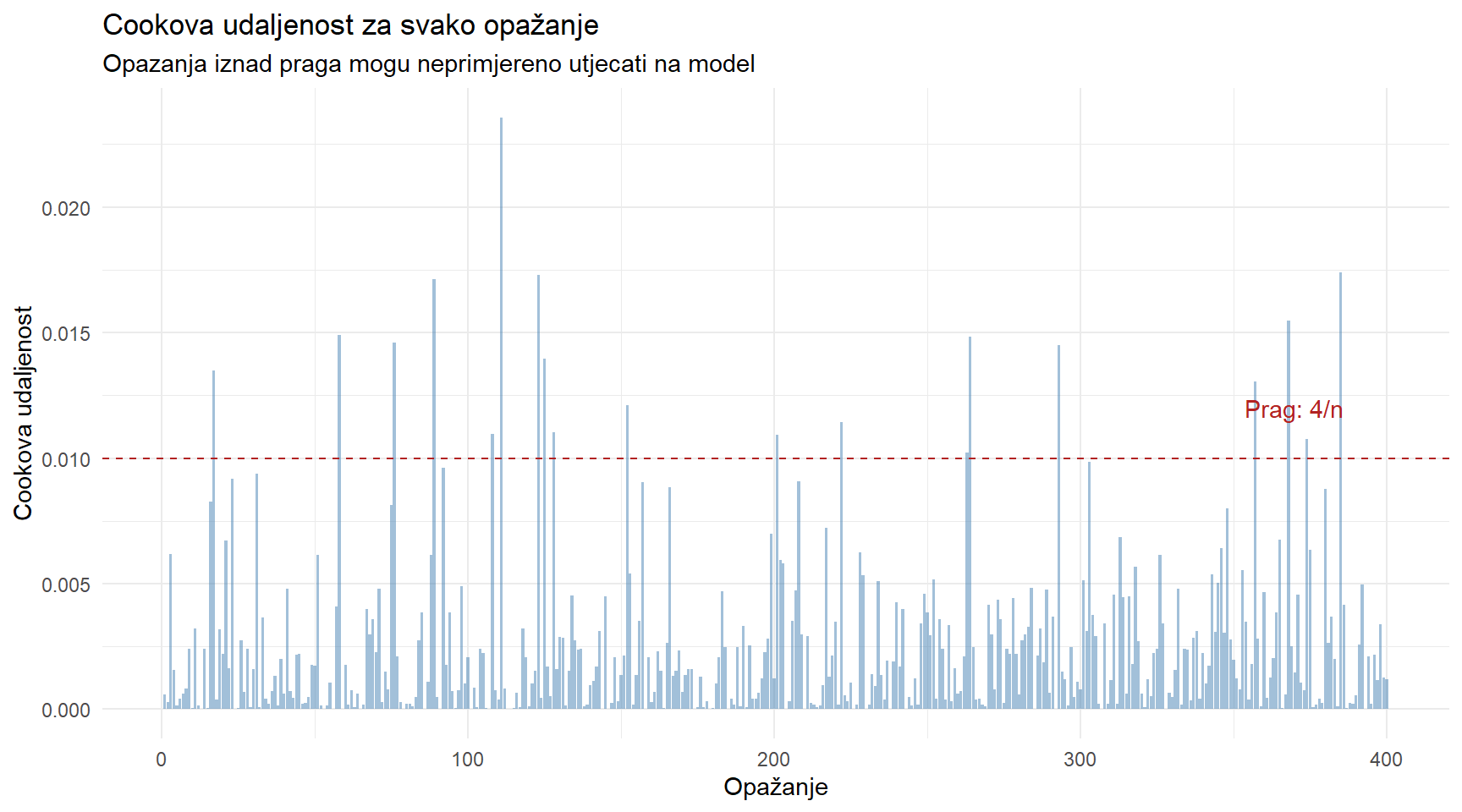 Cookova udaljenost identificira utjecajne točke. Prag: 4/n. Uvijek usporedite model s i bez utjecajnih točaka.
