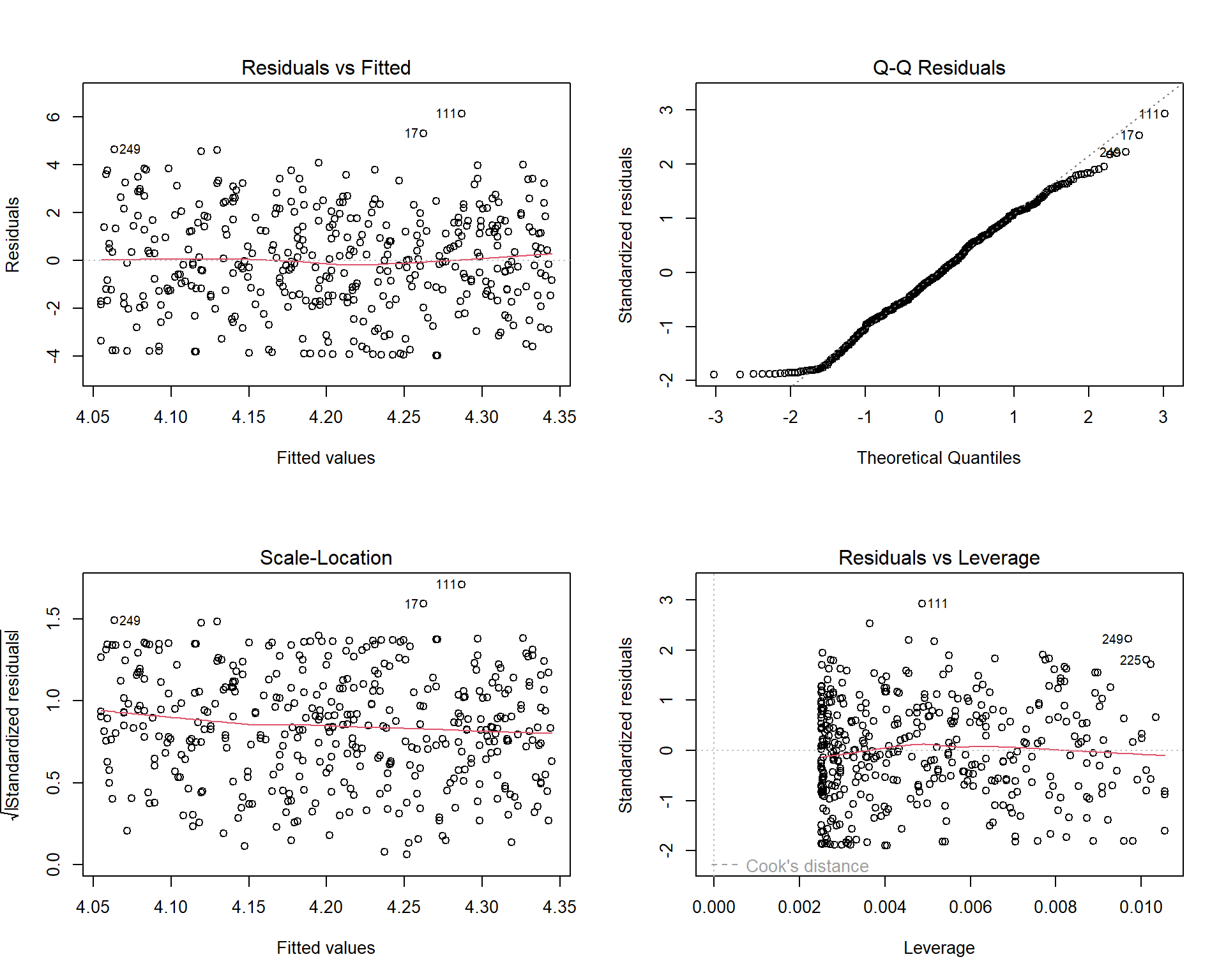Četiri pretpostavke (linearnost, nezavisnost, homoskedastičnost, normalnost reziduala) provjeravate dijagnostičkim grafovima pomoću funkcije